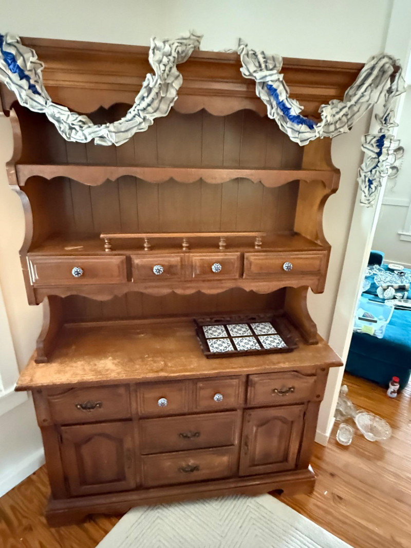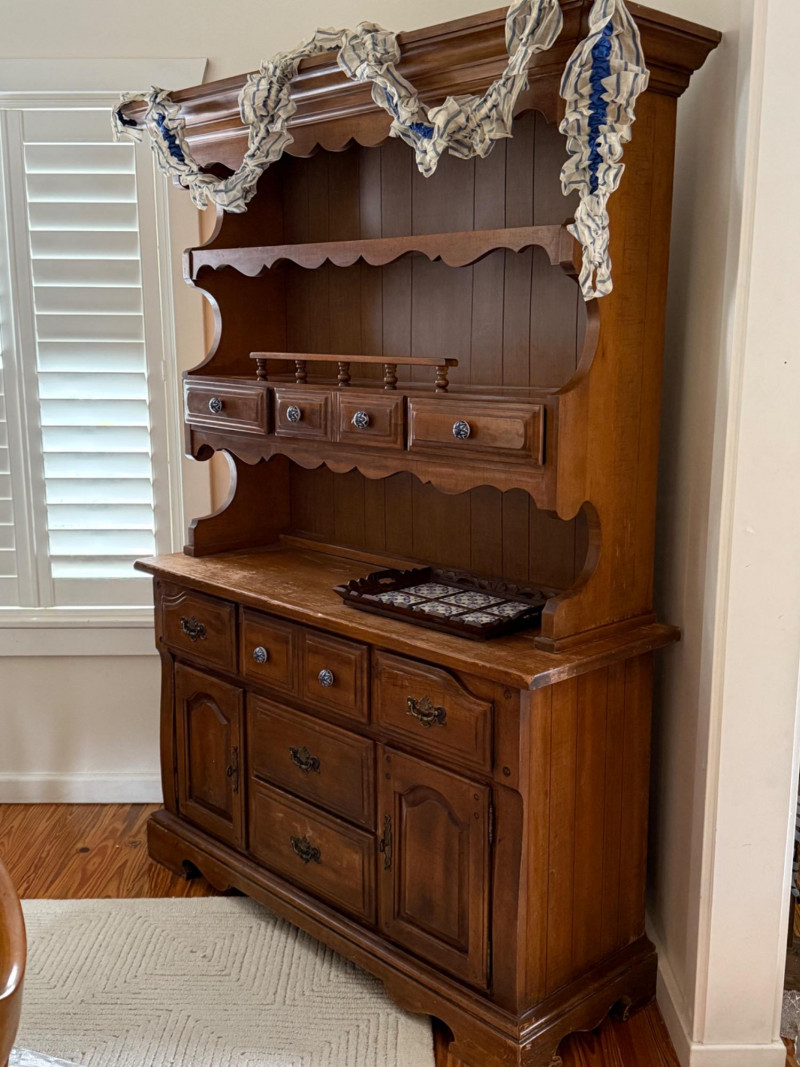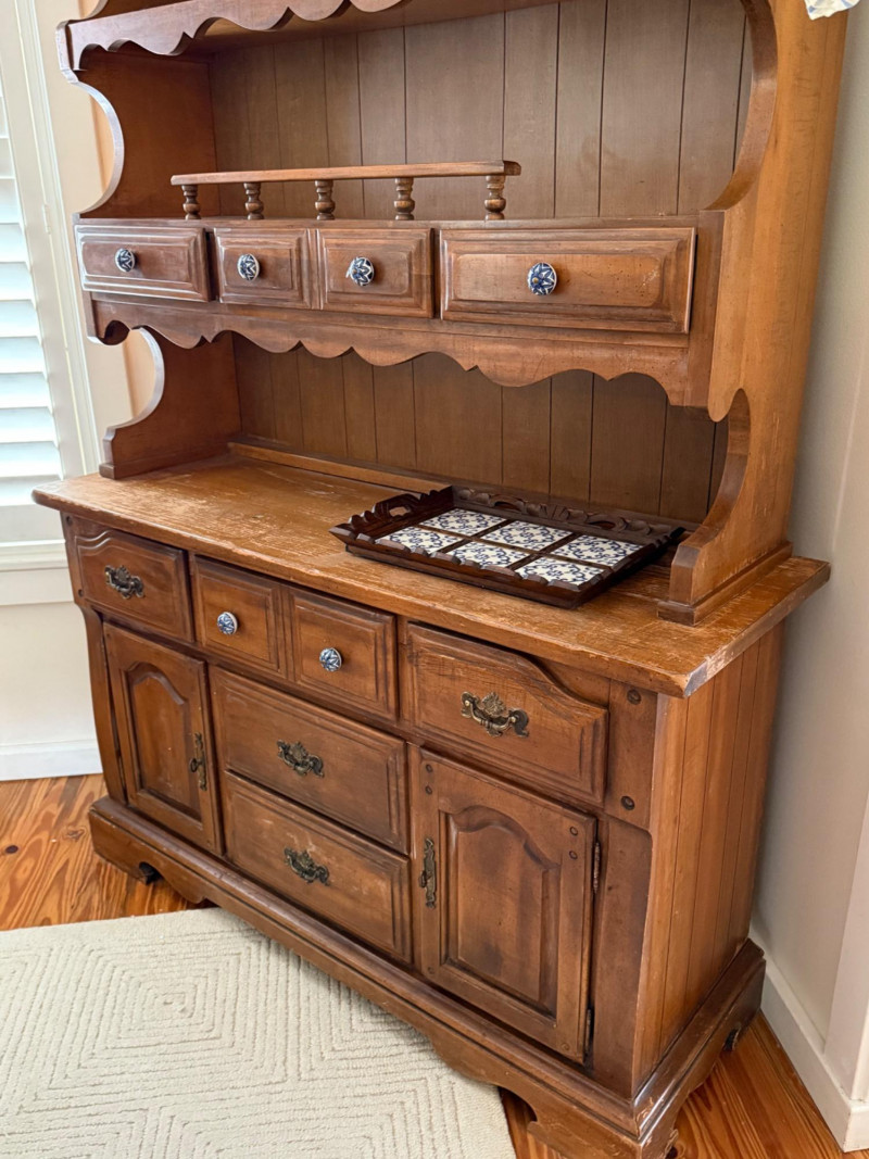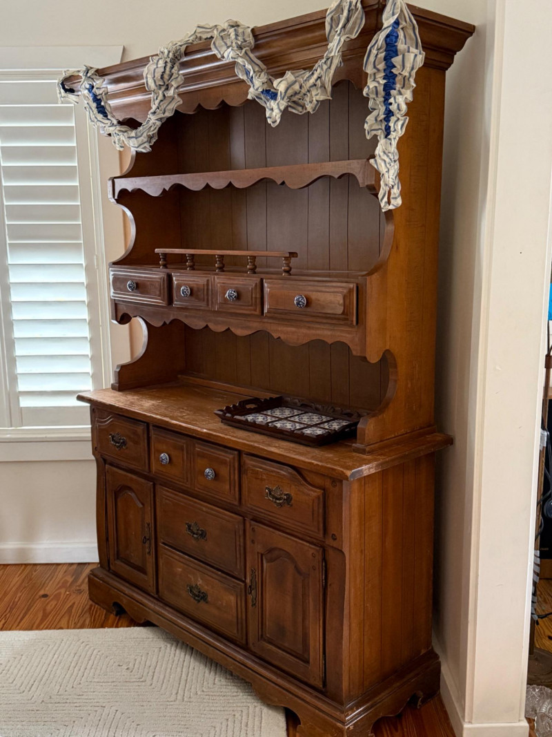 Vintage Wood Dining Hutch with Upper Shelf Storage Dimensions: 54" W x 19" D x 78.5" H Note: This is a large heavy piece and will require two people to carry.