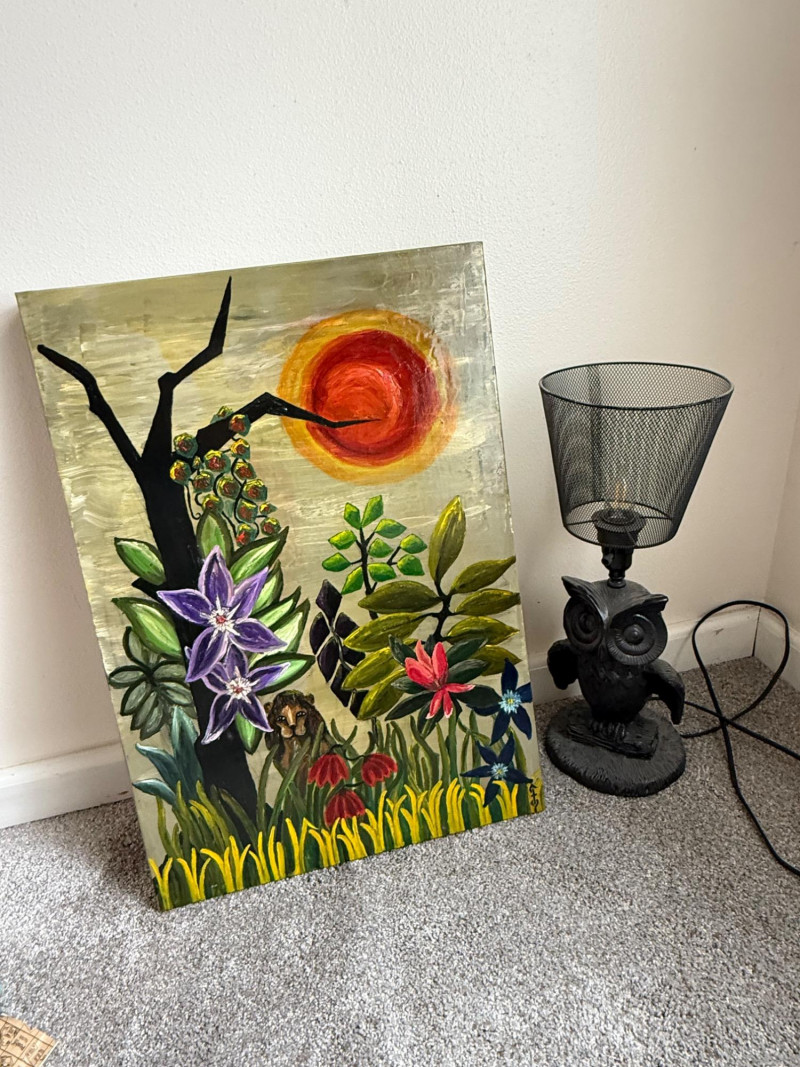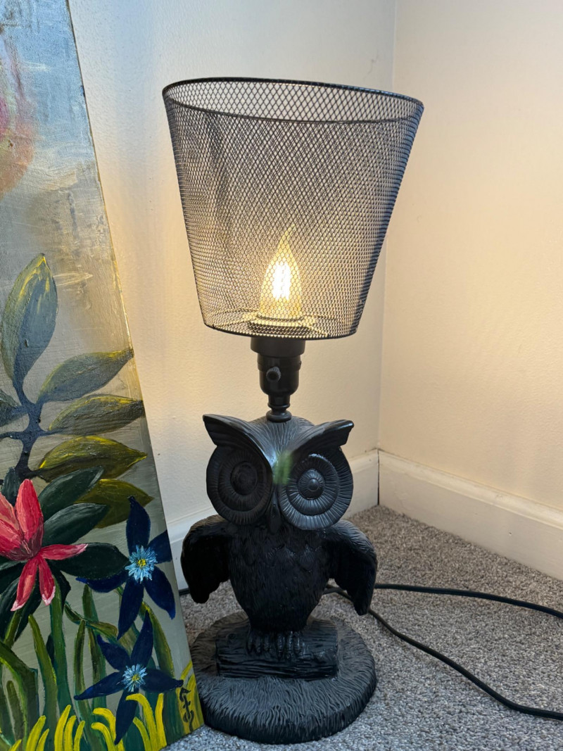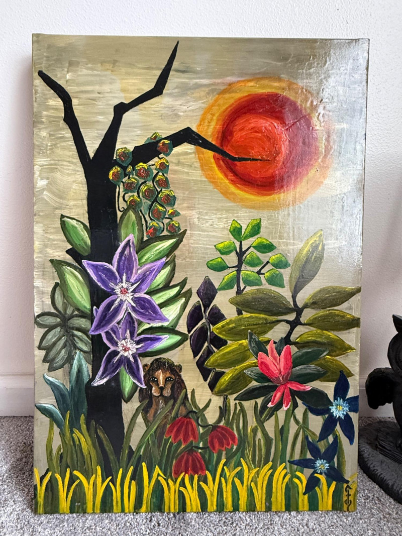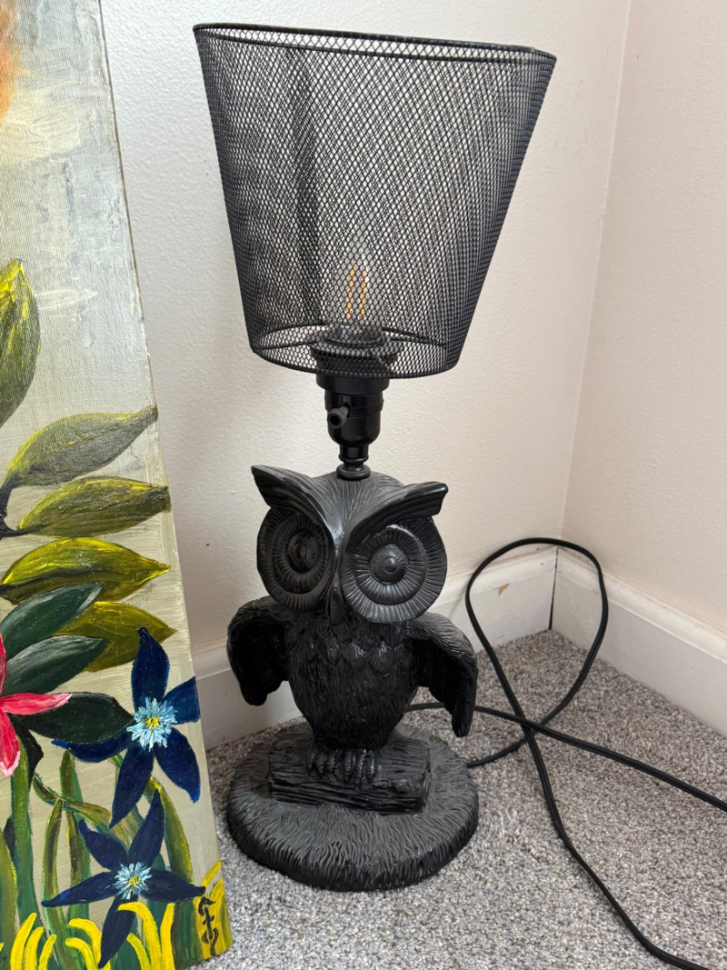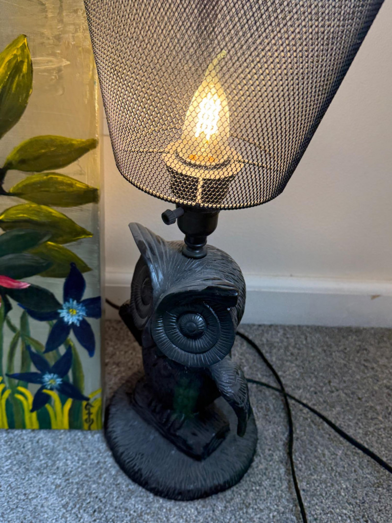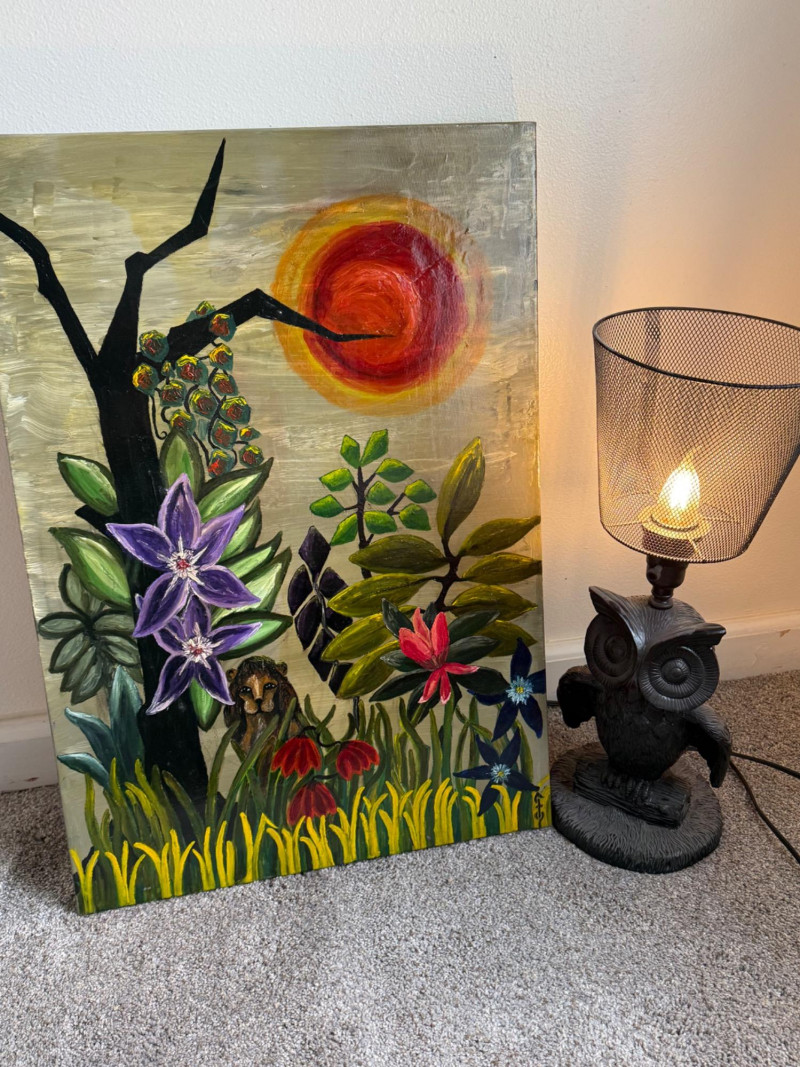 Owl Lamp and Painted Art Panel Sculptural owl table lamp with a mesh metal shade, paired with a hand-painted panel depicting a jungle scene with stylized flowers, layered foliage, and a red-orange sun. A small lion is camouflaged among the plants. Owl Lamp Base Measurements: