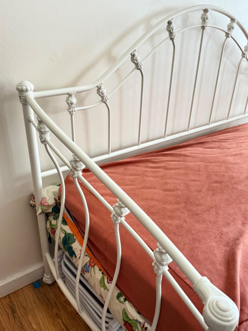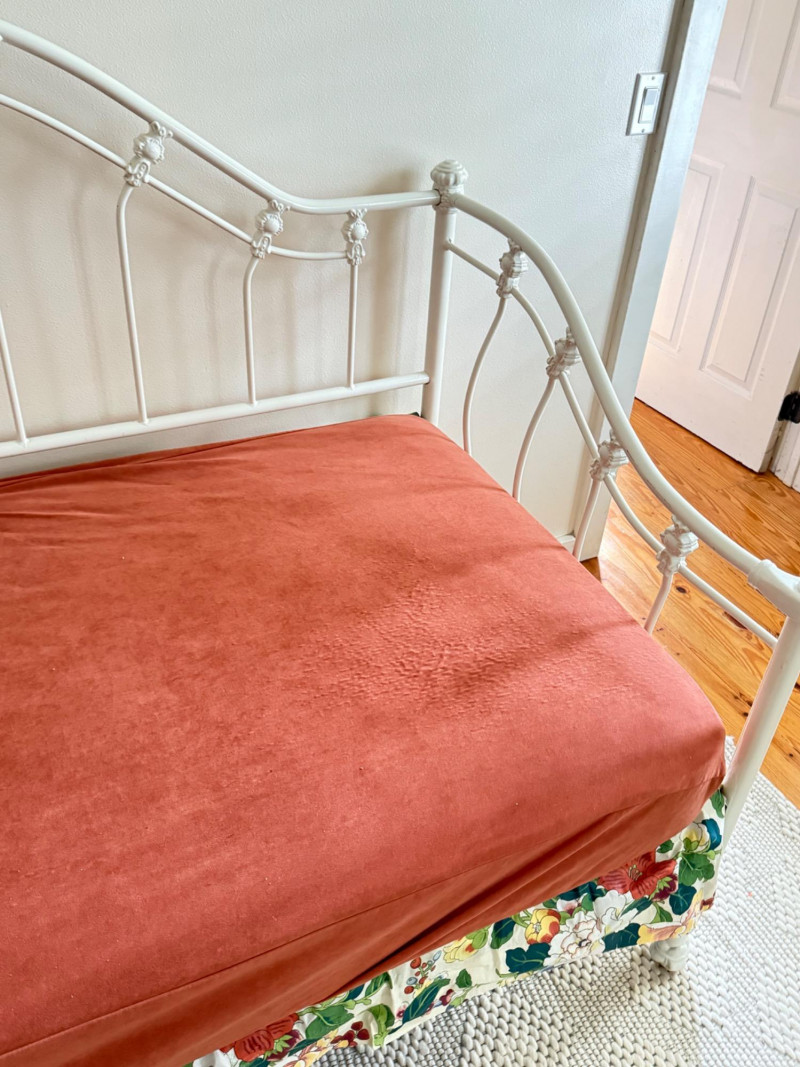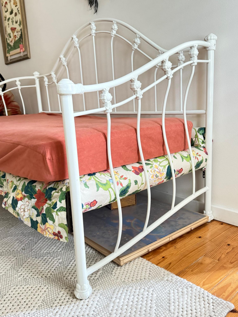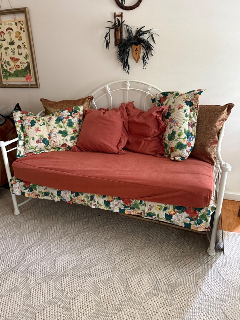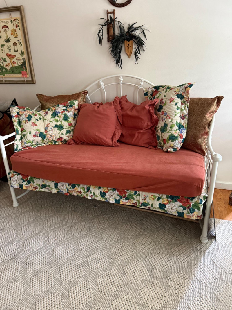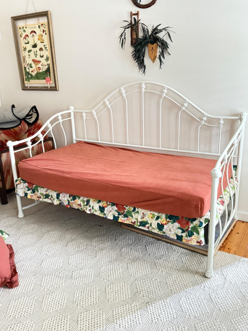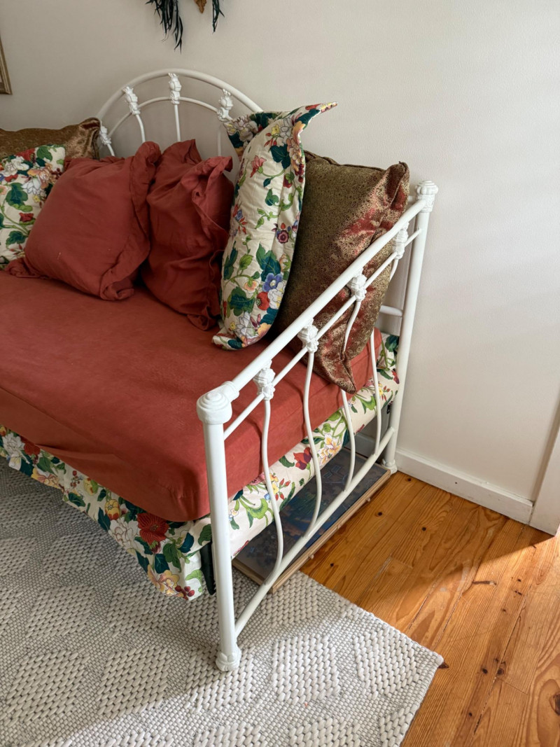 White Metal Daybed with Mattress, Skirt, and Pillows Classic white metal daybed frame with arched back and decorative spindles. Includes a terracotta-colored fitted mattress cover, floral bed skirt, and a collection of throw pillows in floral, rust, and bronze tones. Dimensions: