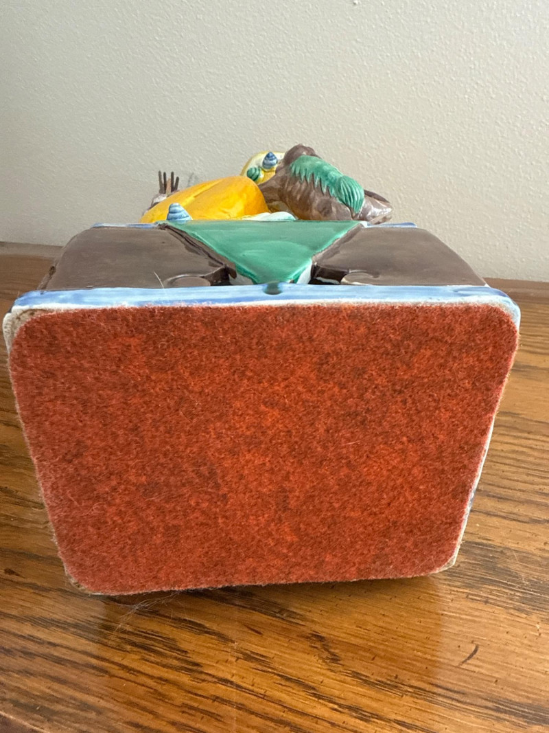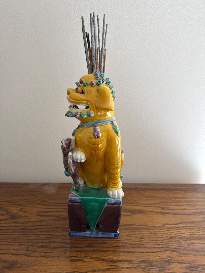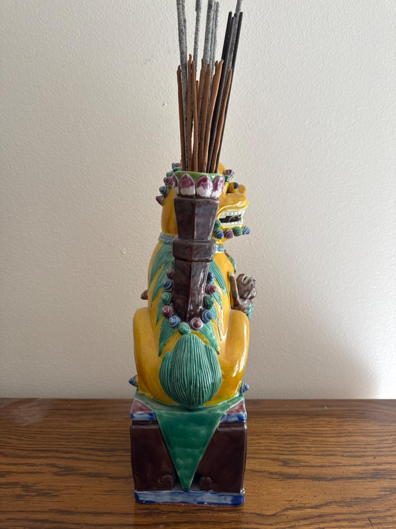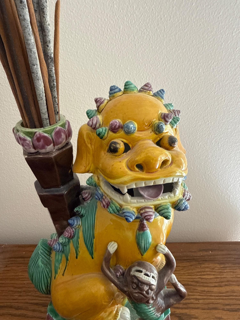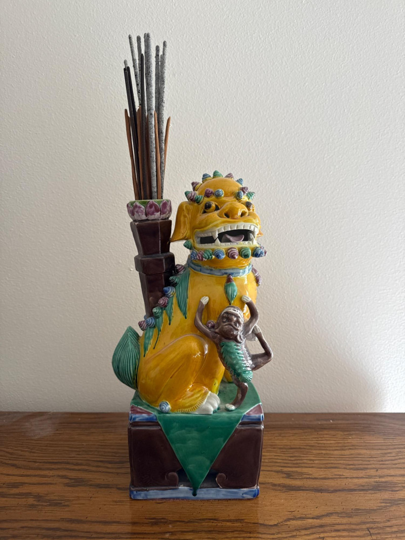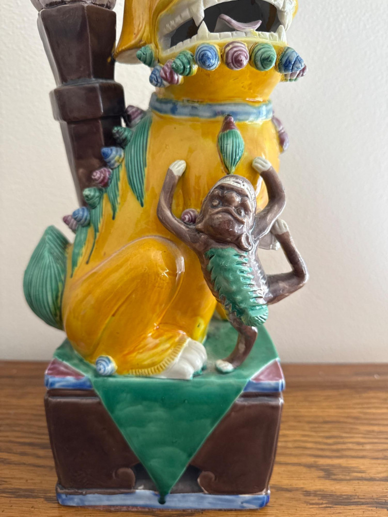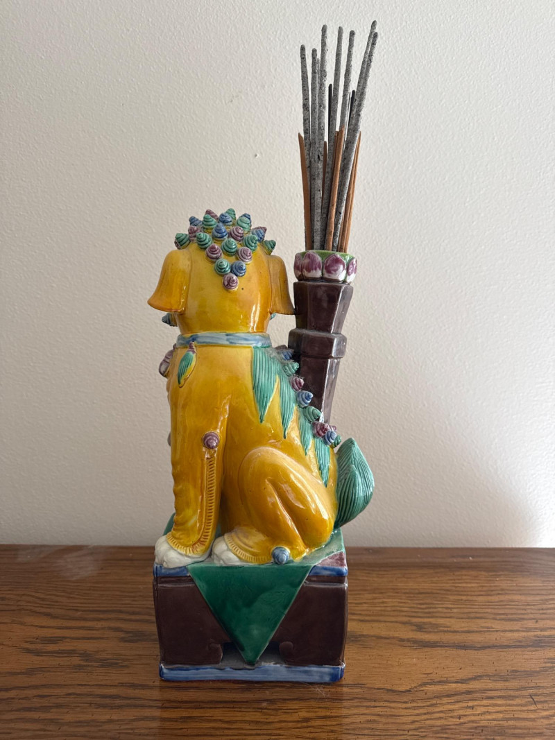 Vintage RareAsian Porcelain Foo Dog Incense Holder with Monkey Figure Colorful glazed porcelain Foo Dog seated on a pedestal base, featuring applied scroll and mane detailing. A monkey figure clings to the front, and a tall vessel mounted on the back holds incense sticks. The base is felt-lined. Note: No cracks. Slight dusty.
