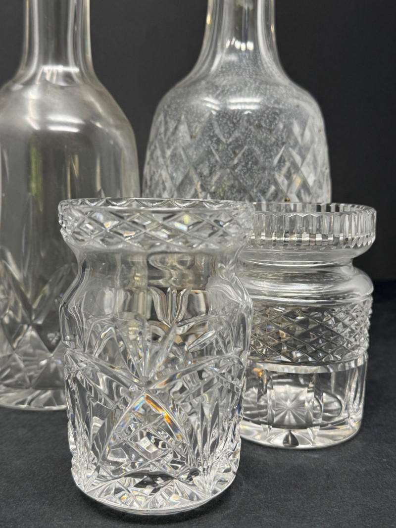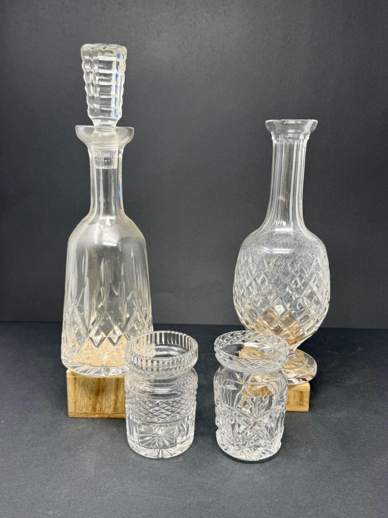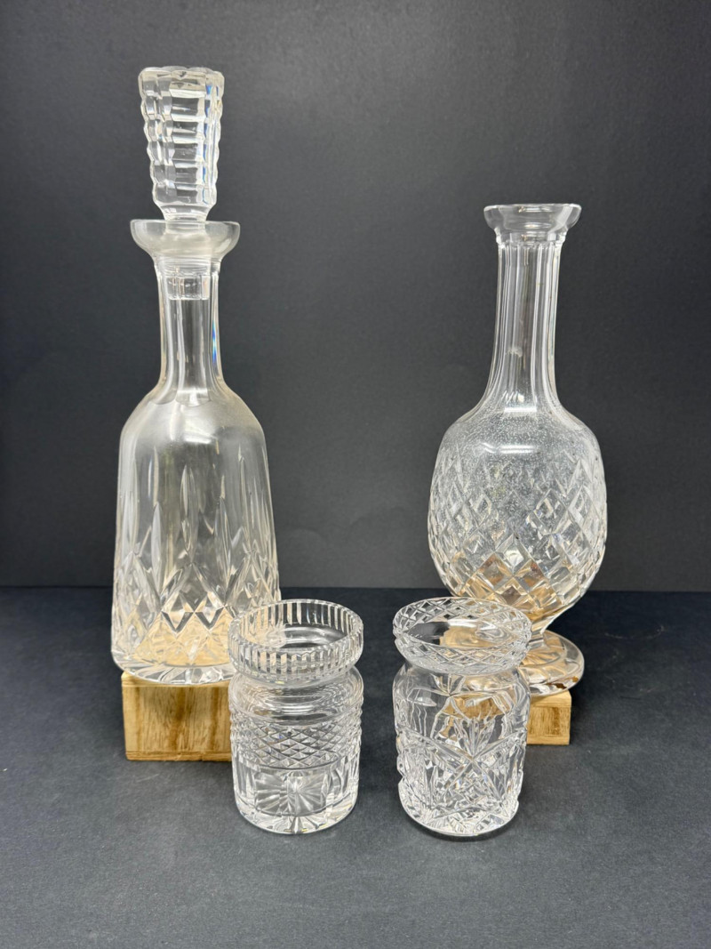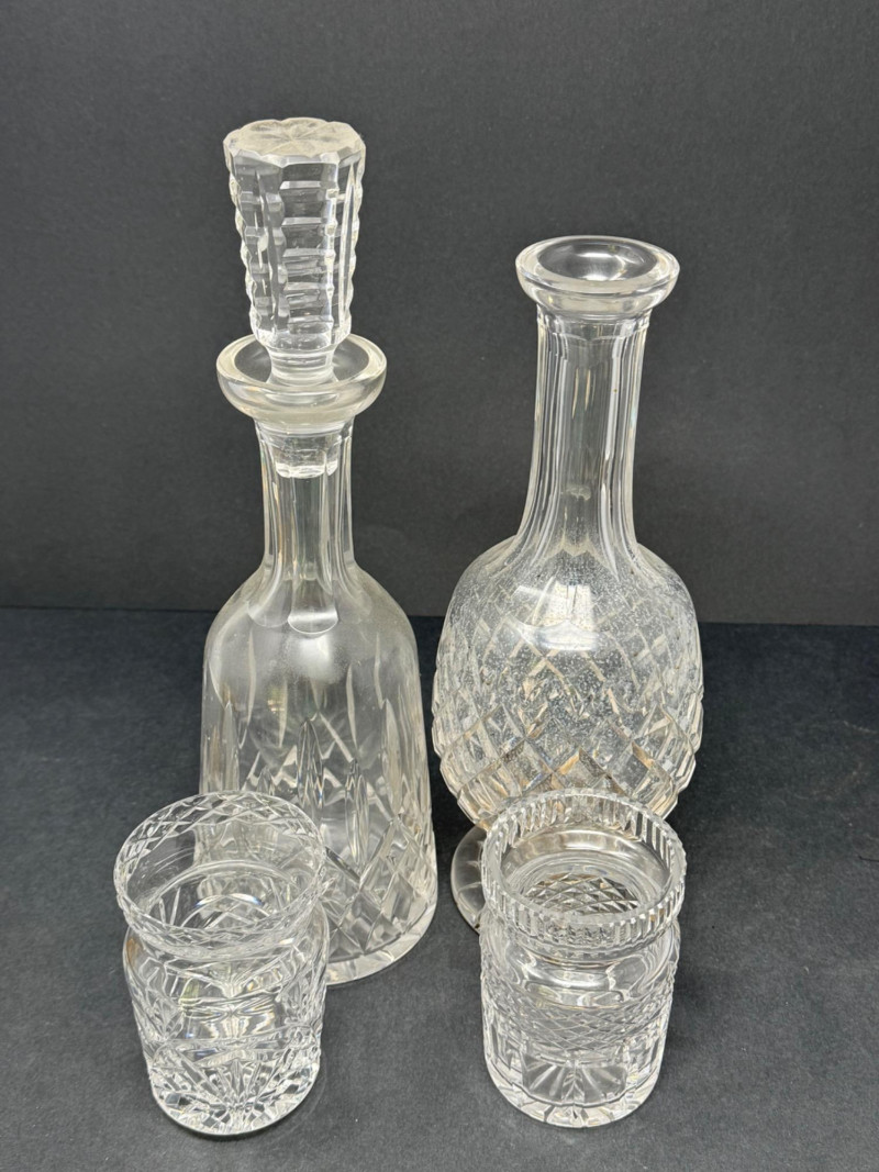 Waterford Crystal Decanter & Two Biscuit Barrels Set of three Waterford crystal pieces including one decanter with a stopper and two matching cut crystal biscuit barrels. Each item showcases traditional Waterford craftsmanship with detailed cut patterns and a clear polished finish. Measurements: Decanter with stopper: 13.5" H x 4" W (base) Glasses (each): 4.5" H x 3" W