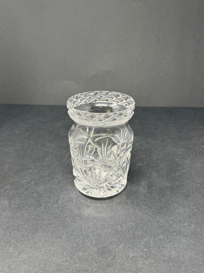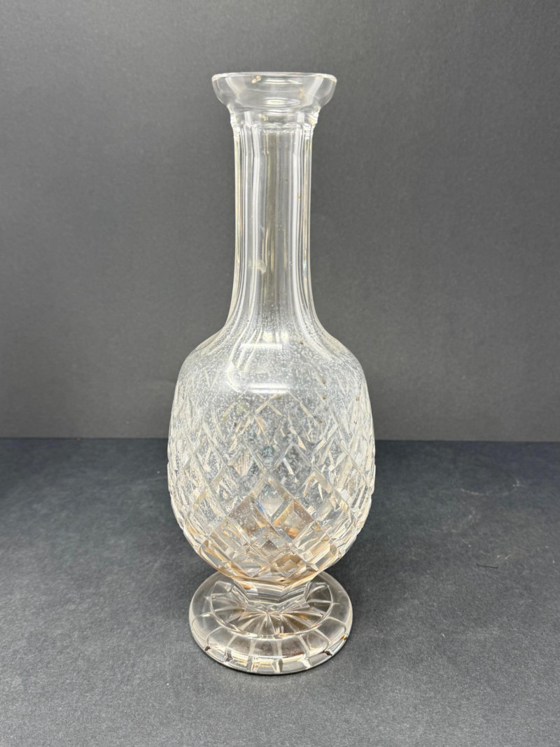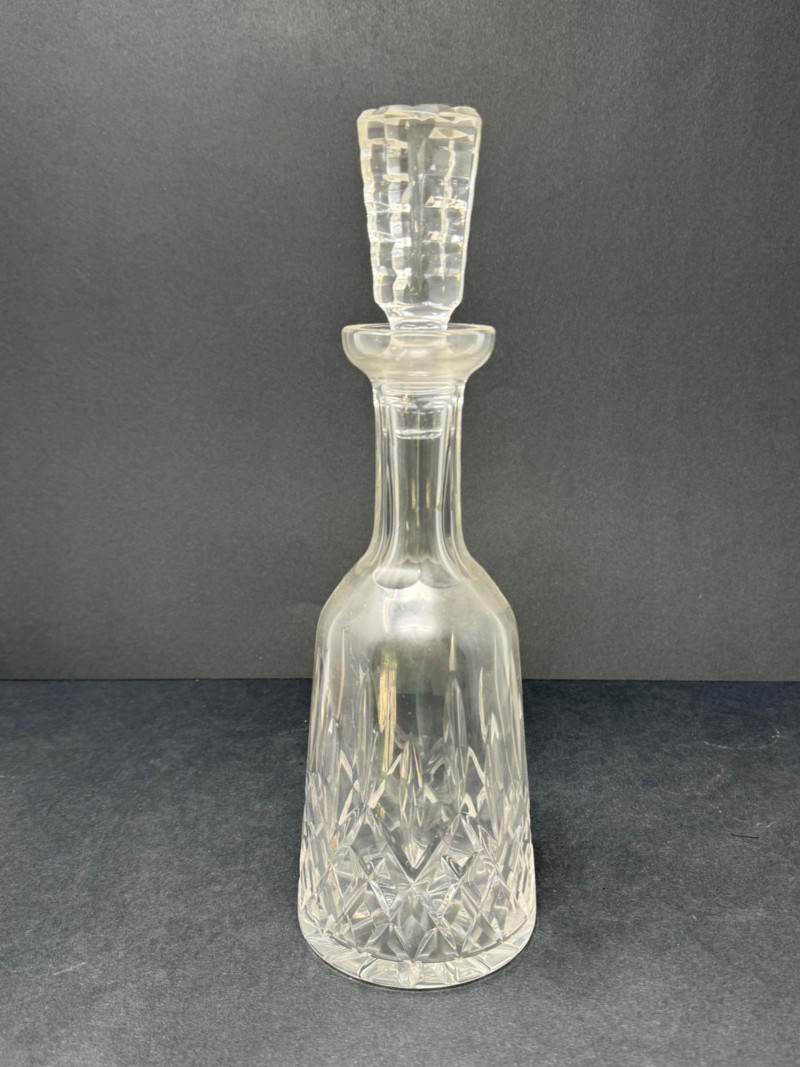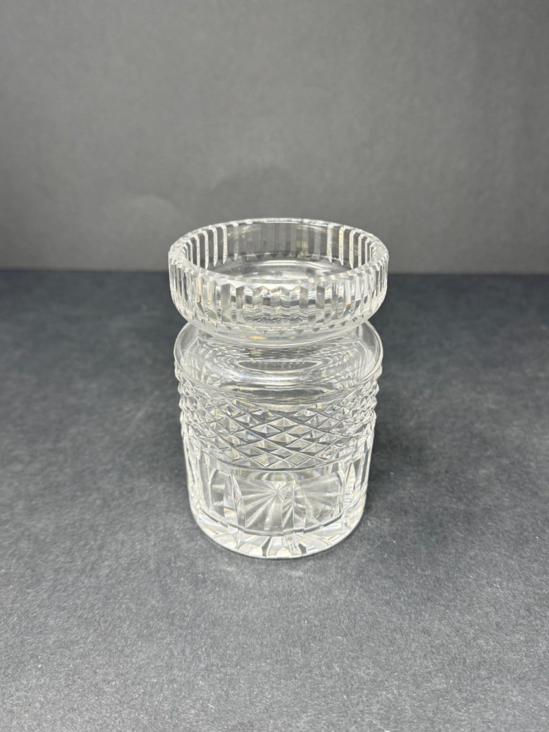 Waterford Crystal Decanter & Two Biscuit Barrels Set of three Waterford crystal pieces including one decanter with a stopper and two matching cut crystal biscuit barrels. Each item showcases traditional Waterford craftsmanship with detailed cut patterns and a clear polished finish. Measurements: Decanter with stopper: 13.5" H x 4" W (base) Glasses (each): 4.5" H x 3" W