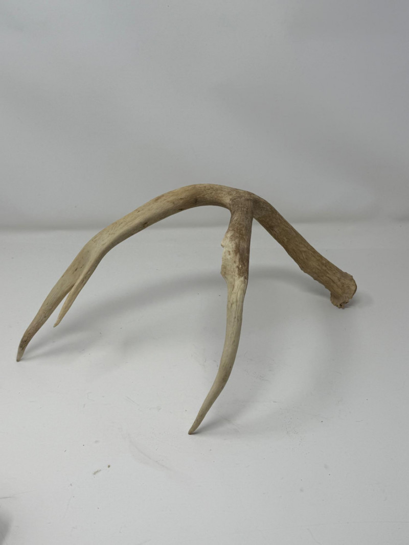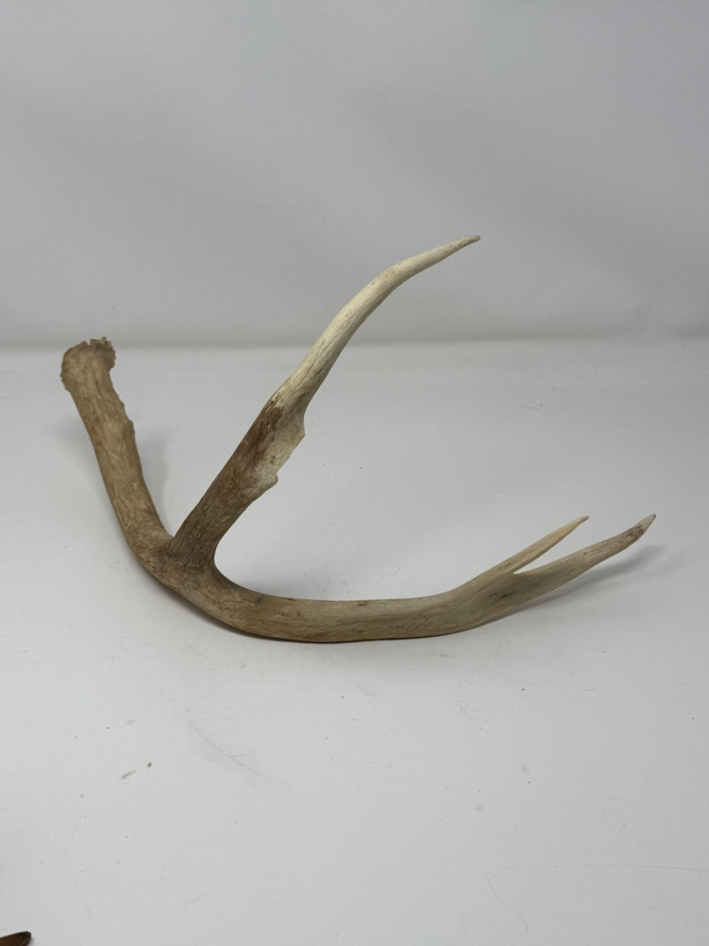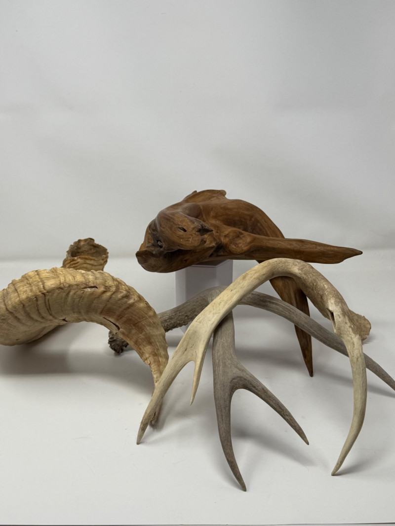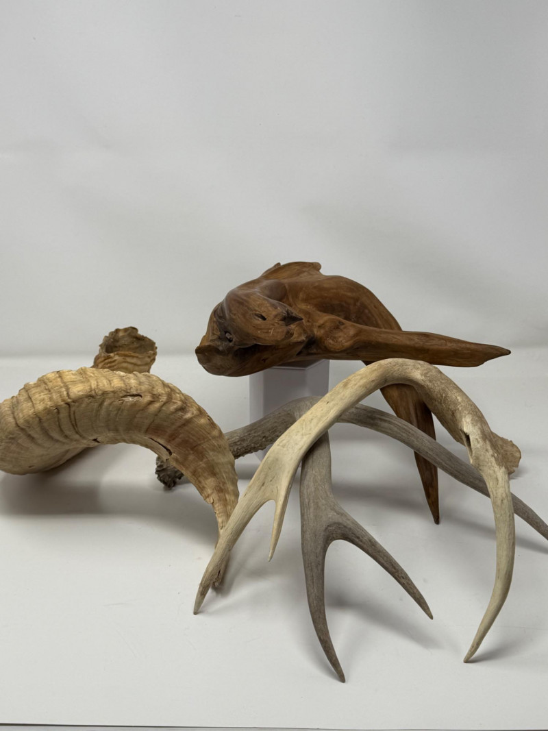 Assorted Natural Antler and Driftwood Lot Lot includes a mix of natural antlers, curled horns, and a carved driftwood form. The set features: Three deer antler sheds with varied tine shapes and natural coloration Two curled ram-style horns with rough outer texture and hollow bases One driftwood piece with a carved animal-like form, possibly resembling a fish or otter Largest curled horn measurement: