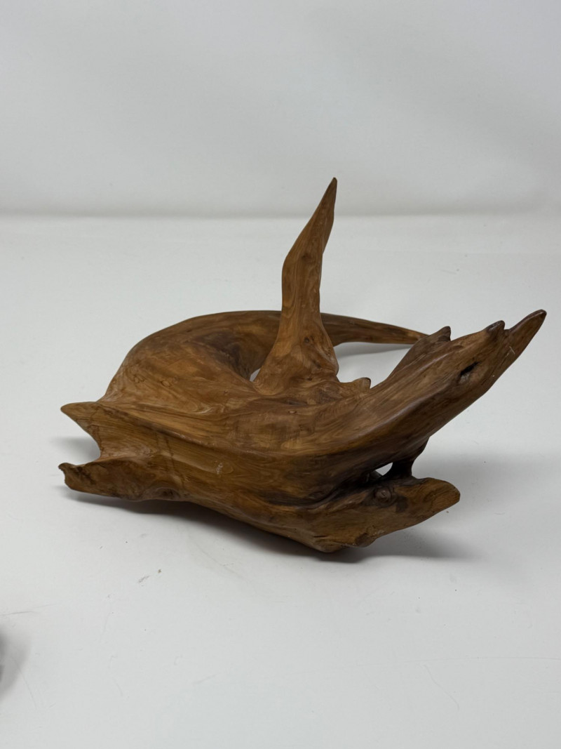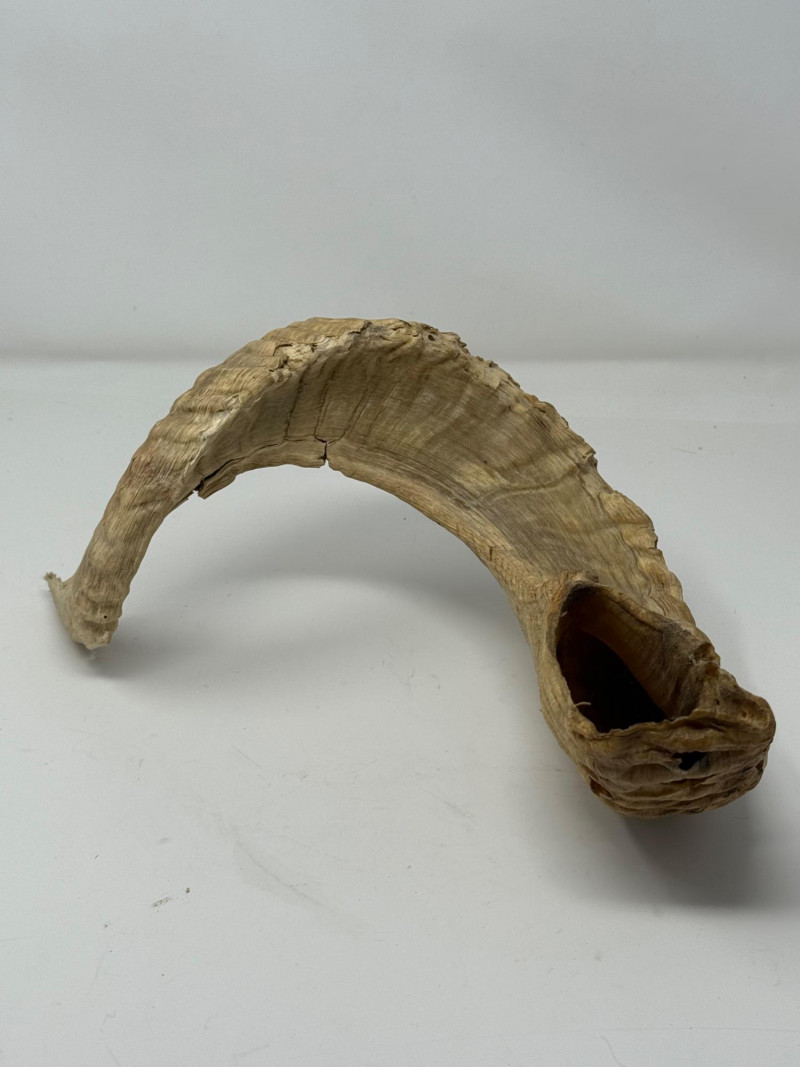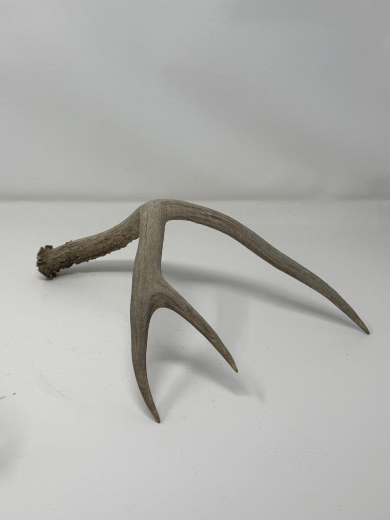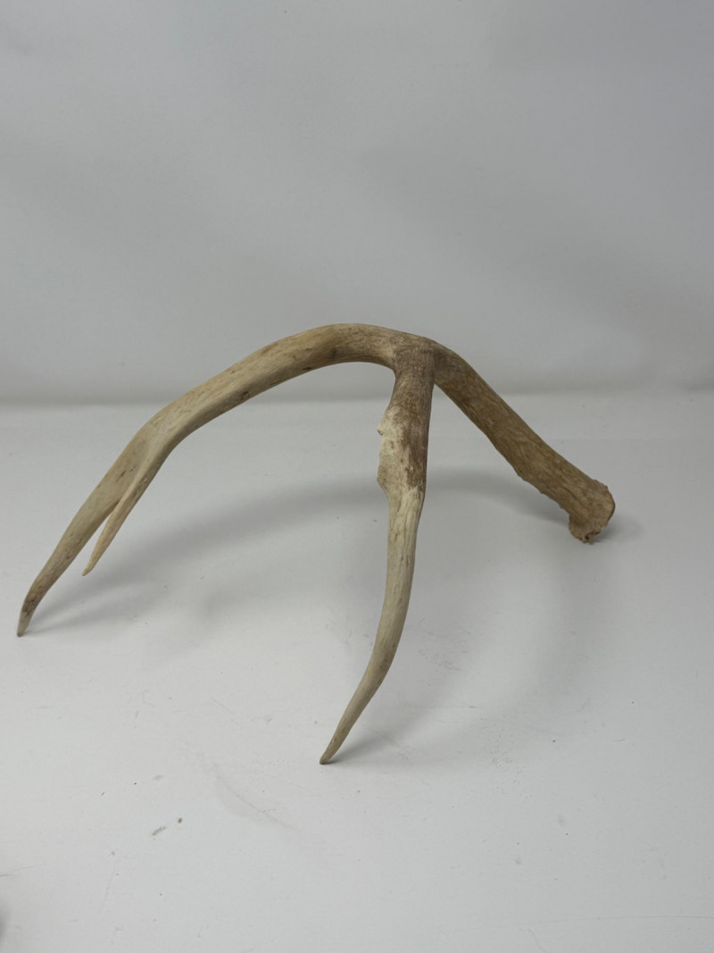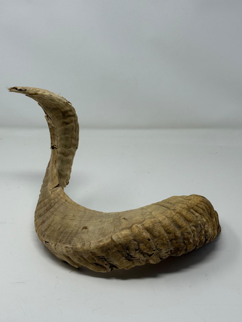 Assorted Natural Antler and Driftwood Lot Lot includes a mix of natural antlers, curled horns, and a carved driftwood form. The set features: Three deer antler sheds with varied tine shapes and natural coloration Two curled ram-style horns with rough outer texture and hollow bases One driftwood piece with a carved animal-like form, possibly resembling a fish or otter Largest curled horn measurement: