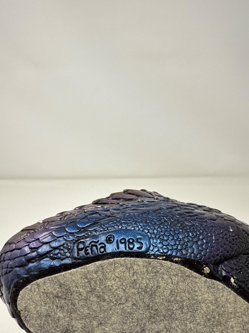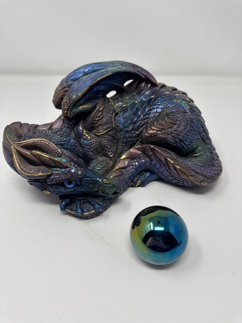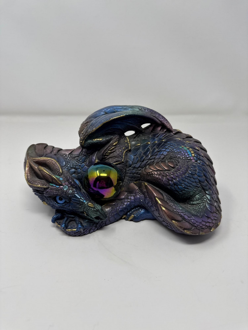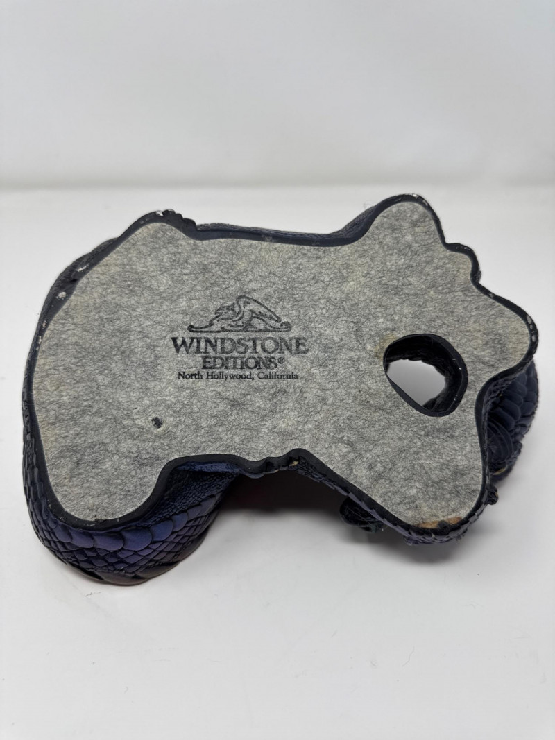 Vintage Windstone Editions Resting Mother Dragon Peacock Iridescent, 1985 Peña Resting mother dragon sculpture by Windstone Editions, designed by M. Peña and marked 1985. Features a peacock-toned iridescent finish with blue eyes and embedded crystals. Includes matching iridescent glass orb. Maker’s mark and original felted base with “Windstone Editions, North Hollywood, California” stamp. One small mark present on the dragon’s back as shown.