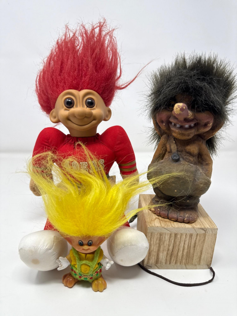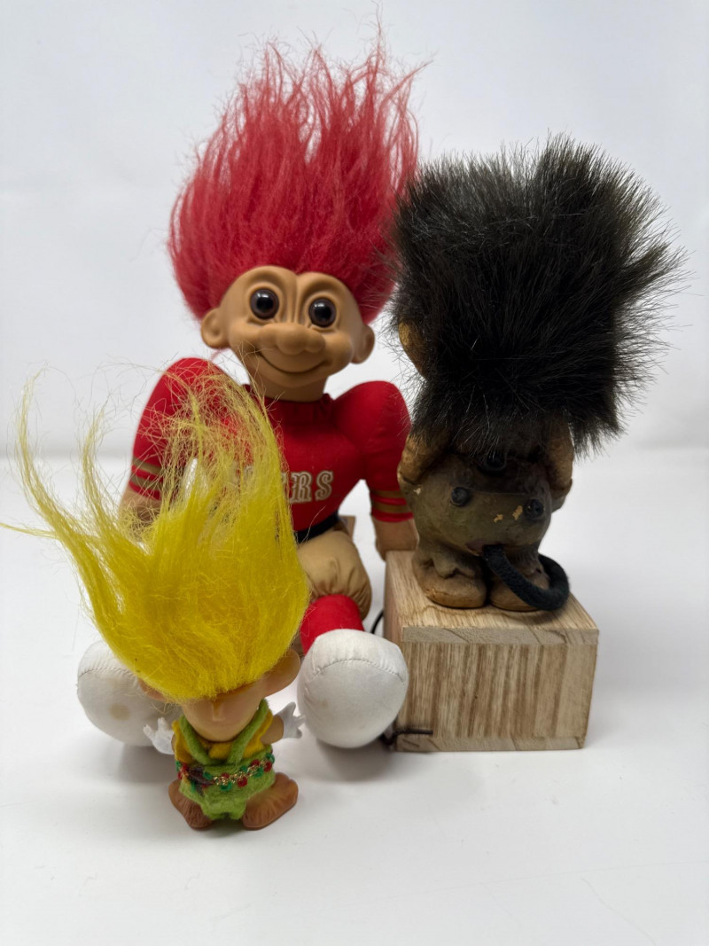 Vintage Troll Doll Collection Lot of three vintage troll dolls, including a hand-painted Norway troll with faux fur hair and cloth tail on a wooden base, a large troll in a red 49ers outfit with bright red hair, and a small troll with yellow hair and a printed green outfit.