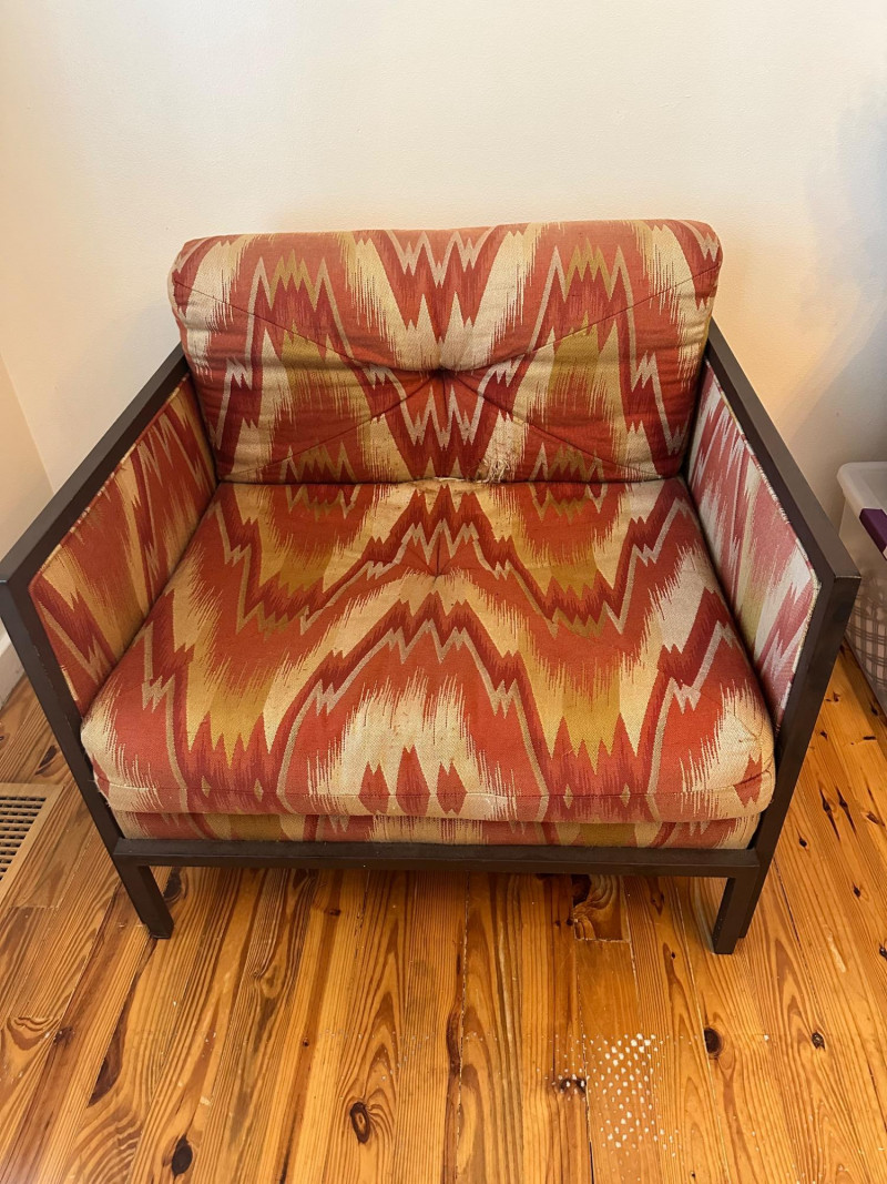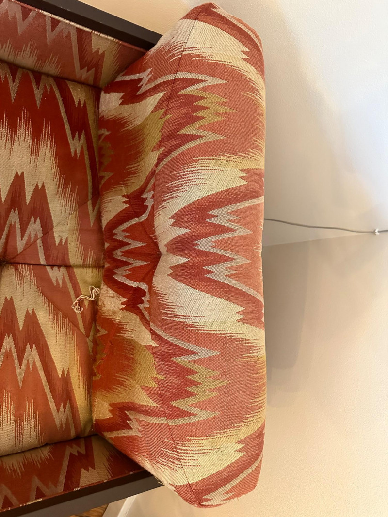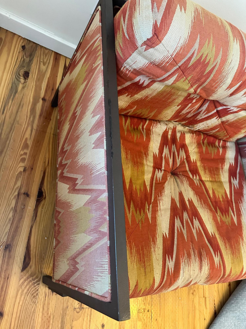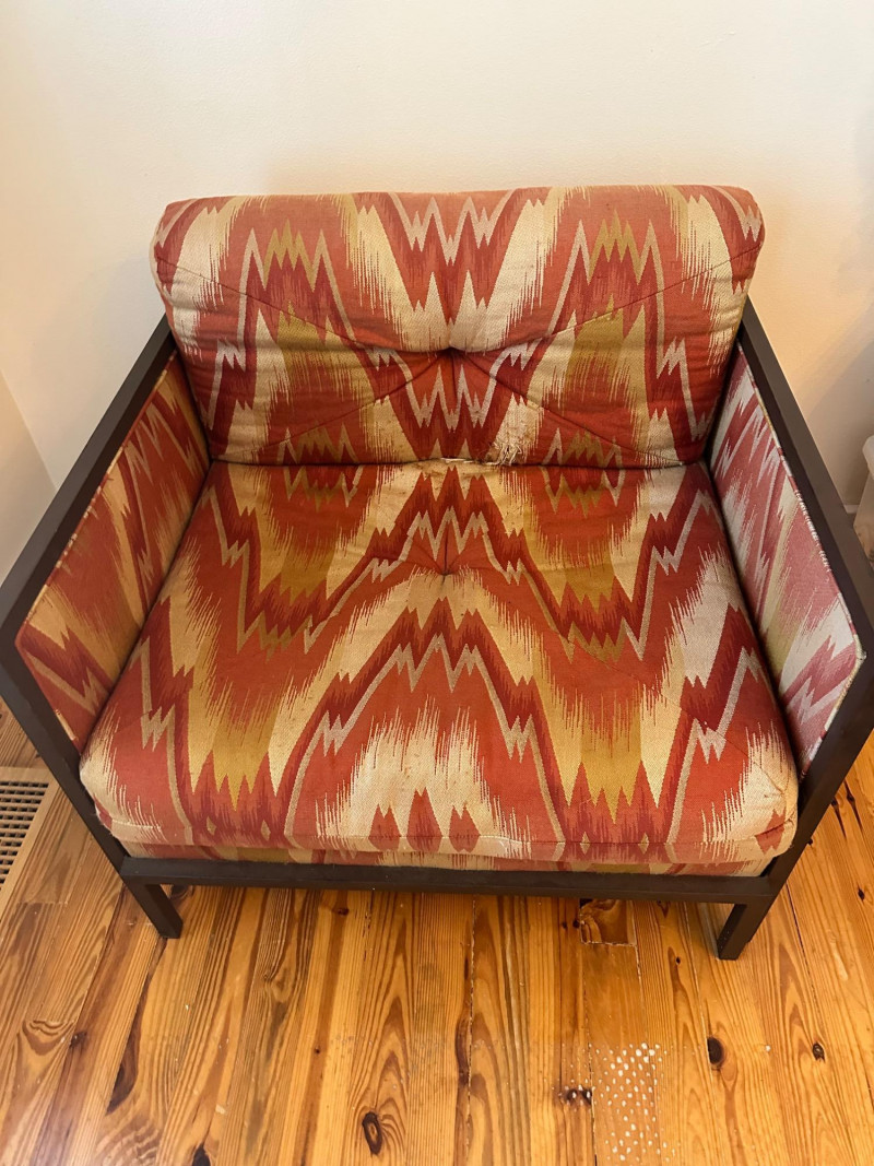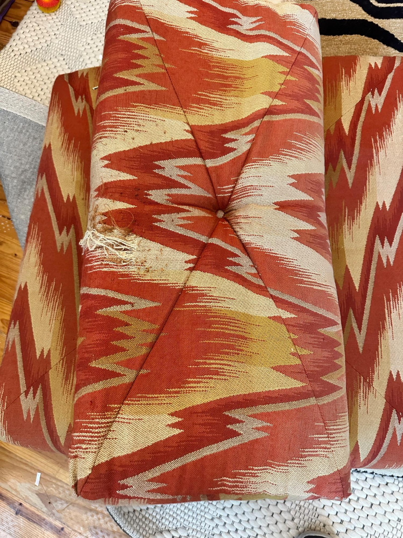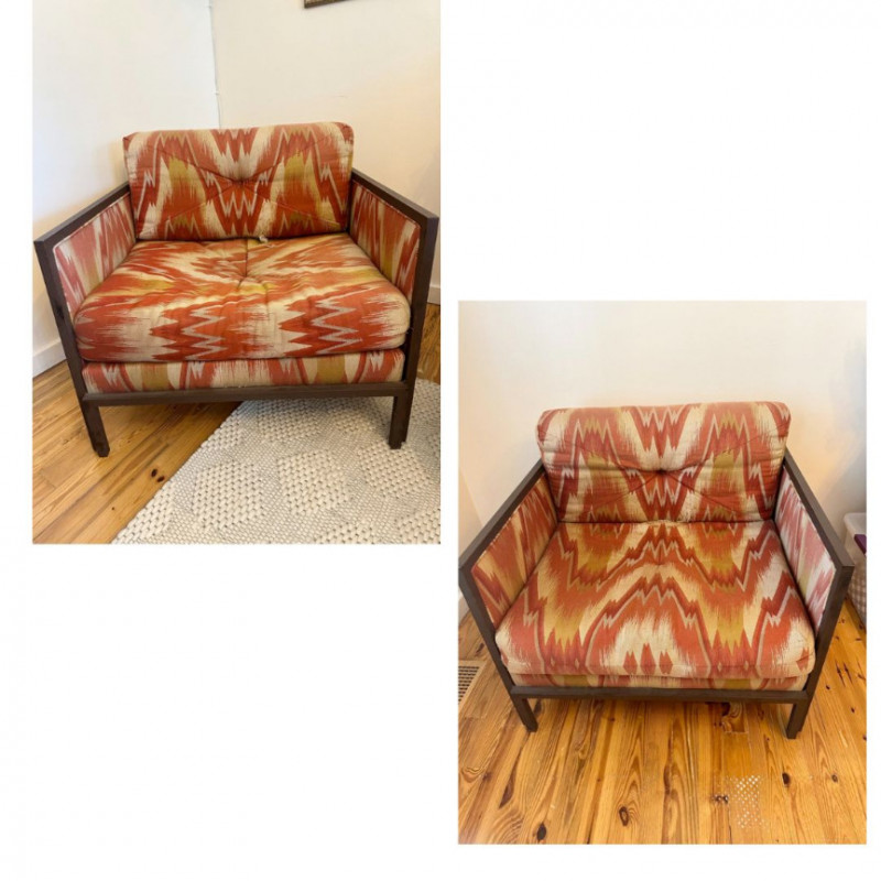 Pair of Upholstered Armchairs with Wood Frame Pair of armchairs featuring a wood frame with squared arms and upholstered cushions in a red, beige, and gold zigzag pattern. Each chair includes a loose back cushion and a single seat cushion. The fabric shows areas of fraying and tearing on both chairs. Cushions are well-structured and the chairs are solidly constructed. Dimensions (each chair):