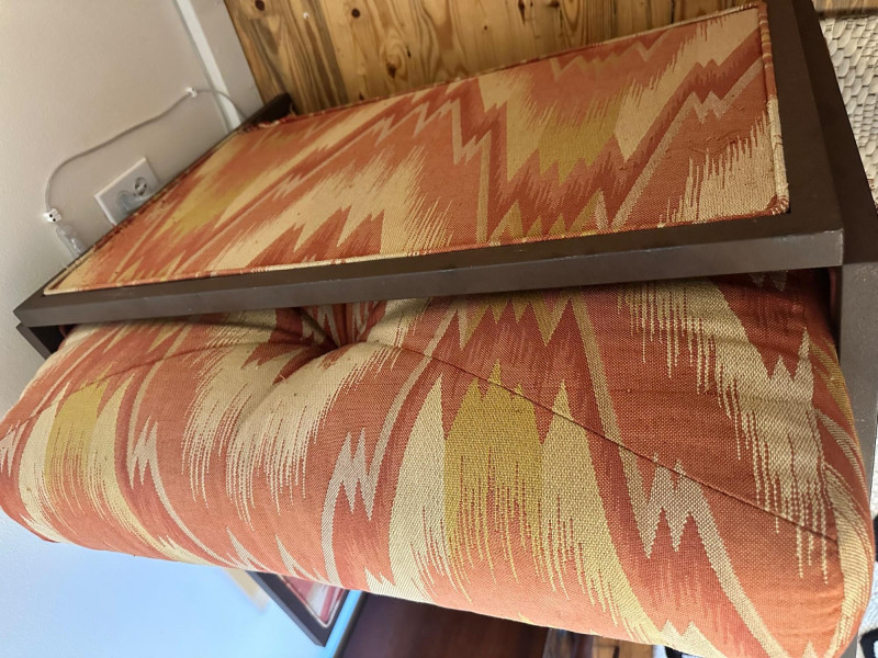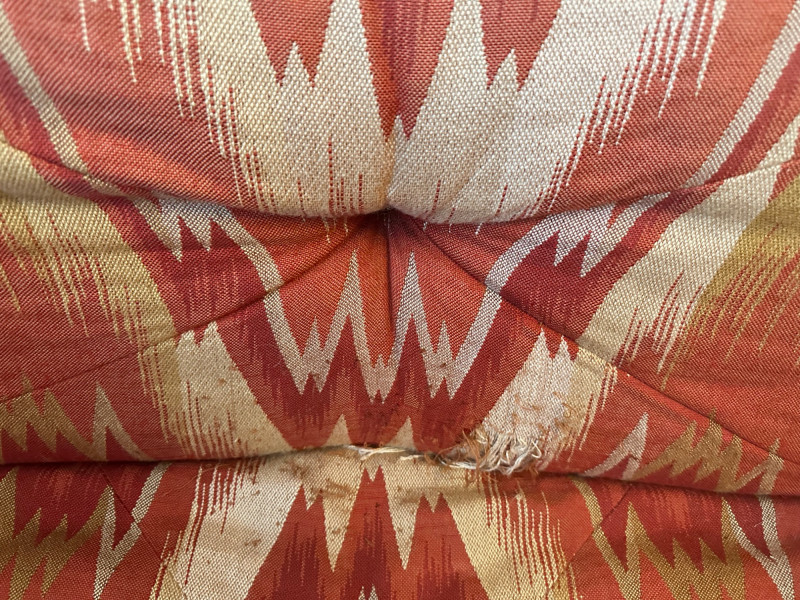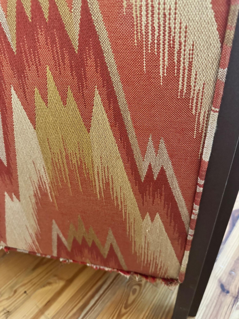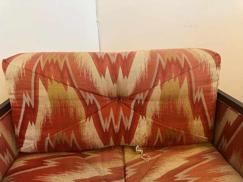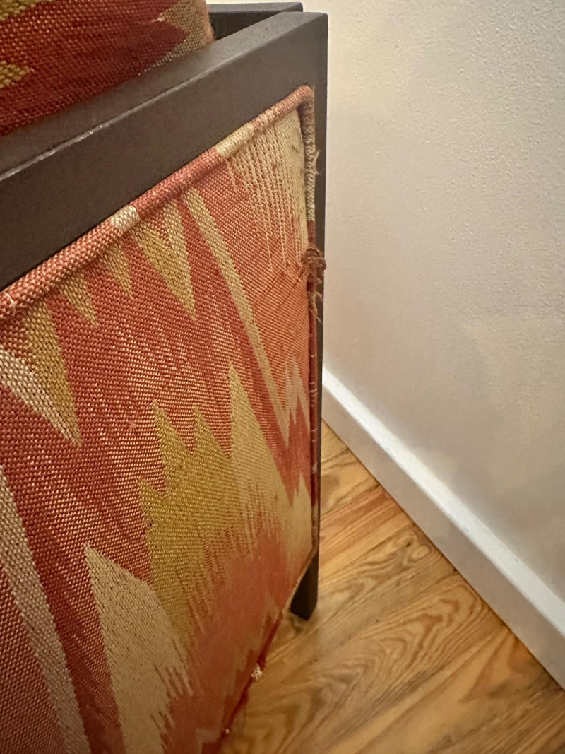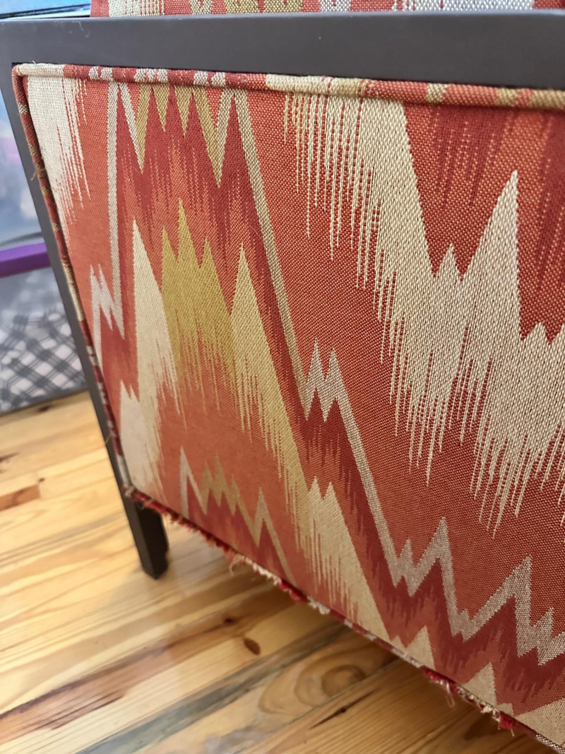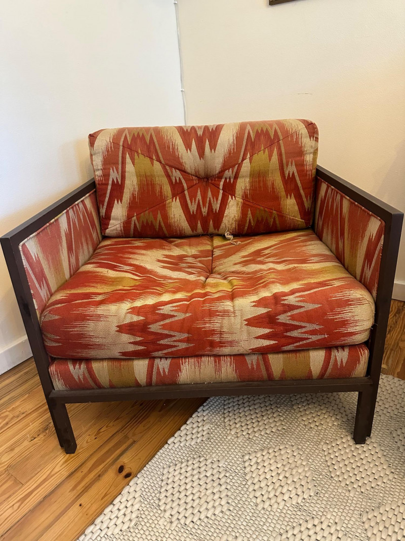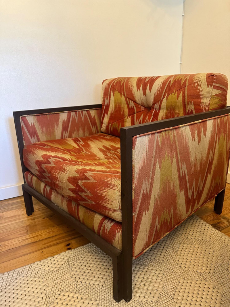 Pair of Upholstered Armchairs with Wood Frame Pair of armchairs featuring a wood frame with squared arms and upholstered cushions in a red, beige, and gold zigzag pattern. Each chair includes a loose back cushion and a single seat cushion. The fabric shows areas of fraying and tearing on both chairs. Cushions are well-structured and the chairs are solidly constructed. Dimensions (each chair):