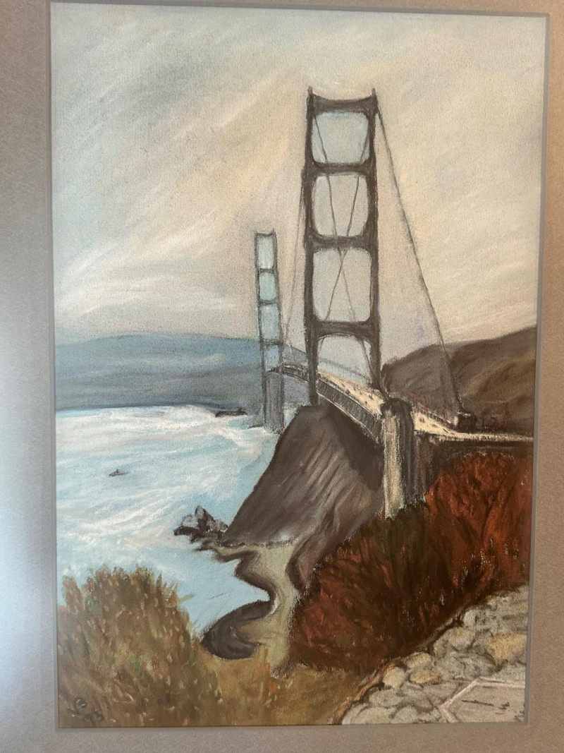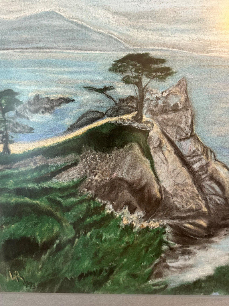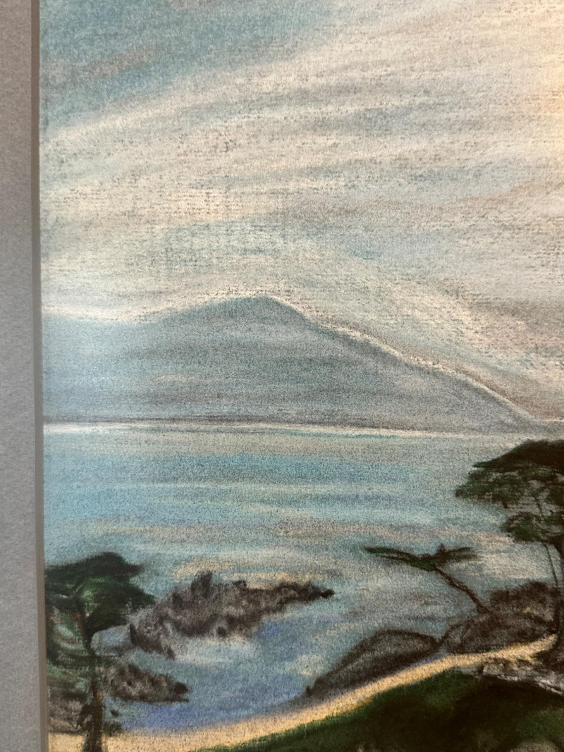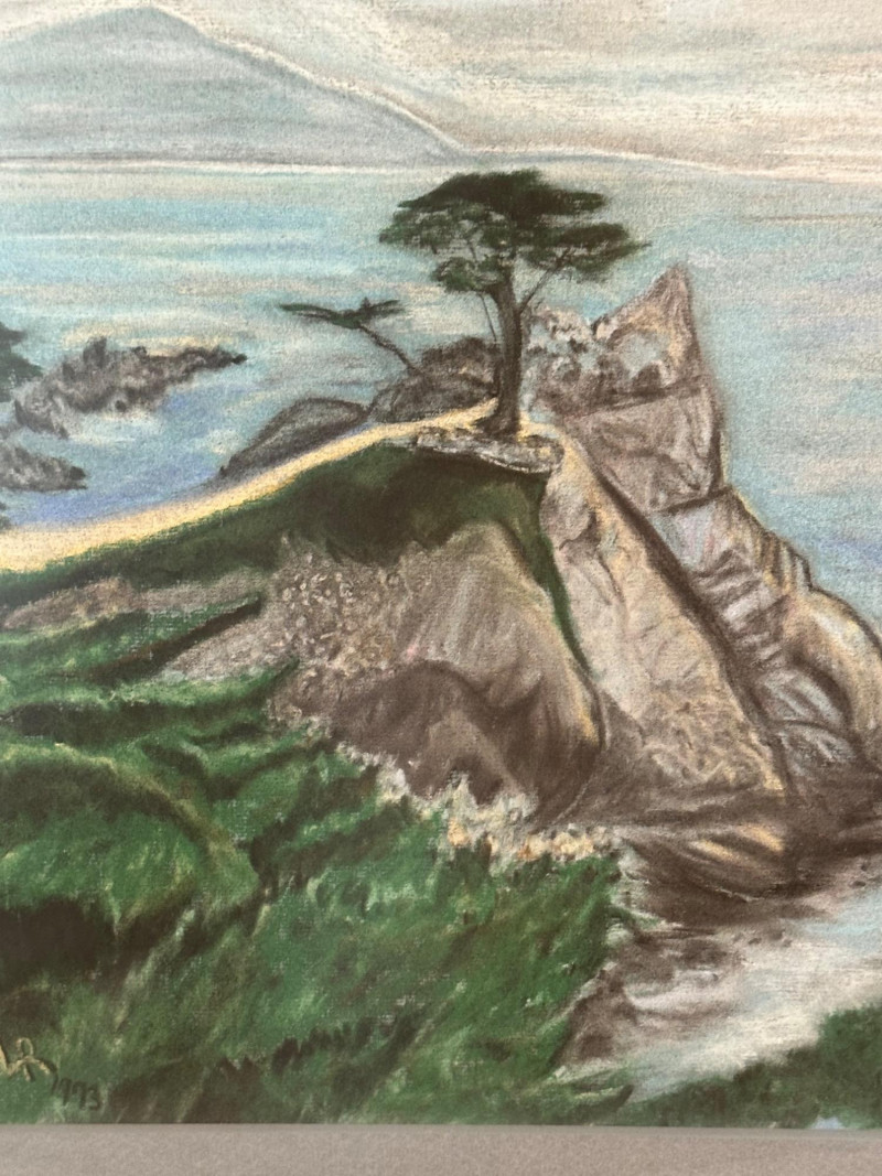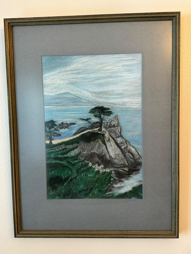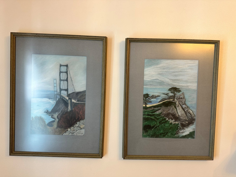 Pair of Signed Chalk Drawings – Coastal California Scenes (1973) Two original chalk drawings depicting iconic California landscapes: one featuring the Golden Gate Bridge and the other showcasing the Lone Cypress on the Monterey Peninsula. Both works are signed and dated 1973 by different artists and are framed in matching mats and wood frames. Medium: Chalk on paper