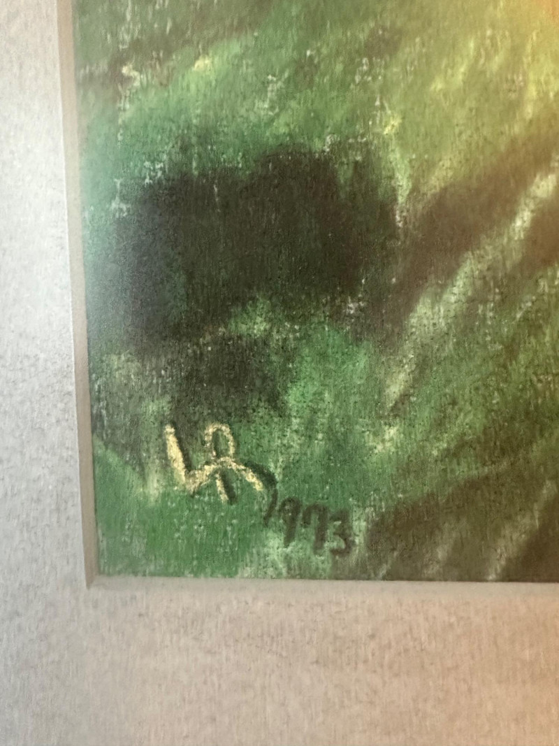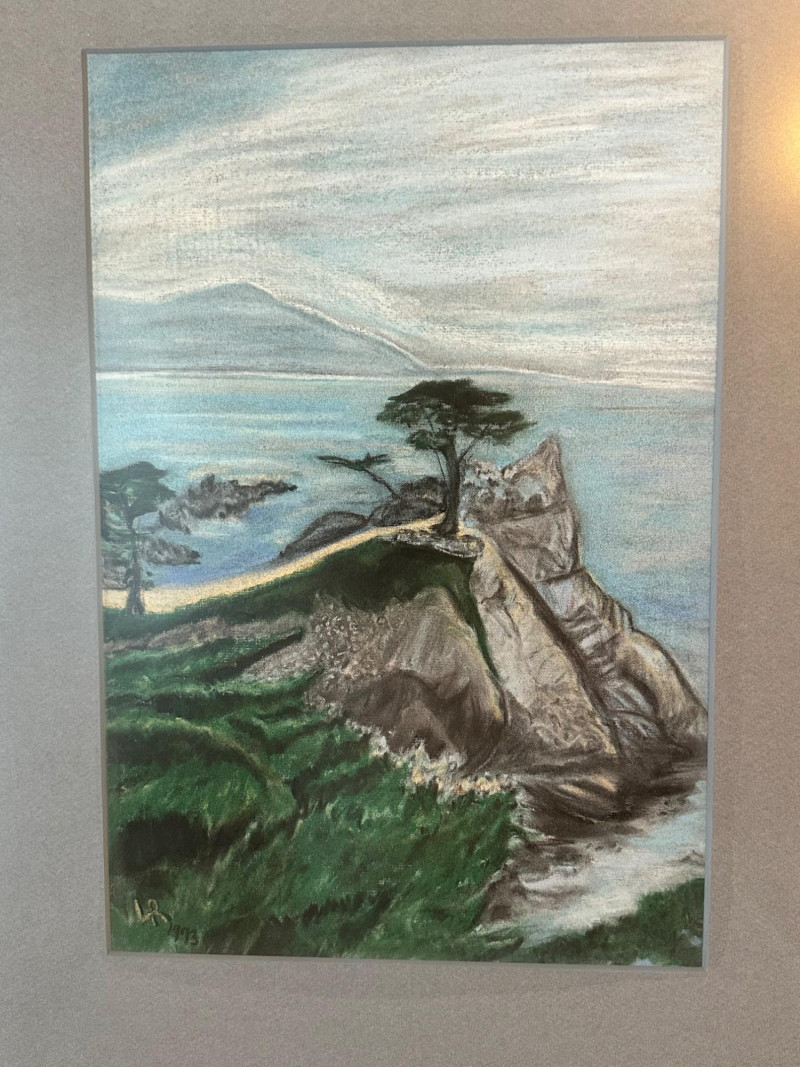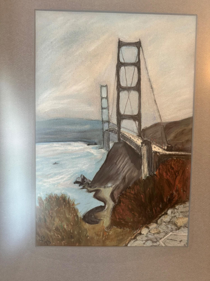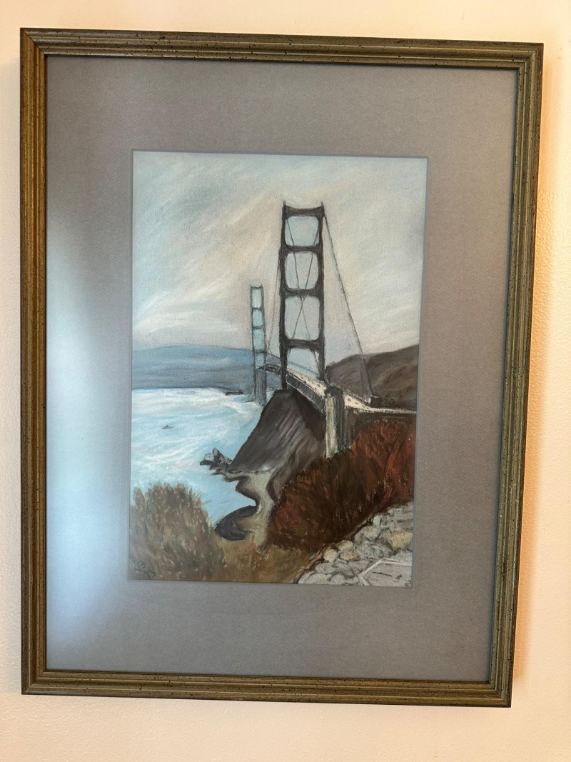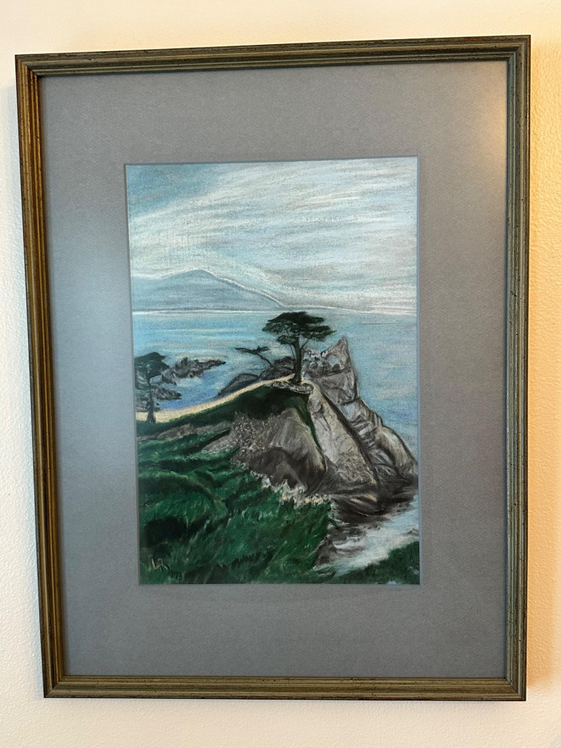 Pair of Signed Chalk Drawings – Coastal California Scenes (1973) Two original chalk drawings depicting iconic California landscapes: one featuring the Golden Gate Bridge and the other showcasing the Lone Cypress on the Monterey Peninsula. Both works are signed and dated 1973 by different artists and are framed in matching mats and wood frames. Medium: Chalk on paper