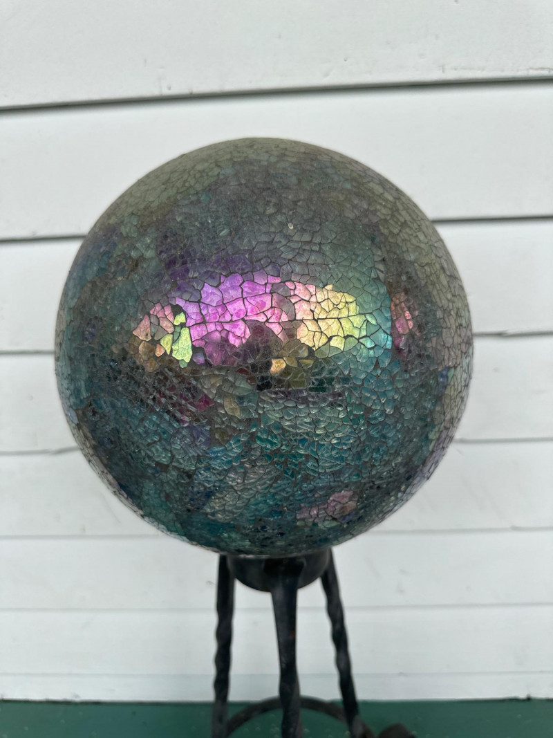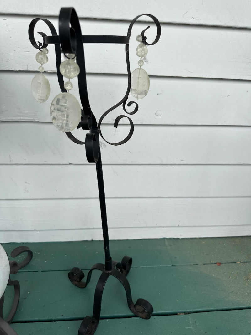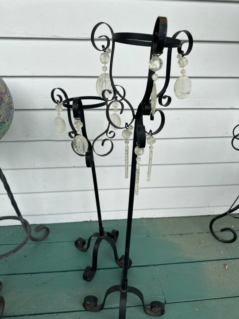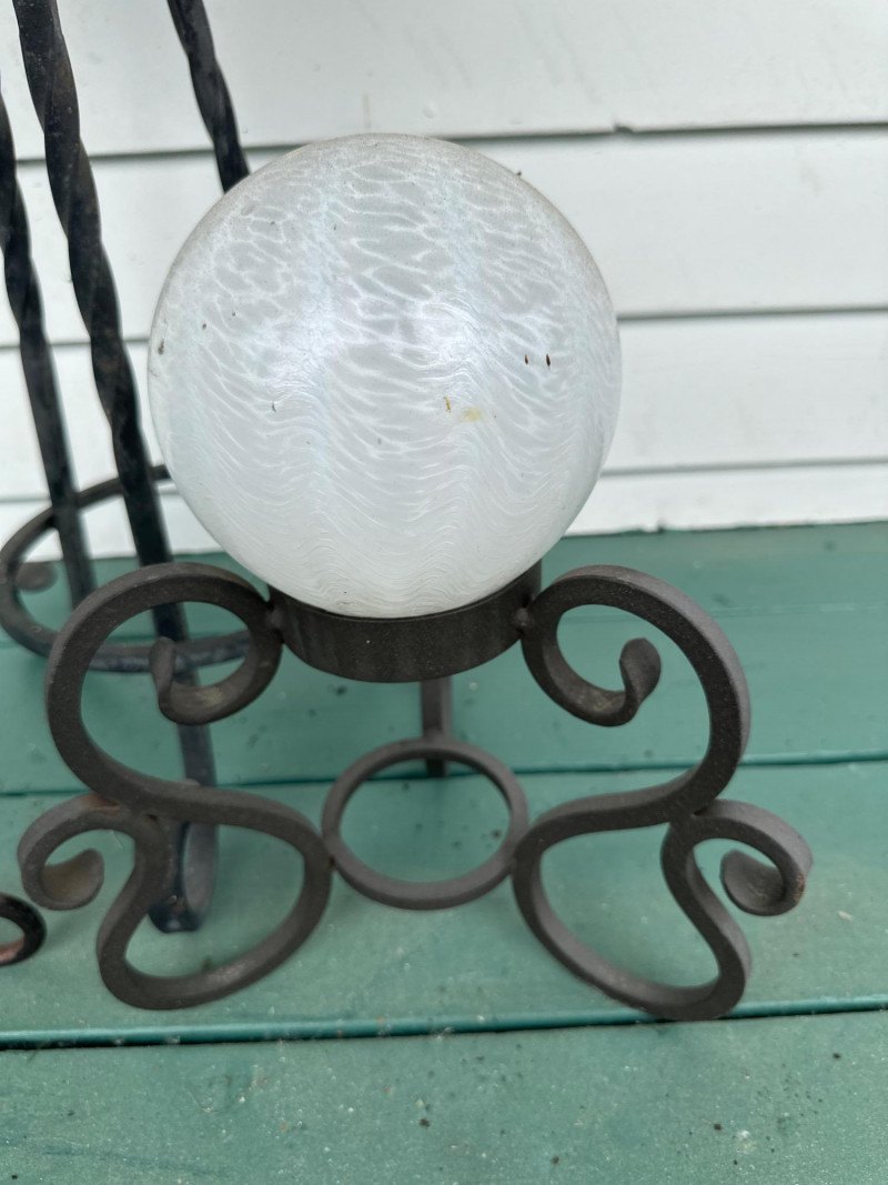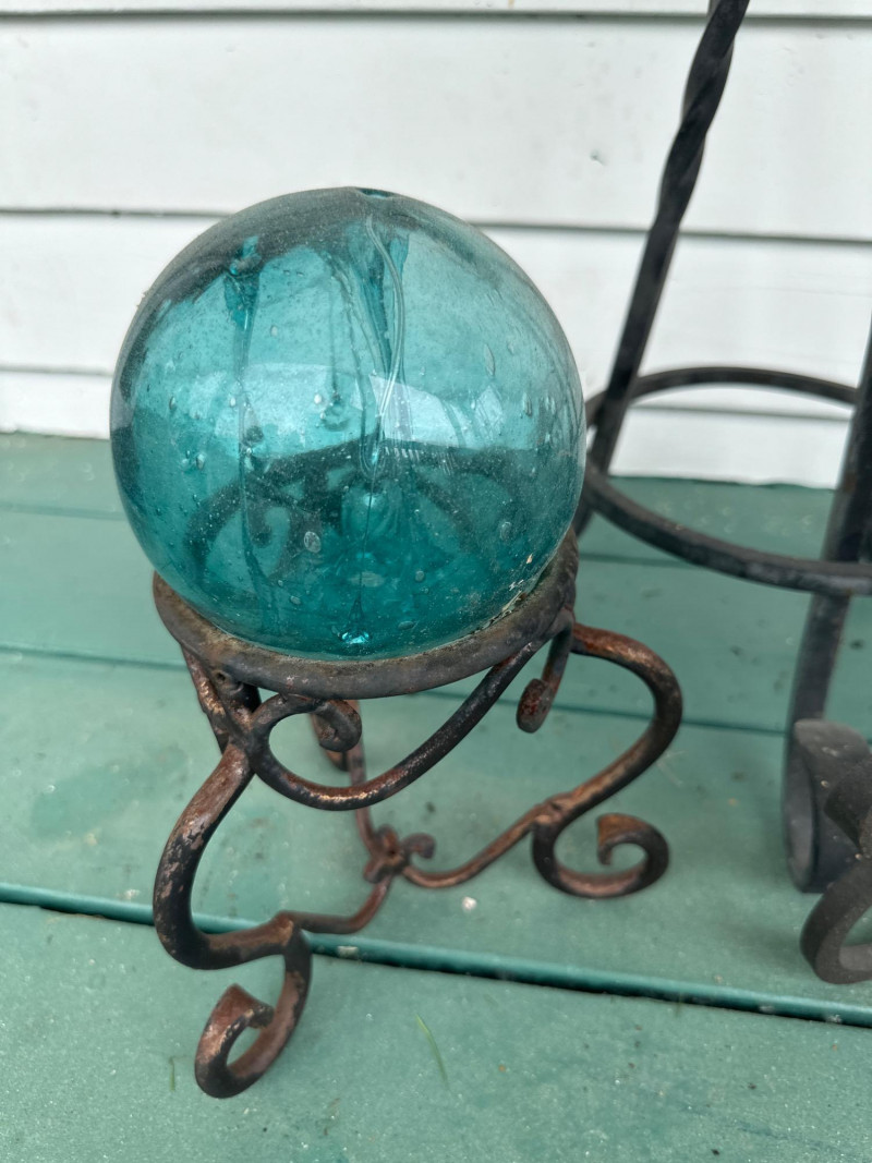 Assortment of Orbs and Wrought Iron Stands Collection of three decorative glass orbs presented with a variety of wrought iron stands and holders. Each orb is uniquely styled and paired with an iron base or holder, creating a visually diverse display. The group includes tall and small stands in scrollwork and candelabra forms, offering multiple height variations and textural contrast between the glass and iron. Orbs: Iridescent crackle glass orb, approx. 9" diameter White textured glass orb, approx. 6" diameter Green glass float orb, approx. 4" diameter Stands and Holders: Tallest wrought iron stand measures approx. 29" in height Smallest stand measures approx. 7" in height Includes a twisted tripod-style stand, low scrollwork base, and scrolled iron supports Two tall candelabra-style holders with curled arms and hanging clear glass or acrylic drops
