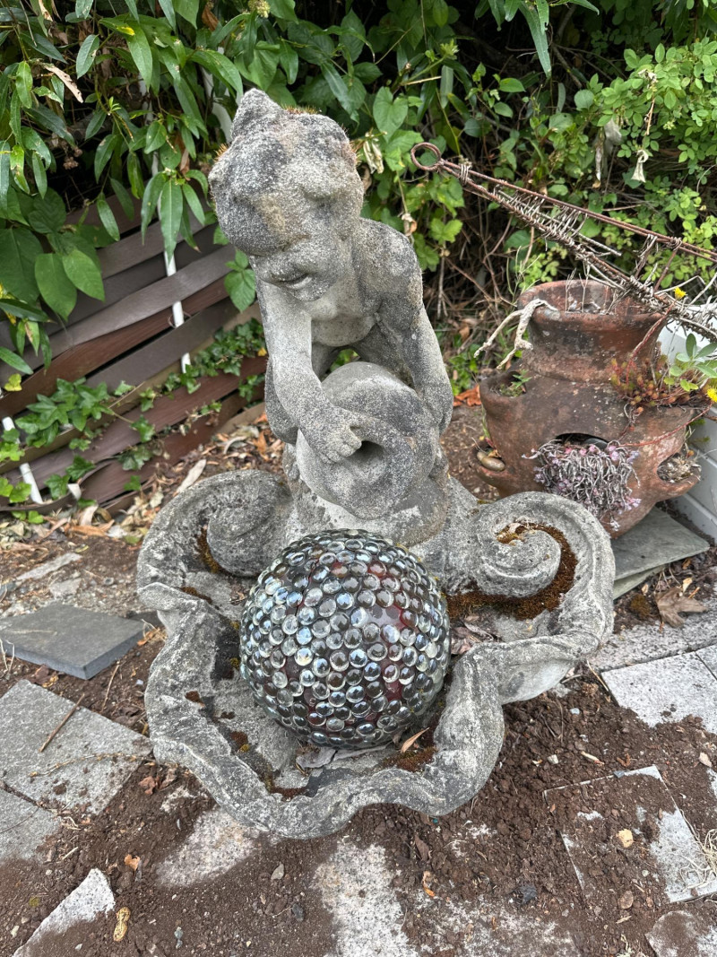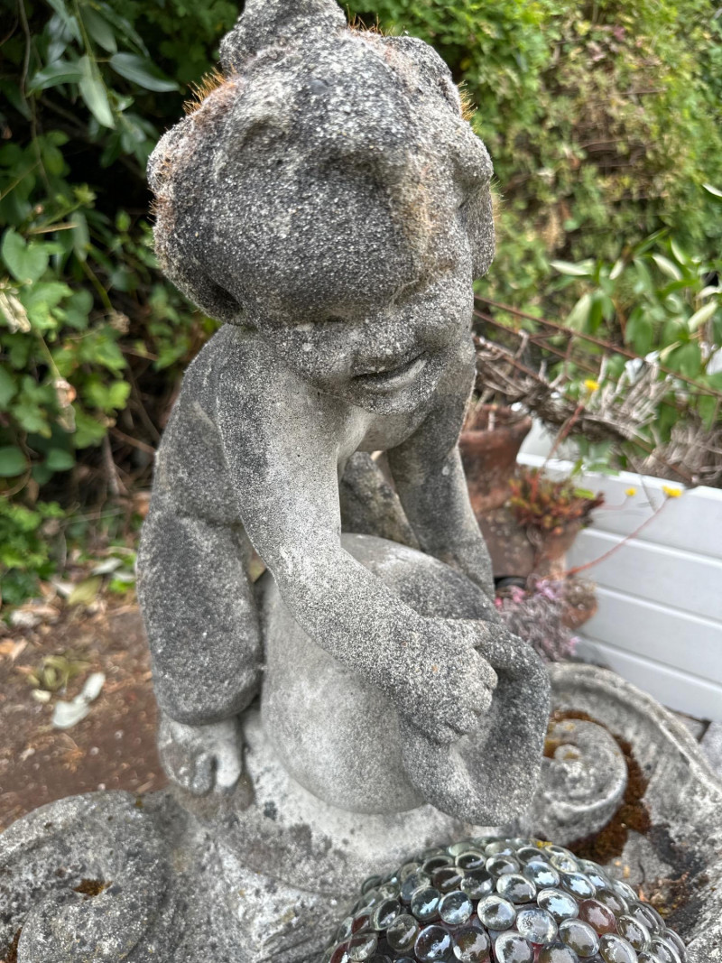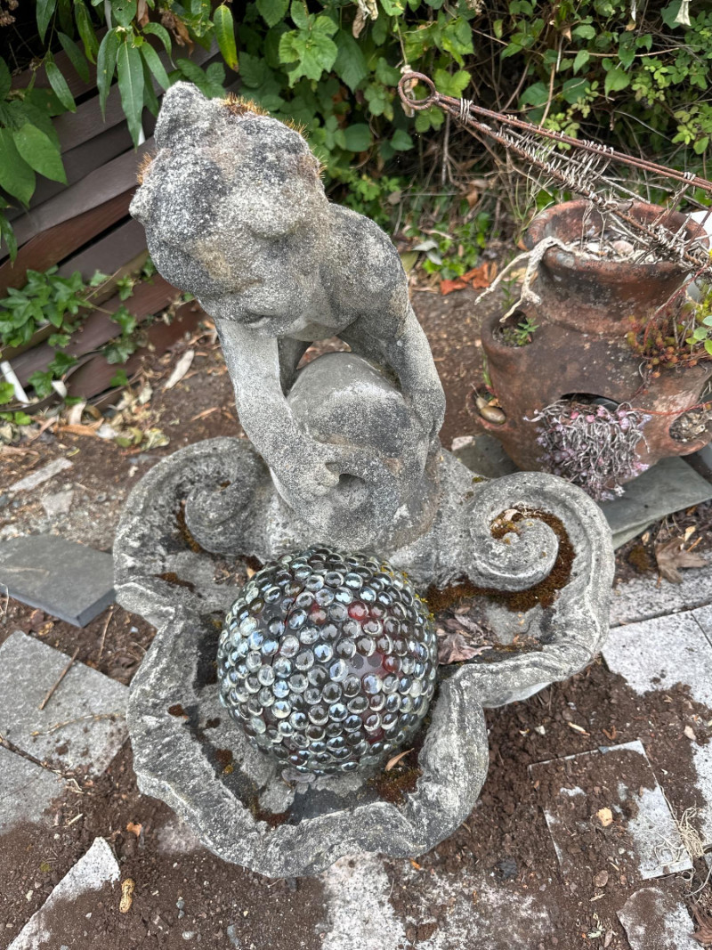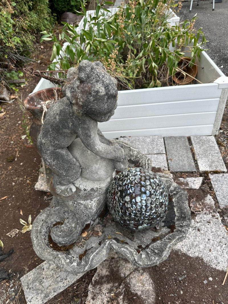 Cement Athens Bird Bath with Glass Orb – 34" x 24" Cement birdbath featuring a sculpted child figure crouching over a decorative glass orb set into a scalloped basin. The orb is embedded with reflective glass accents. Glass orb included. Measurements: