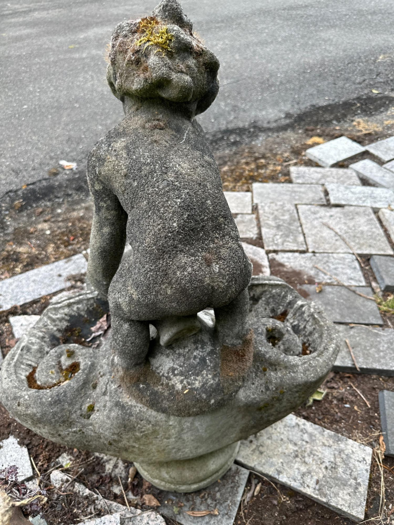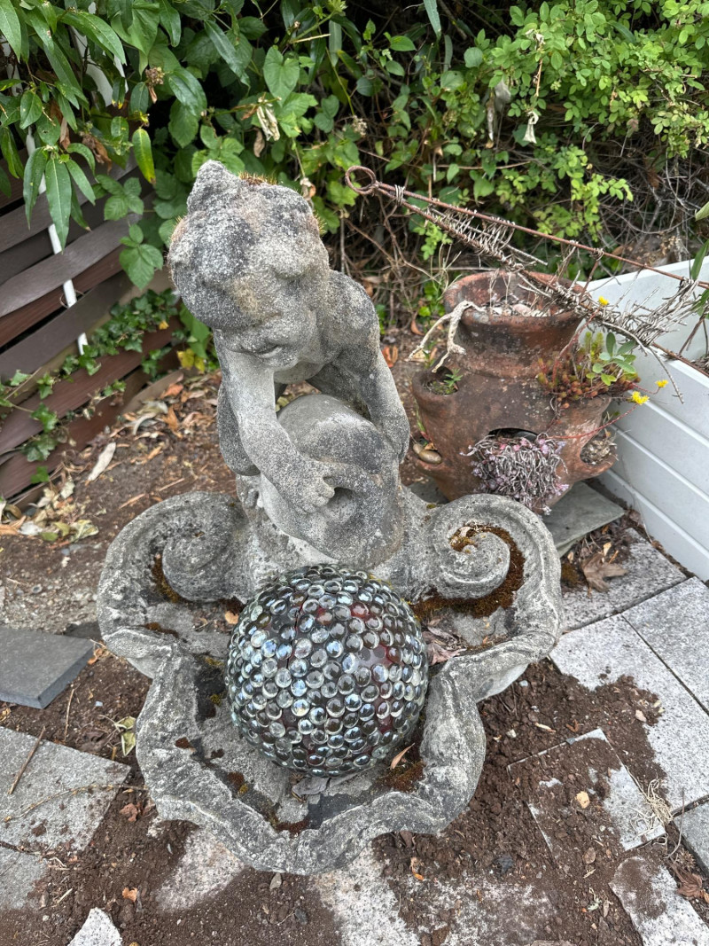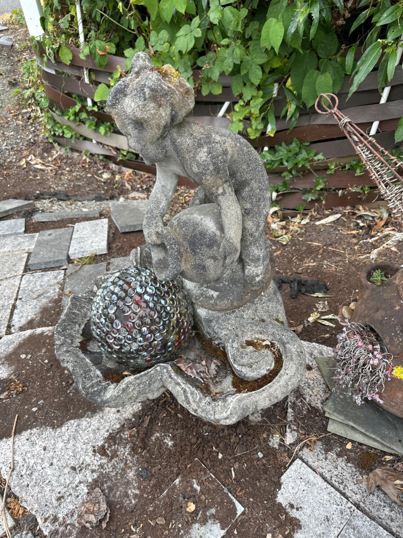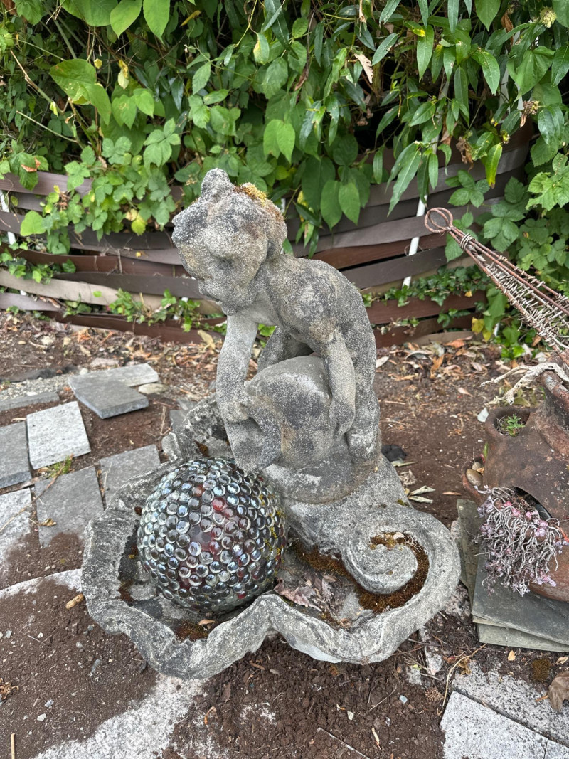 Cement Athens Bird Bath with Glass Orb – 34" x 24" Cement birdbath featuring a sculpted child figure crouching over a decorative glass orb set into a scalloped basin. The orb is embedded with reflective glass accents. Glass orb included. Measurements: