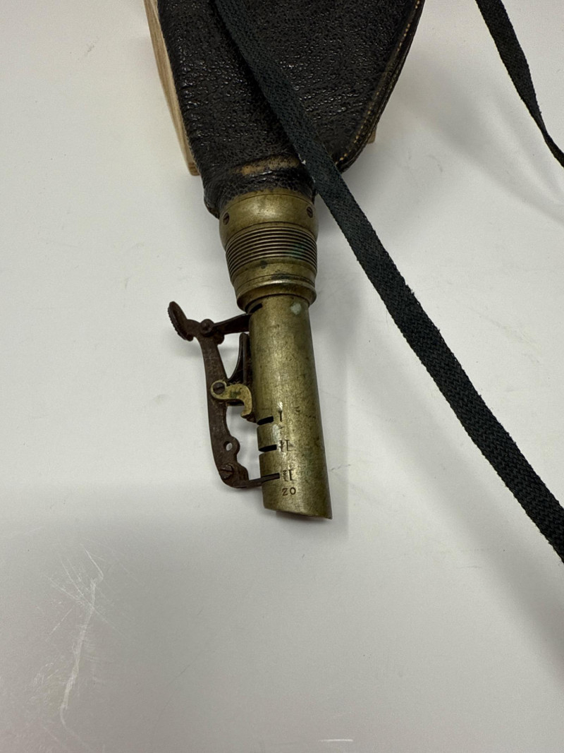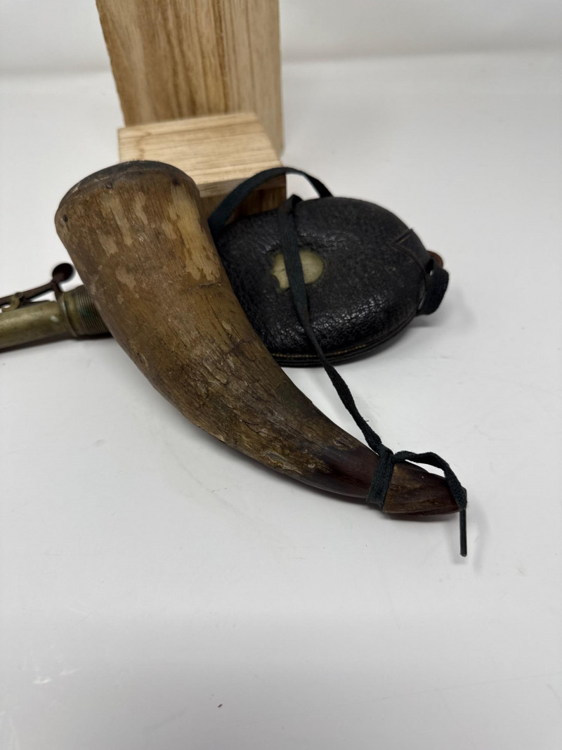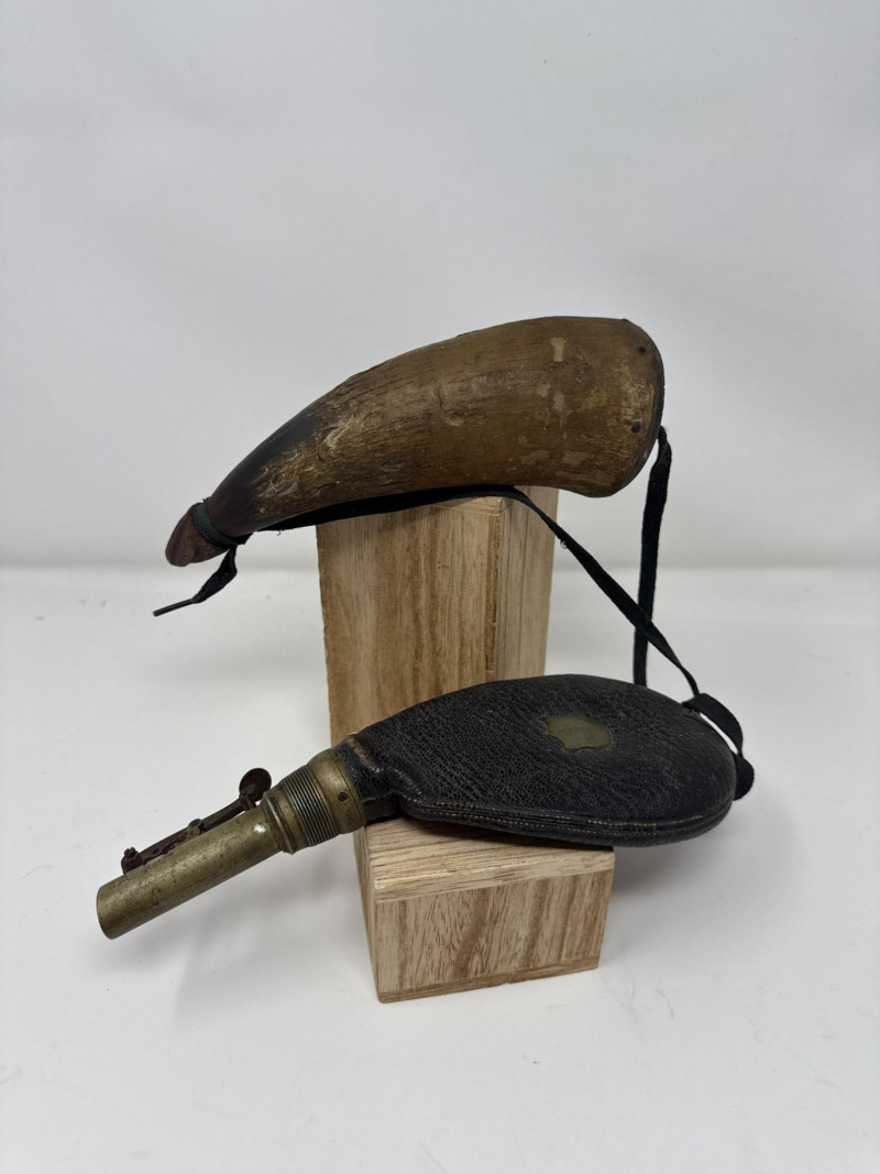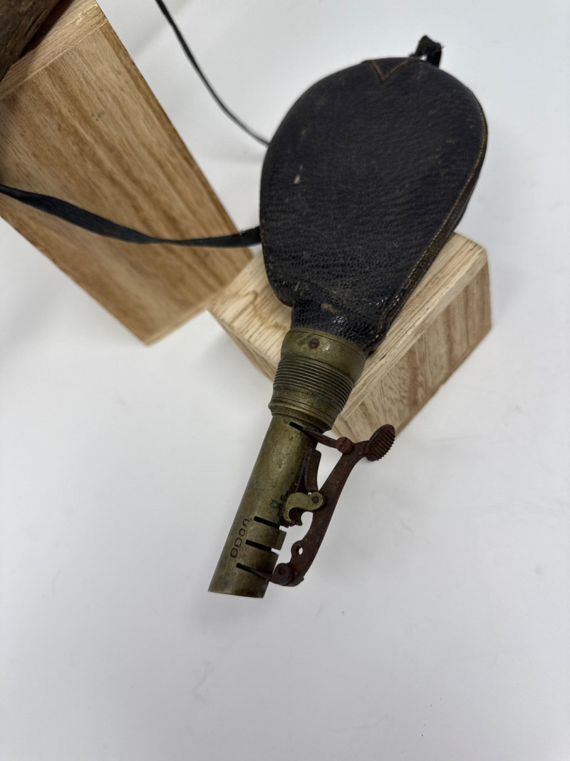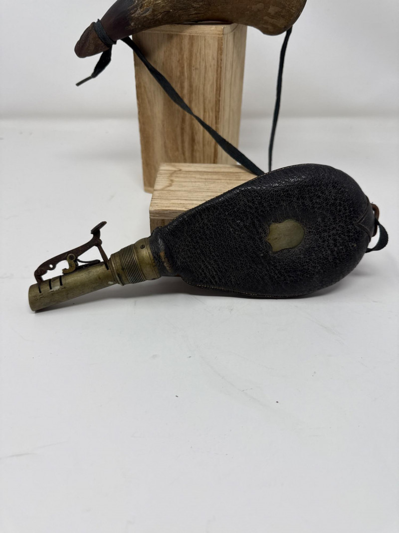 Vintage 1800s James Dixon & Sons Sterling Tip Black Powder Flask Black powder flask by James Dixon & Sons, featuring a leather-covered body, brass dispensing spout, and sterling tip, accompanied by a traditional powder horn. Details: Maker: James Dixon & Sons Era: 1800s Flask Tip: Sterling Flask Material: Leather with brass hardware Note: The horn shows some scrapes and abrasions as pictured.