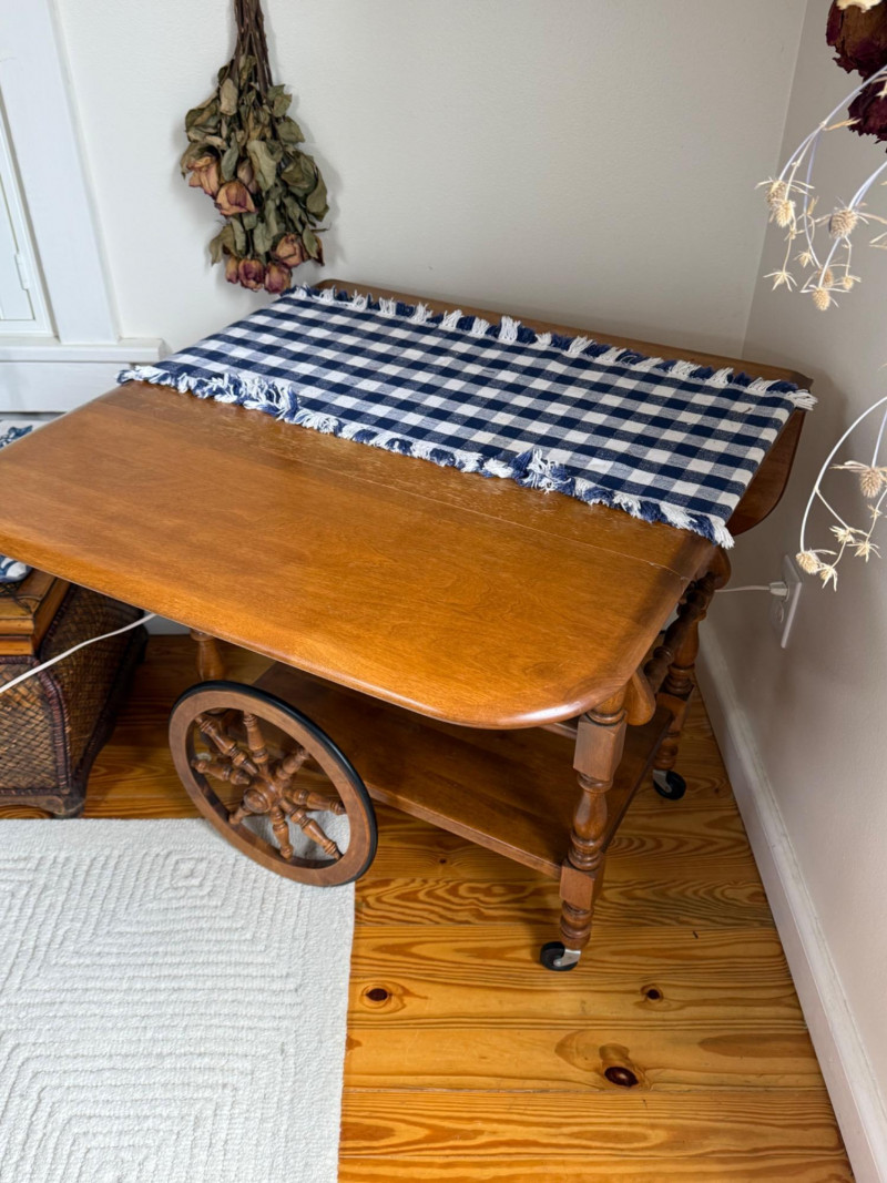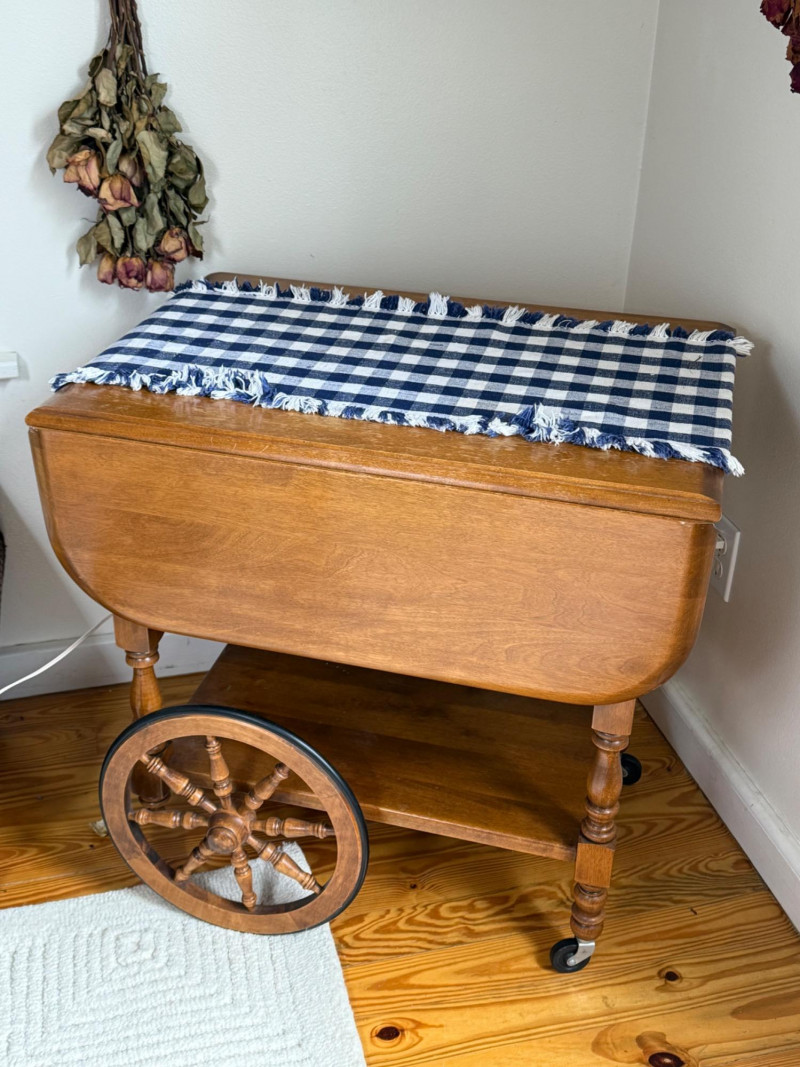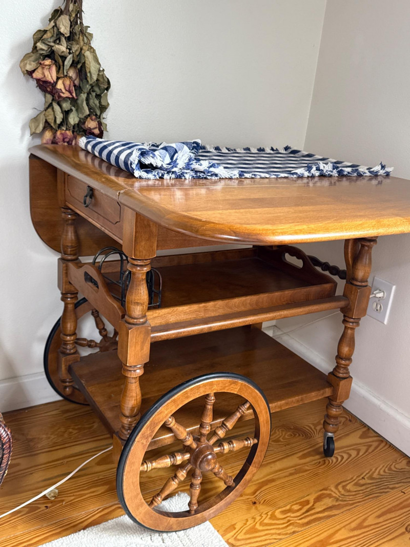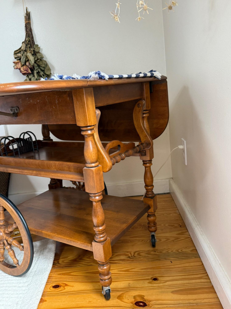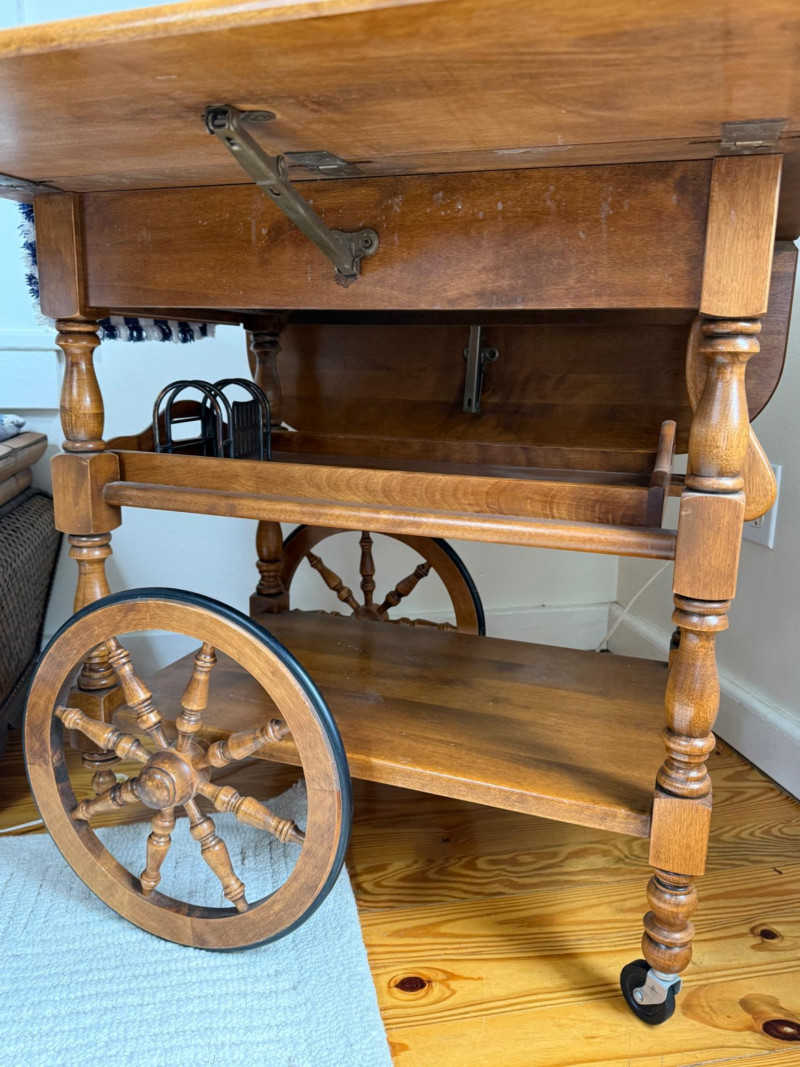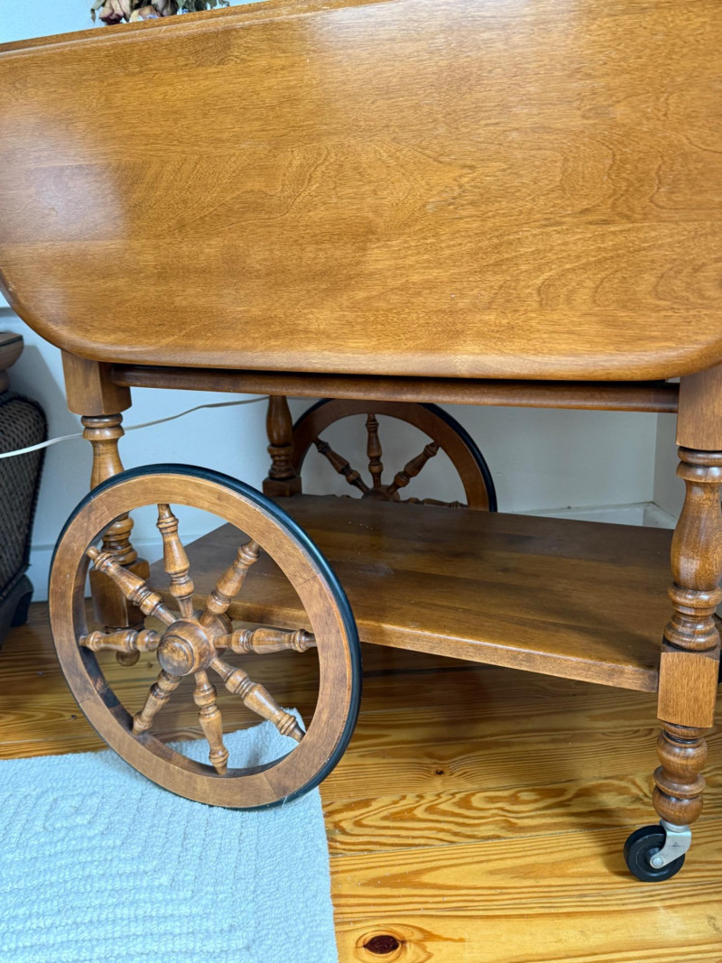 Mid-Century Colonial Style Drop-Leaf Tea or Bar Cart Colonial-style wooden serving cart from the mid-20th century, featuring a drop-leaf table top, turned wood legs, and large spoked wheels. Includes a removable lower shelf tray and a single drawer for storage. The cart is mobile with two small caster wheels at the rear. Details: Style: Mid-century Colonial Features: Drop-leaf top, removable serving tray shelf, single drawer, large spoked wheels, casters Material: Wood Function: Tea cart, bar cart, or side server Measurements: Height: 29" (73.7 cm) Length (Closed): 32" (81.3 cm) Width (Closed): 20.75" (52.7 cm) Width (Open): 41" (104.1 cm) Shelf Height: 10" (25.4 cm)