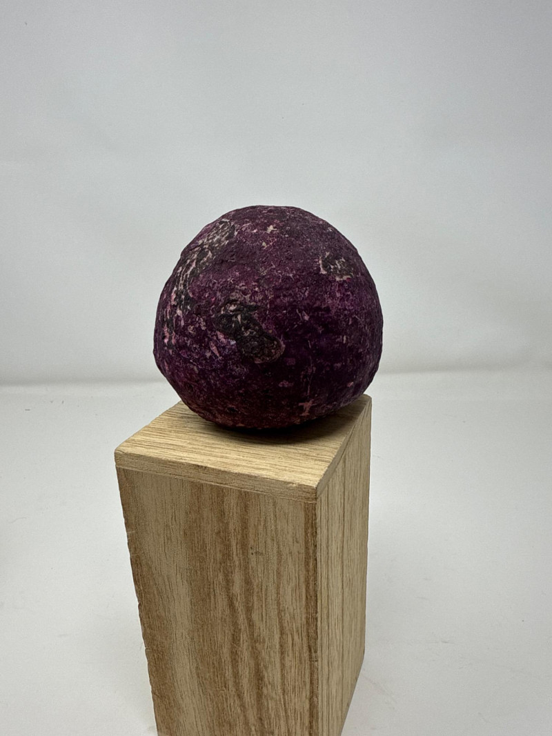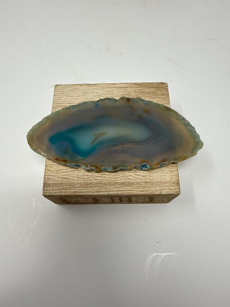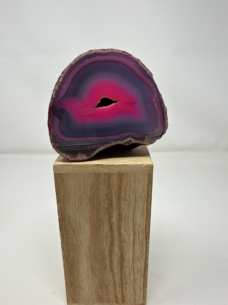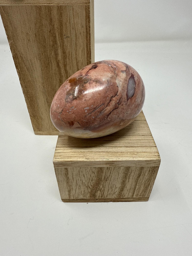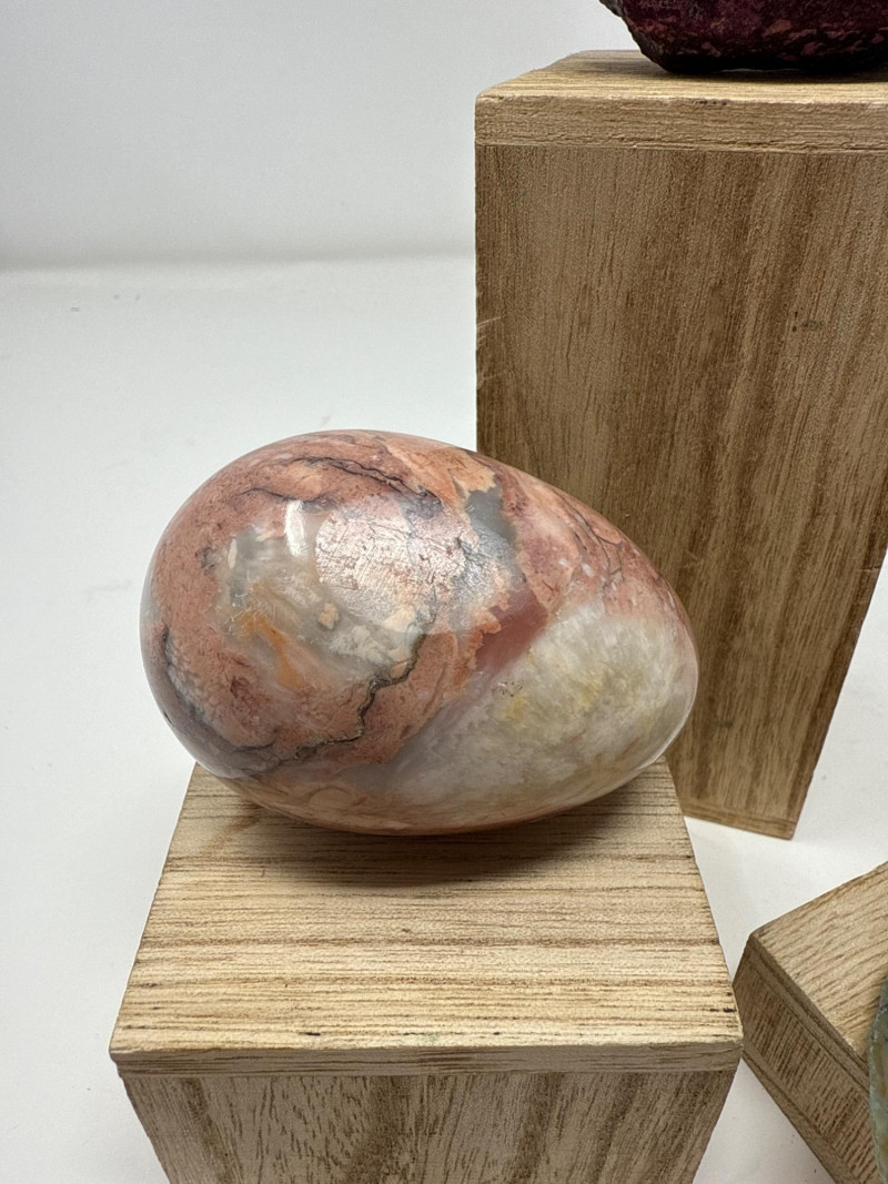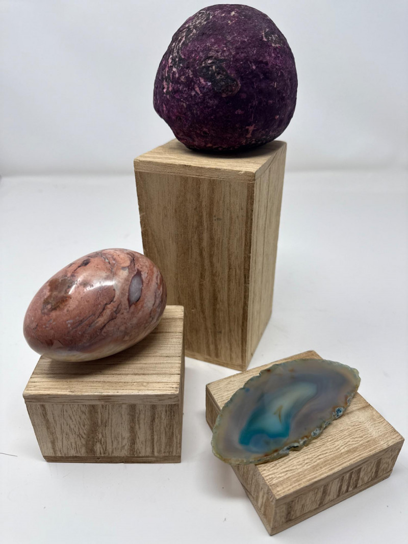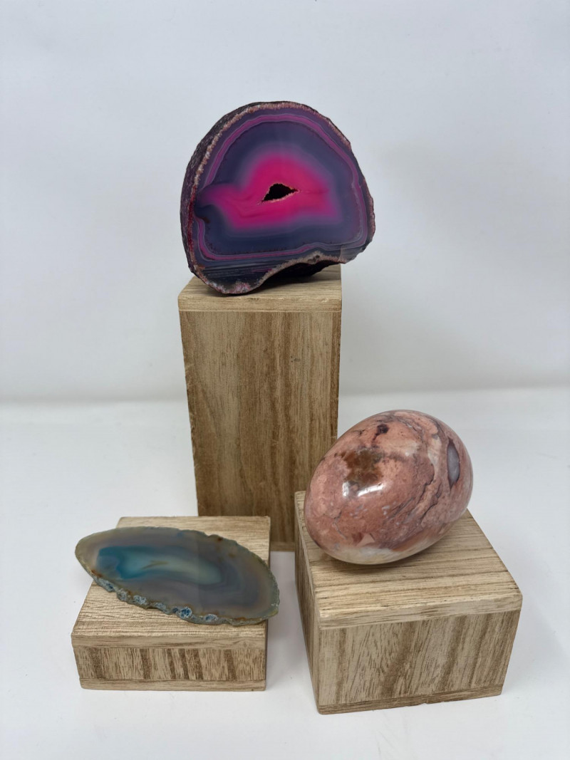 Lot of Geodes & Mineral Specimens Group of decorative stones displayed on wooden stands. Includes a polished pink-and-black sliced stone, a rose-colored oval stone with a smooth finish, and a flat blue-toned stone with natural edge detail. Each piece varies in shape, color, and surface texture.