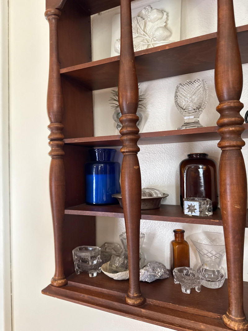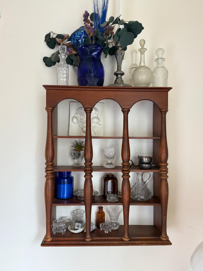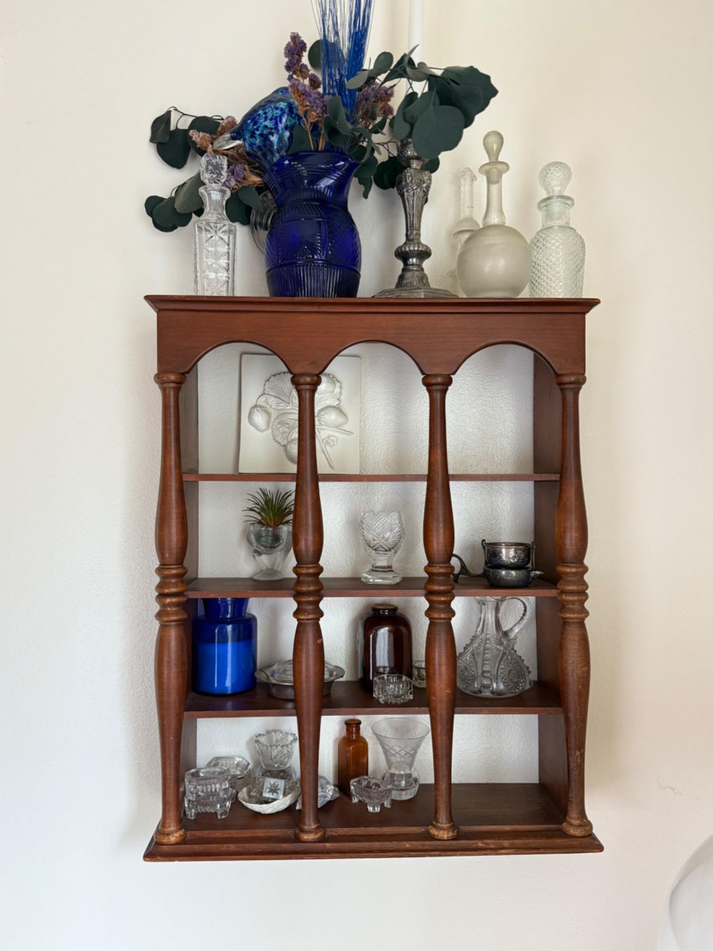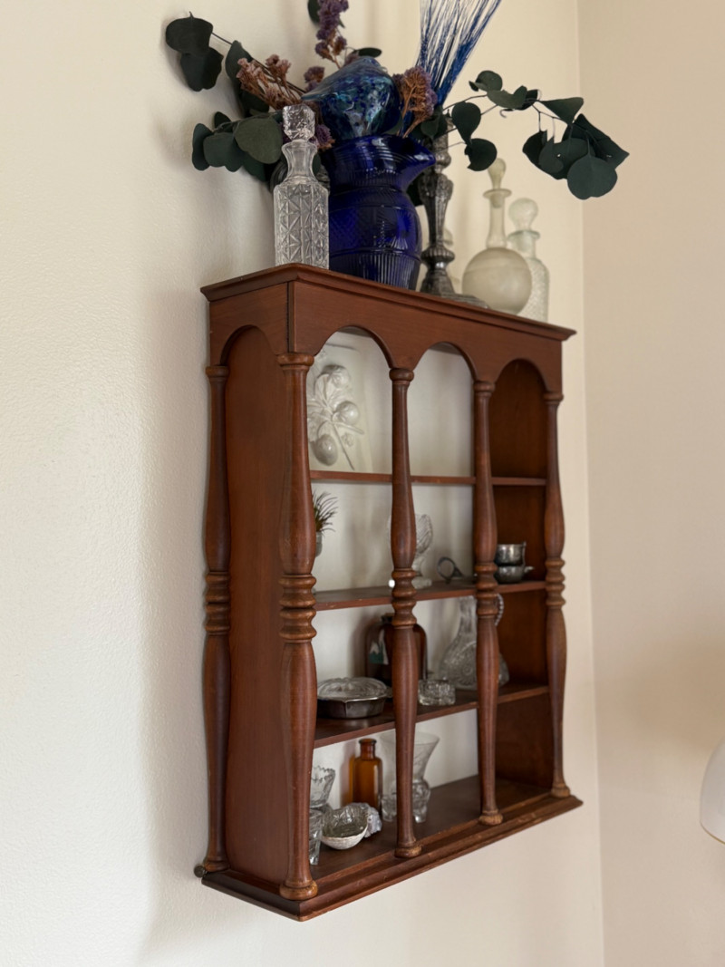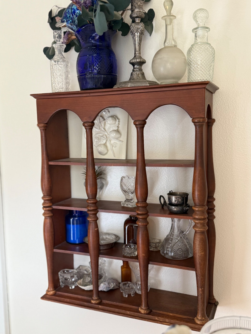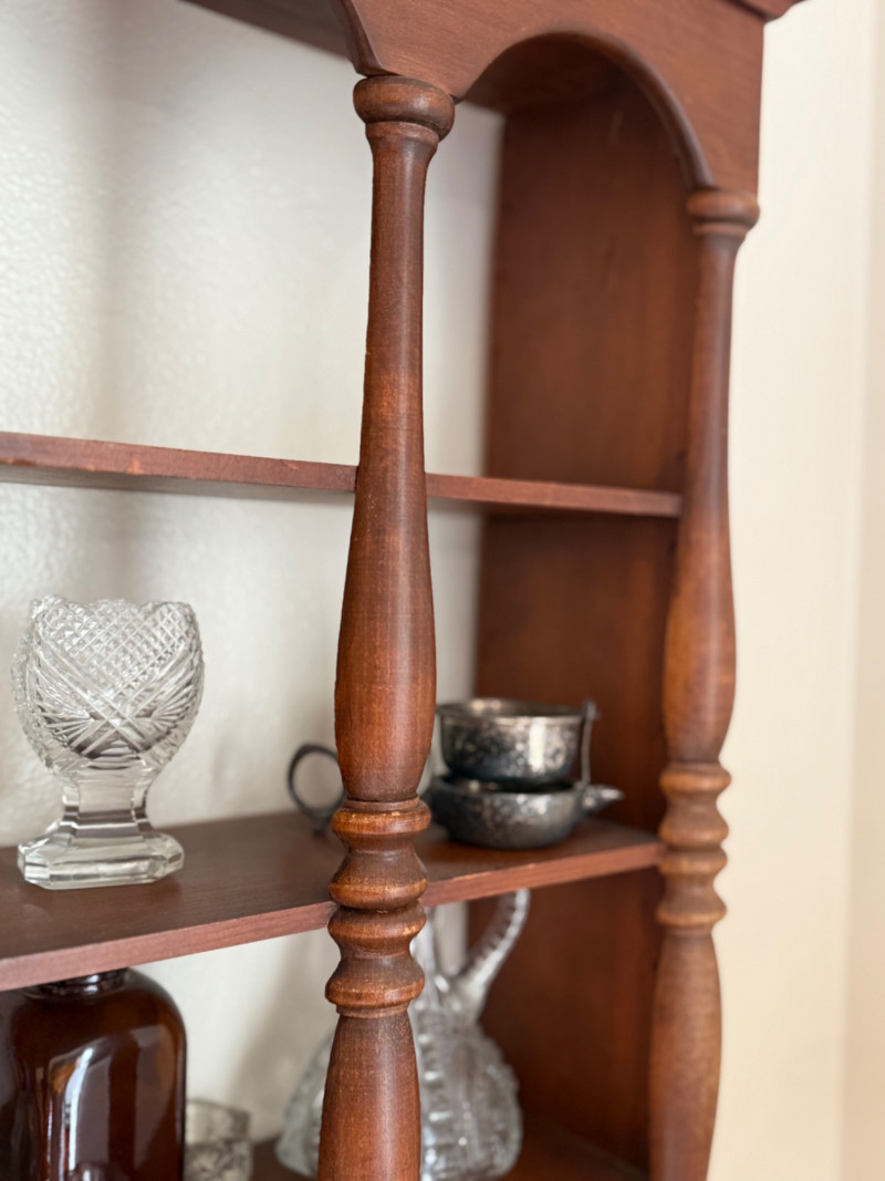 Vintage Wood 4-Tier Wall Shelf with Accessories Wall-mounted wooden shelving unit stained in a reddish-brown or cherry tone. Features turned half-spindle columns across the front and four fixed shelves. Comes with a collection of glass and metal accessories, including vases, bottles, and small containers. Details: Material: Wood (type unspecified), stained finish Features: 4 fixed shelves, 3-section front with turned half spindles Measurements: Overall: 19" W x 5.5" D x 22.75" H Shelf spacing: 4.5" Pillar spacing: 4.5" Condition: