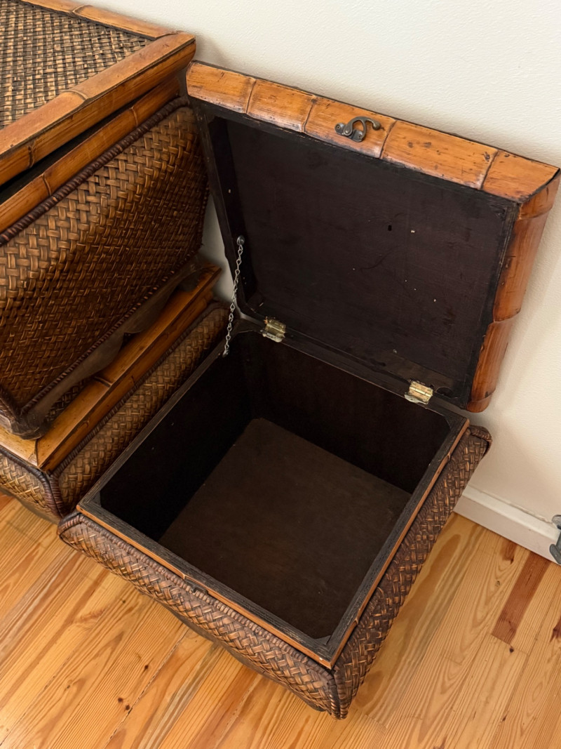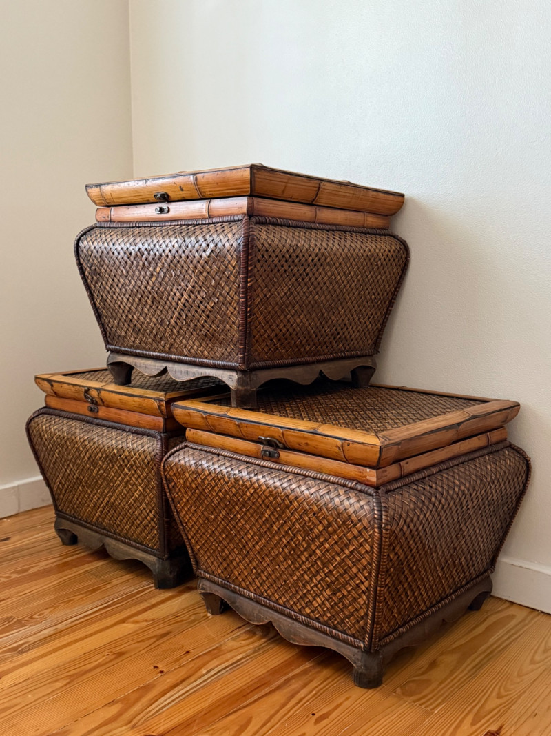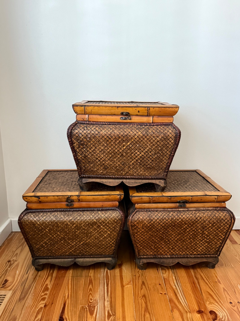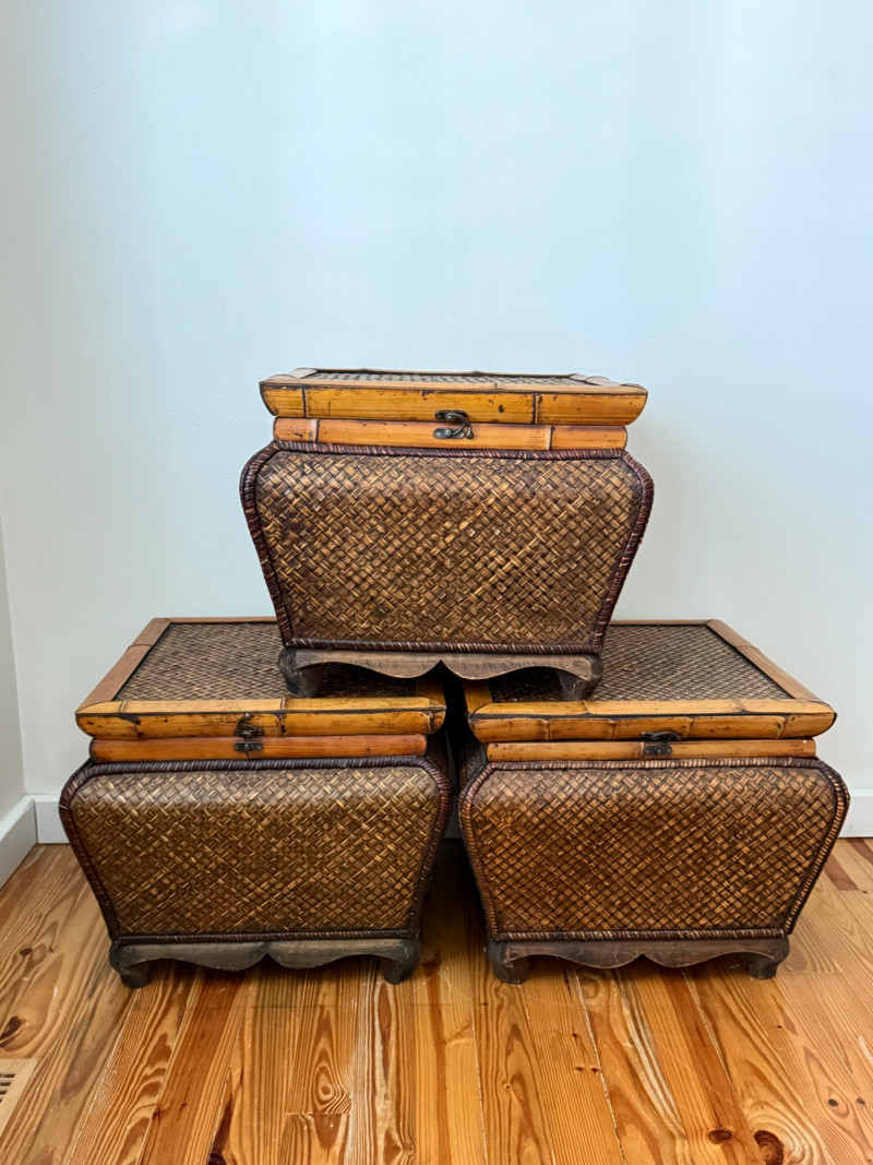 Set of 3 Vintage Rattan Storage Boxes with Lids Woven rattan and bamboo storage chests featuring curved forms, scalloped wood bases, and hinged lids with metal latches. All three boxes are identical in size and design, ideal for stacking or use as standalone storage. Details: Quantity: 3 boxes Material: Woven rattan with bamboo trim and wooden base Closure: Hinged lid with metal latch Approximate Dimensions (each): Width: 21 inches Height: 17 inches Depth: 19 inches (with lid closed)