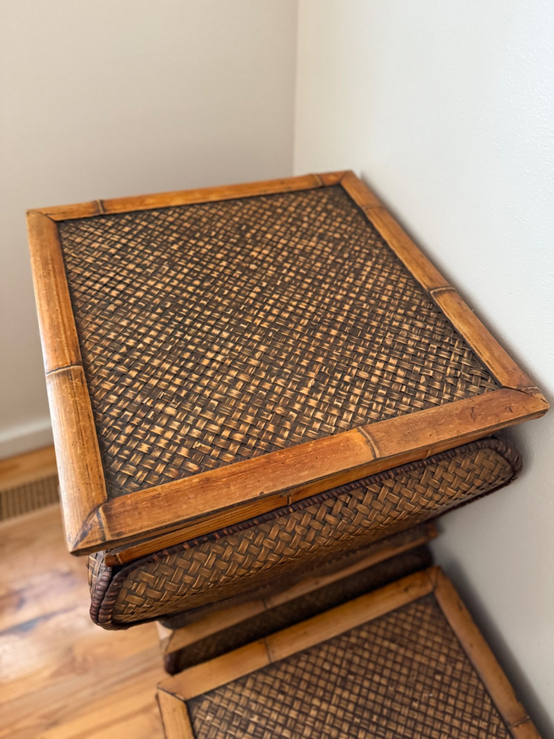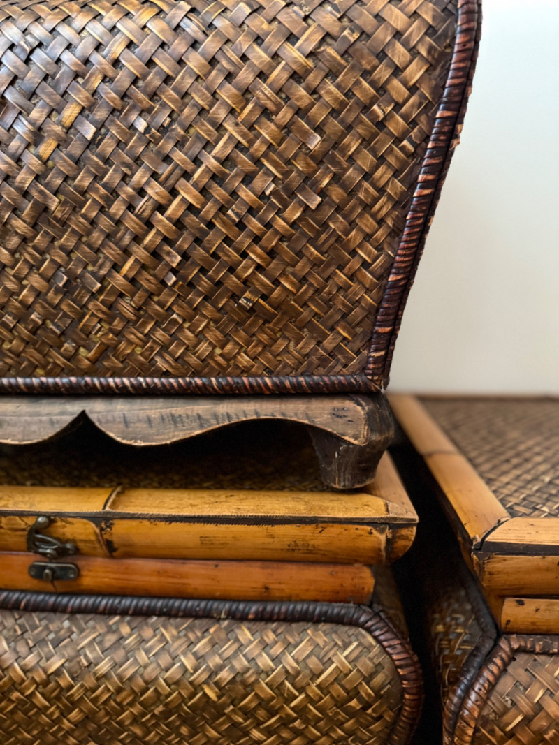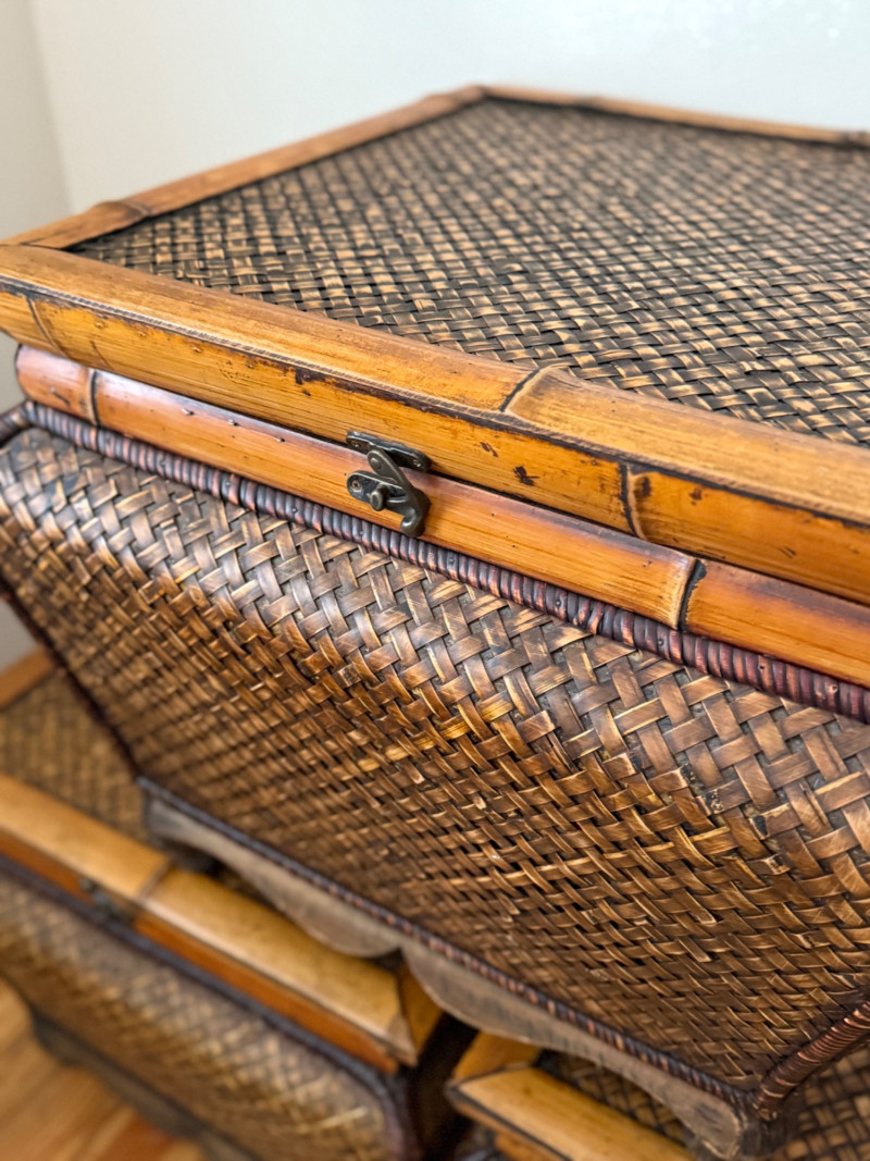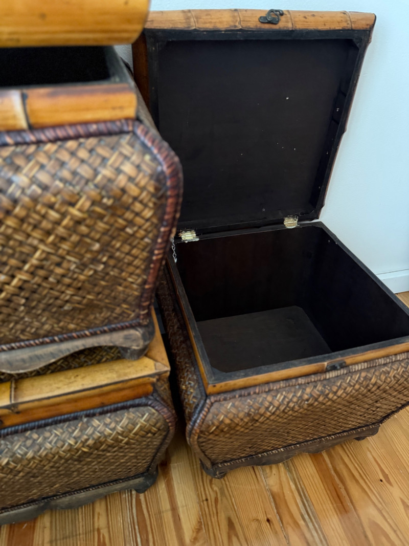 Set of 3 Vintage Rattan Storage Boxes with Lids Woven rattan and bamboo storage chests featuring curved forms, scalloped wood bases, and hinged lids with metal latches. All three boxes are identical in size and design, ideal for stacking or use as standalone storage. Details: Quantity: 3 boxes Material: Woven rattan with bamboo trim and wooden base Closure: Hinged lid with metal latch Approximate Dimensions (each): Width: 21 inches Height: 17 inches Depth: 19 inches (with lid closed)
