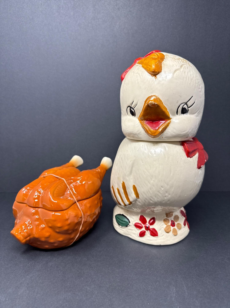 Vintage 1940s Chicken Cookie Jar and Turkey Gravy Boat Set includes a ceramic chicken-shaped cookie jar and a lidded turkey-shaped gravy boat. The cookie jar is decorated with painted floral details and a red bow. The gravy boat resembles a roasted turkey with removable top. Includes: 1 Chicken Cookie Jar 1 Turkey Gravy Boat Condition: Chicken jar has visible wear, including scratches and tape residue at the head joint.