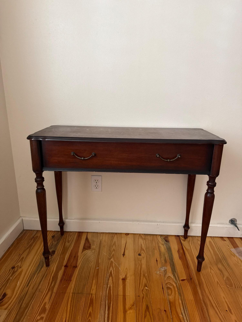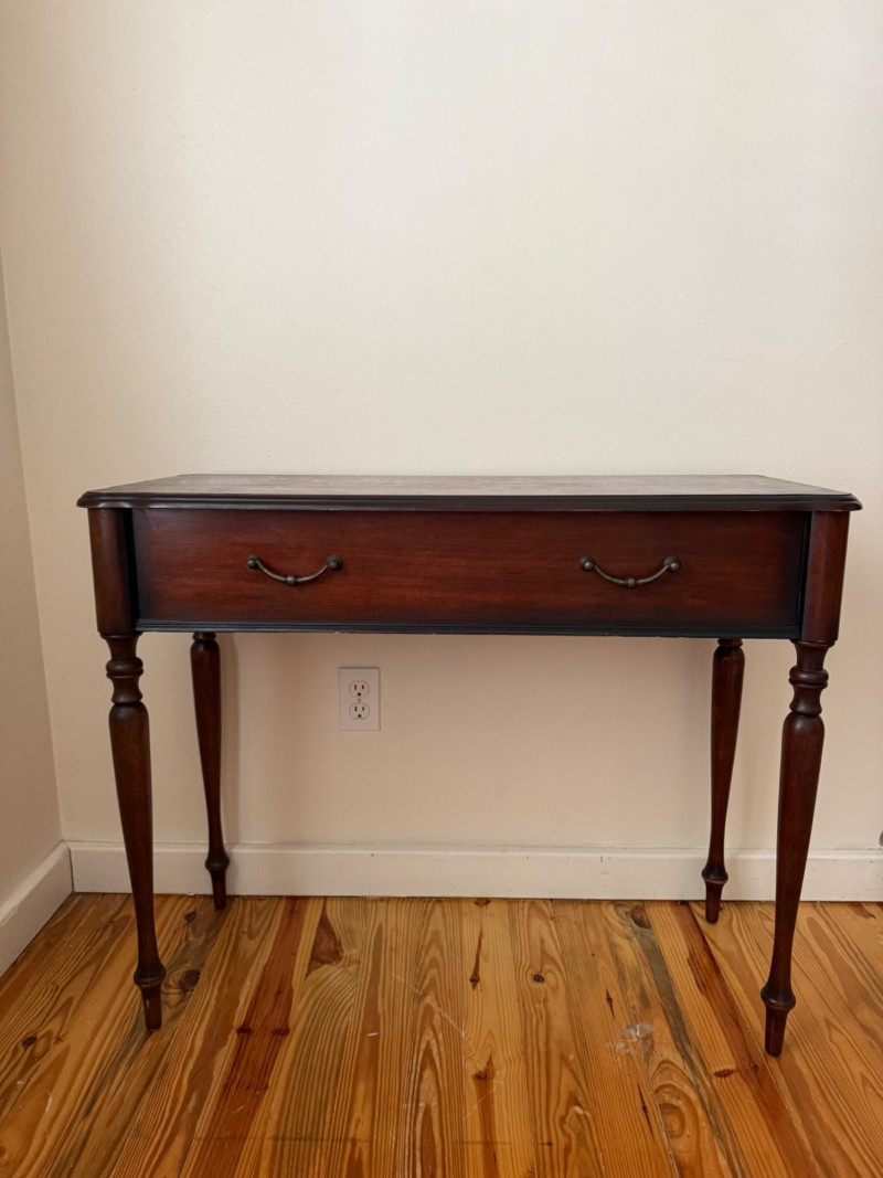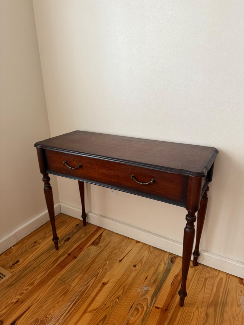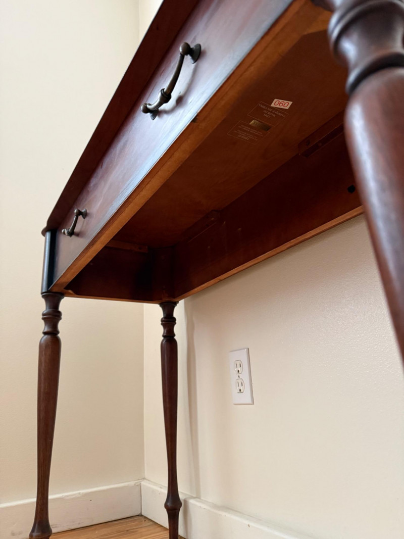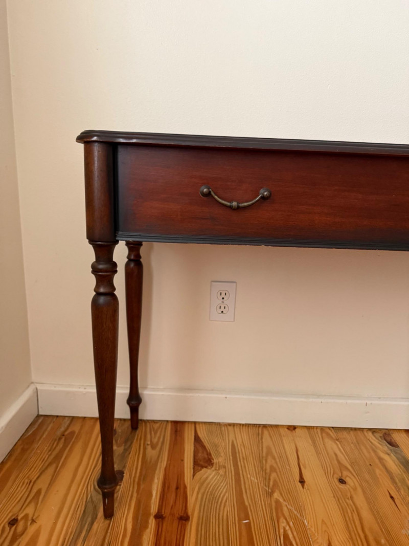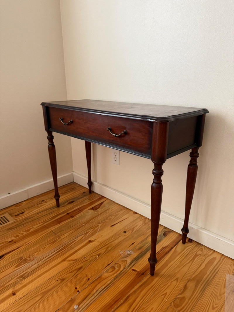 Vintage 1999 Bombay Company Mahogany Wood Entry Table Mahogany wood entry table by Bombay Company, dated 1999. Features a faux front drawer with two brass-style handles and turned legs. The tabletop has gently contoured edges and a dark stained finish. Dimensions: