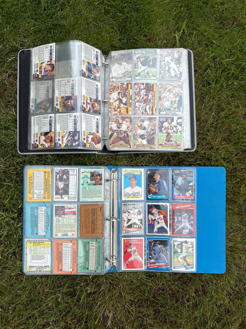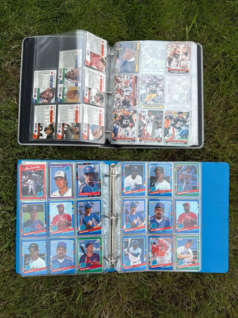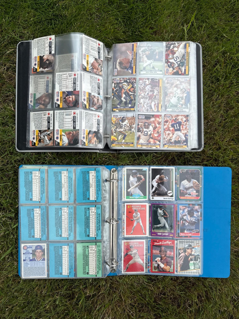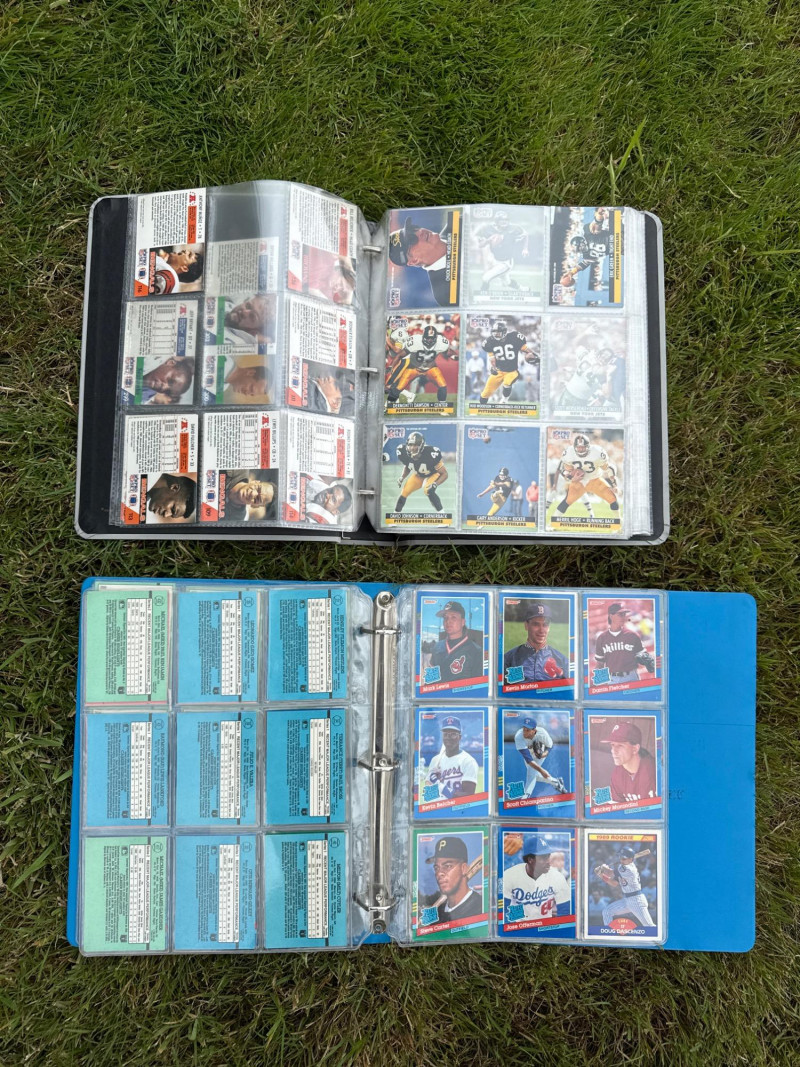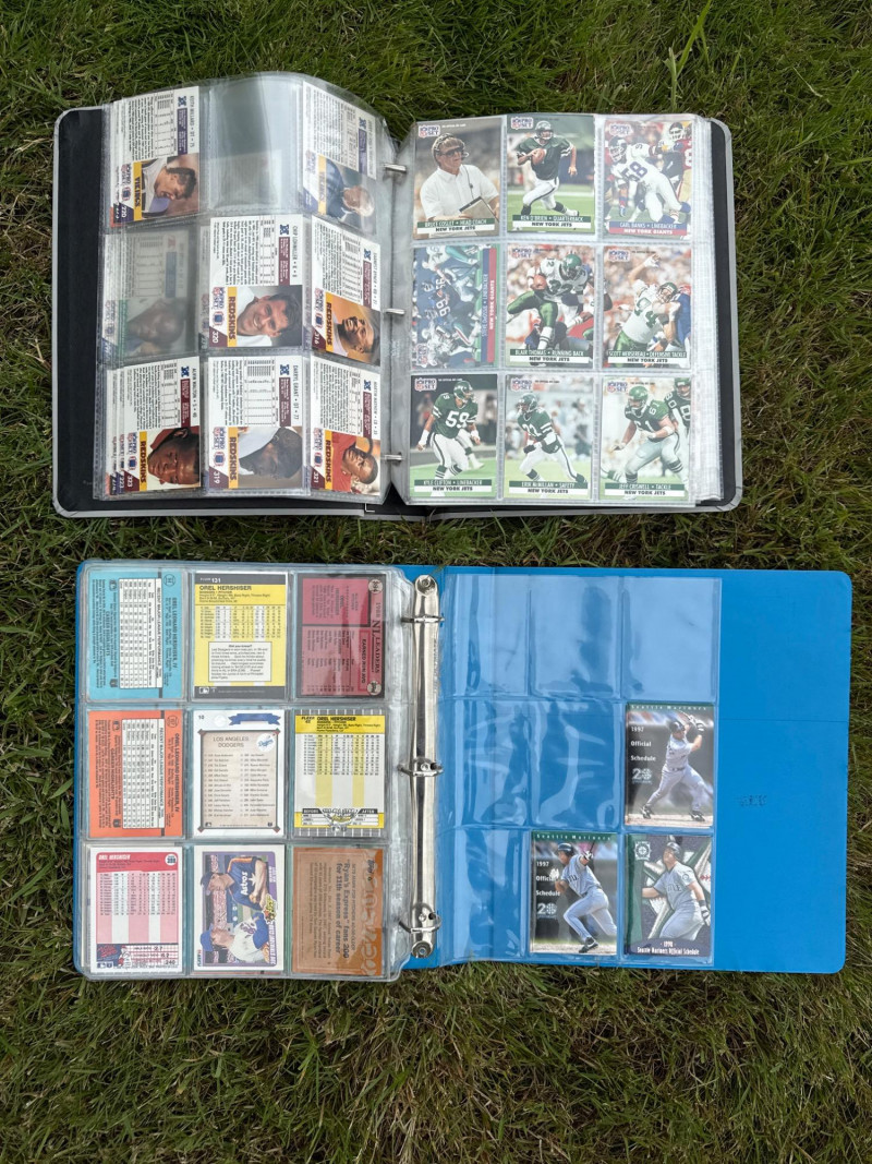 Vintage Baseball and Football Card Lot Large mixed lot of vintage sports trading cards featuring primarily football cards, with a selection of baseball cards included. Football cards span several teams and players, housed in a black binder. Baseball cards are organized in a separate blue binder, and include various players and card styles. Type: Football and Baseball Cards Storage: Two binders (1 grey, 1 blue)