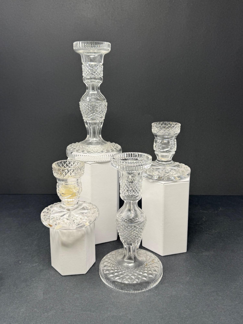 Waterford Crystal Candlestick Set Assortment of four cut glass candlesticks in the style of Waterford, each featuring a combination of hobstar, diamond, and fan patterns. Varying in height and base diameter, the set includes two taller and two shorter holders, each with a flared rim and faceted detailing. Details: Quantity: 4 candlesticks Style: Waterford-style cut glass Smallest: 3.5" H x 3.5" W Largest: 7.5" H x 4" W