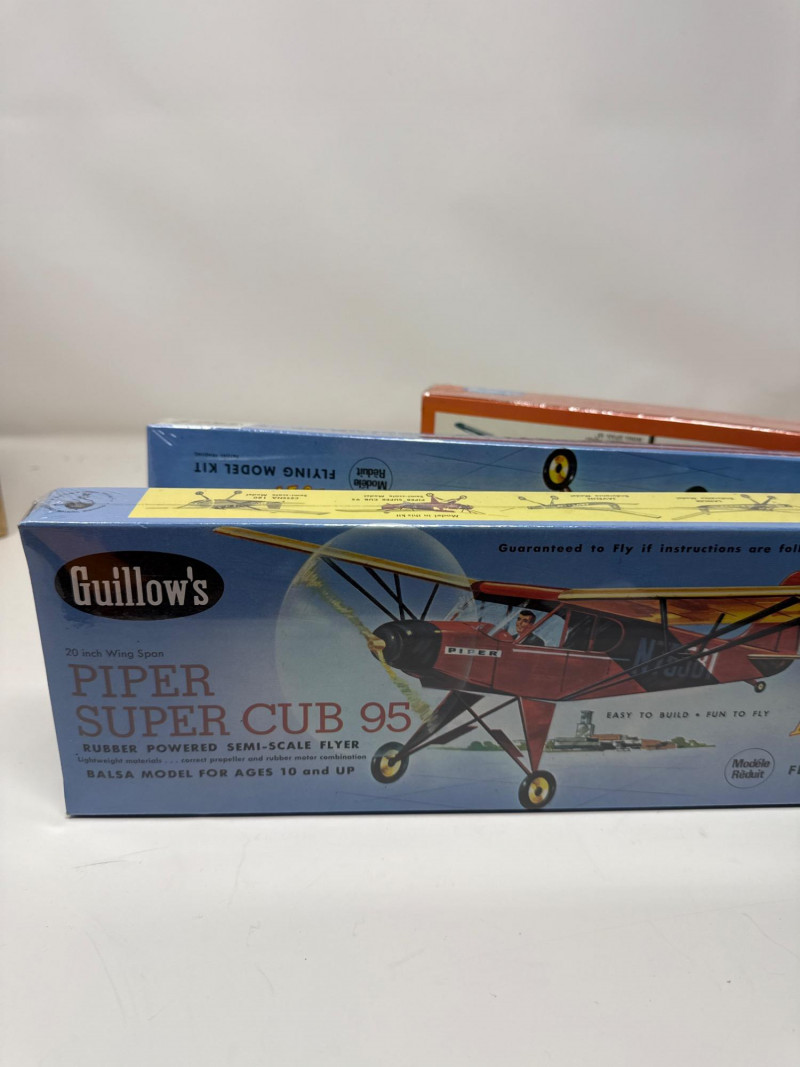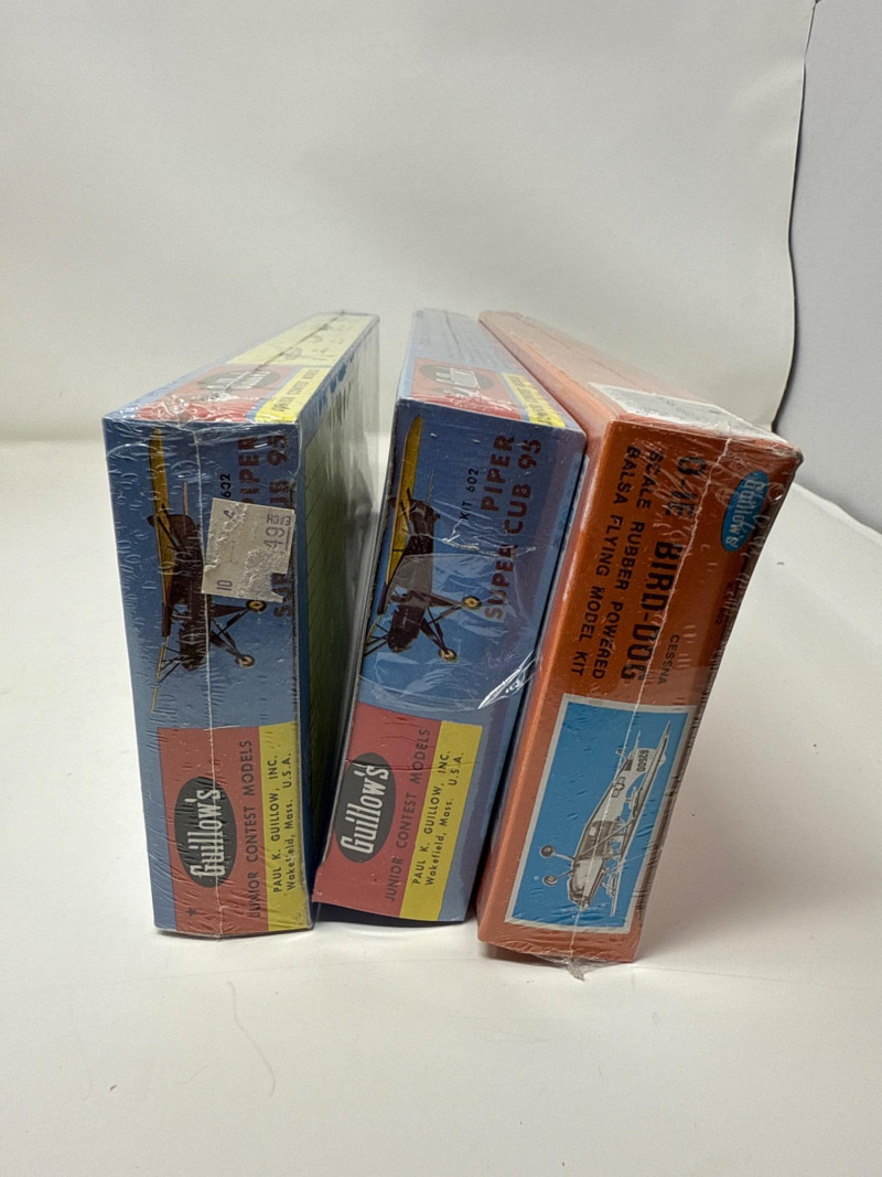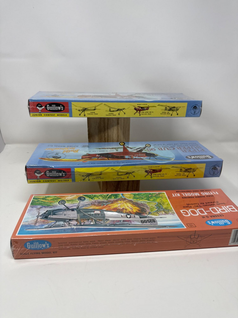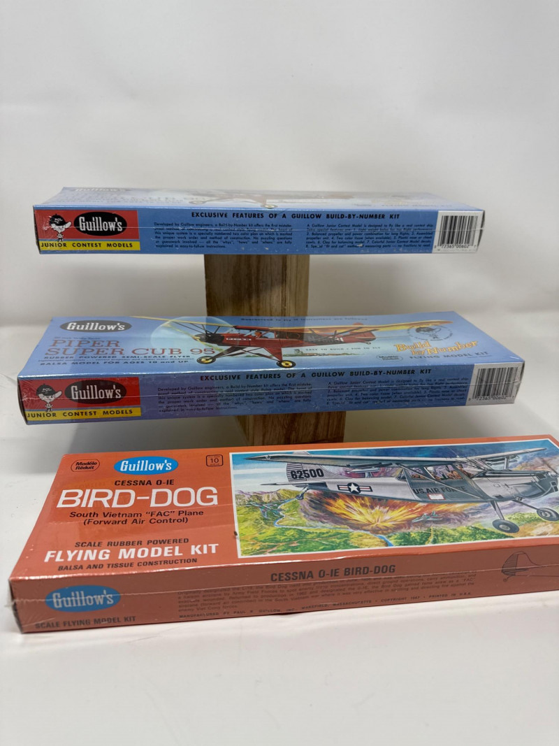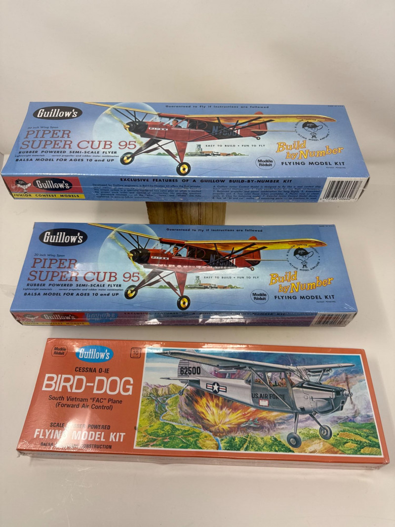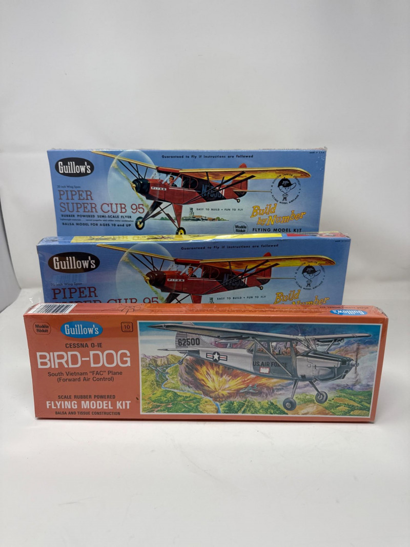 Vintage Guillows Model Kit Lot Lot of three vintage Guillows flying model kits, all sealed in original packaging. Includes two “Piper Super Cub 95” rubber-powered balsa wood kits and one “Cessna O-1E Bird-Dog” Vietnam FAC plane kit. Each kit features “Build by Number” construction and is designed for ages 10 and up. Models Included: (2) Piper Super Cub 95 (1) Cessna O-1E Bird-Dog