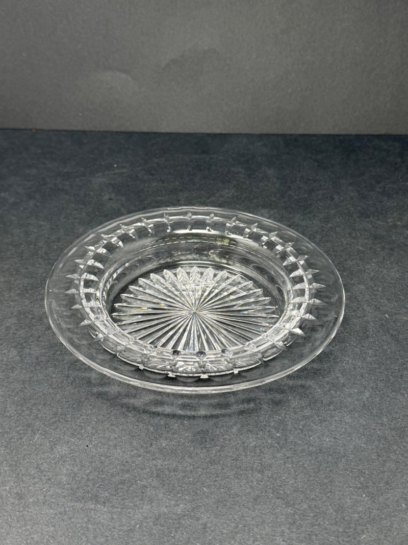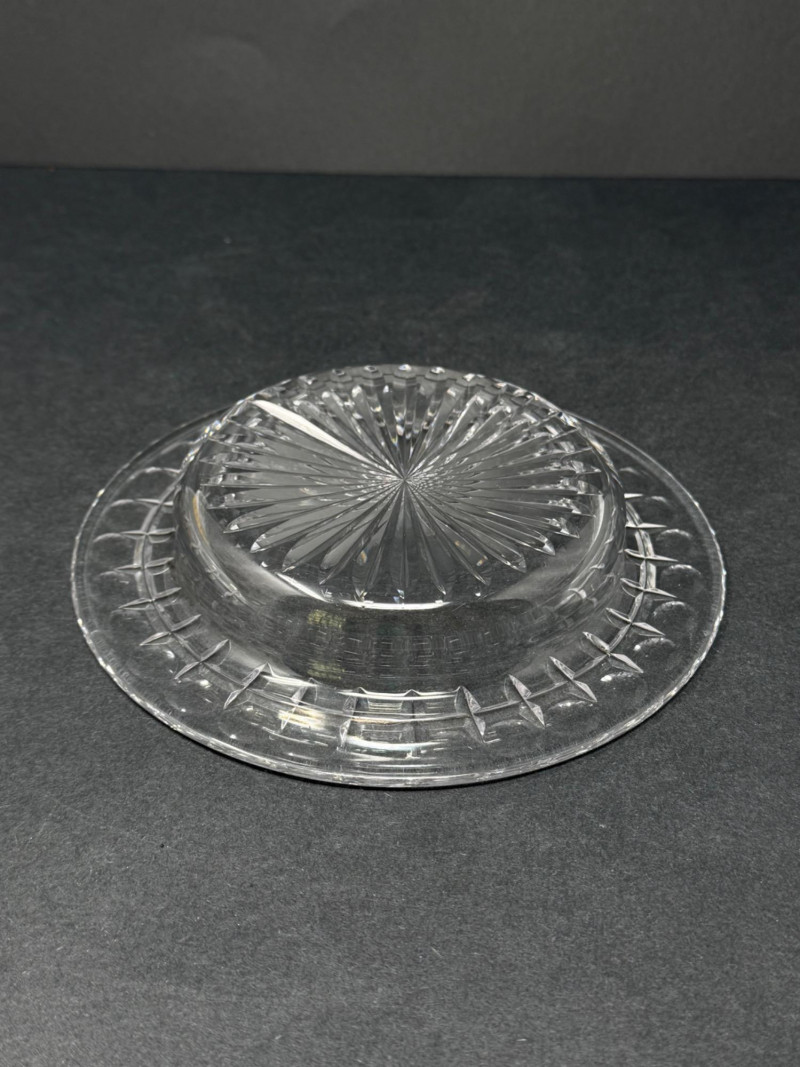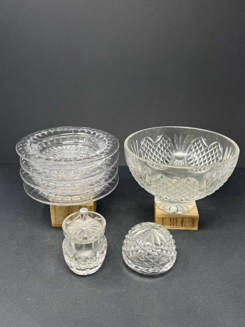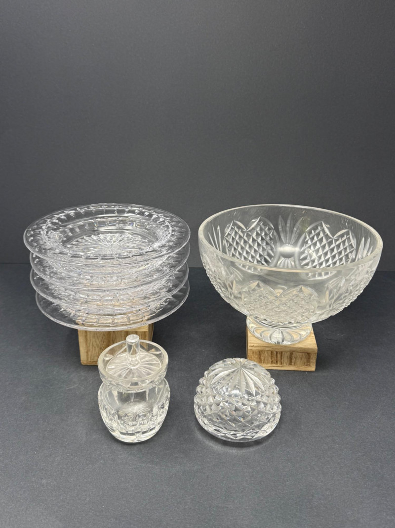 Waterford Crystal Style Glassware Set Collection of cut glass items in the style of Waterford, including plates, a footed bowl, a lidded jar, and a faceted paperweight. Each piece features patterns such as crosshatch, starburst, or fan cuts. Details: Plates (4): 7" diameter Footed Bowl: 8" diameter at top Lidded Jar: Approx. 5.5" H x 3" W Paperweight: 3.5" diameter at base