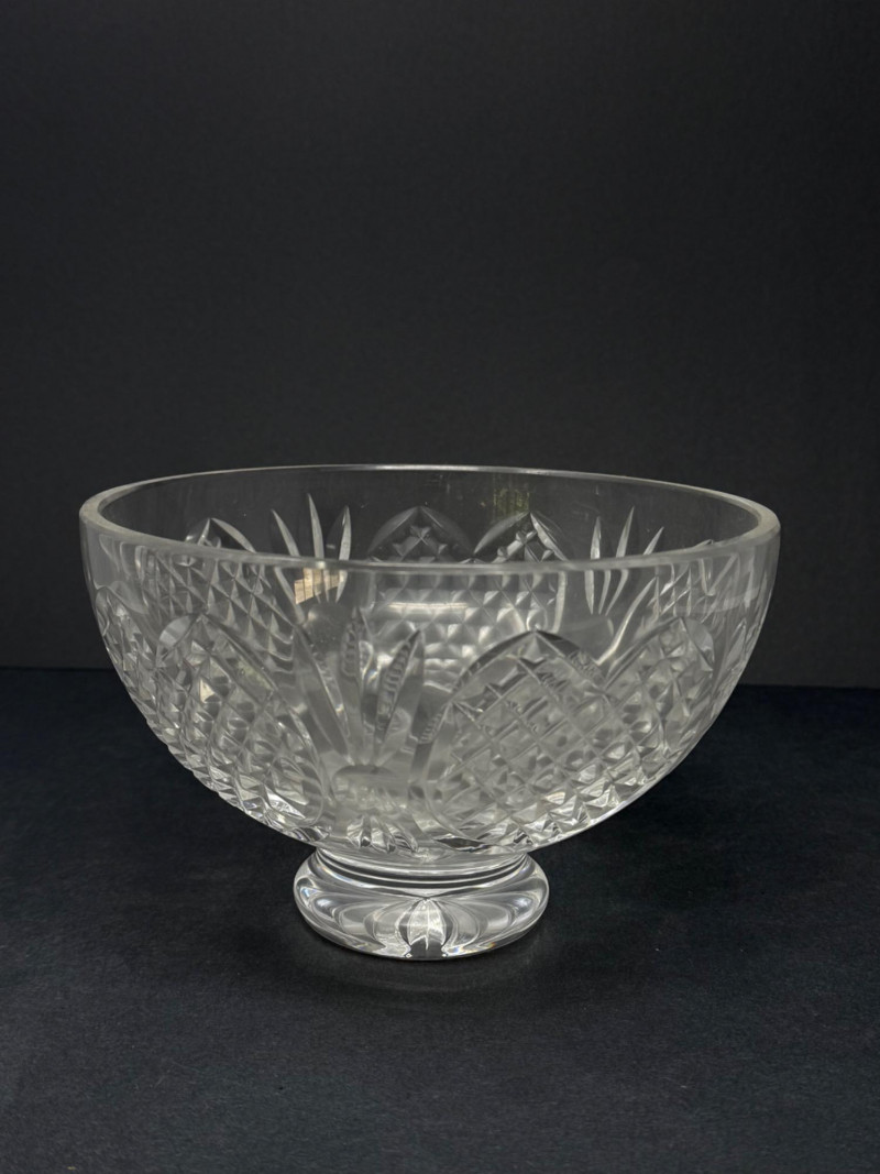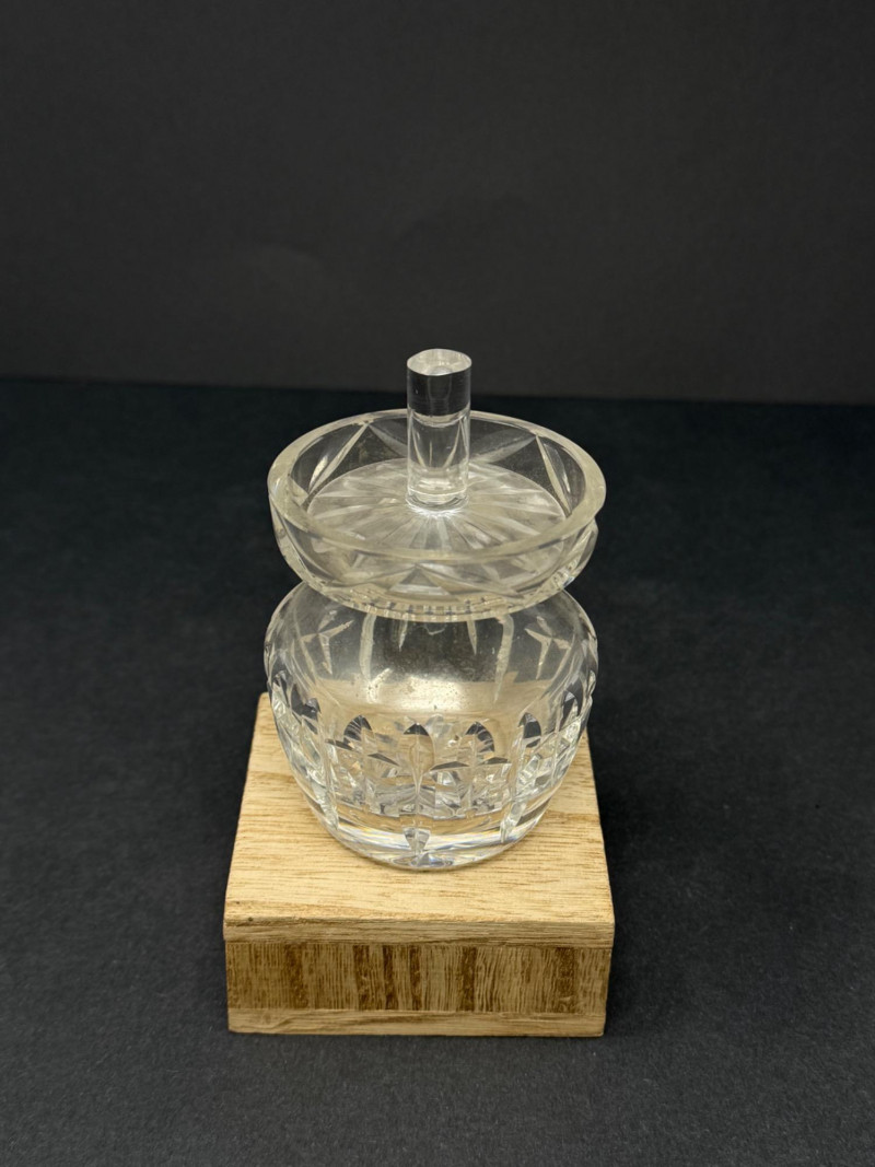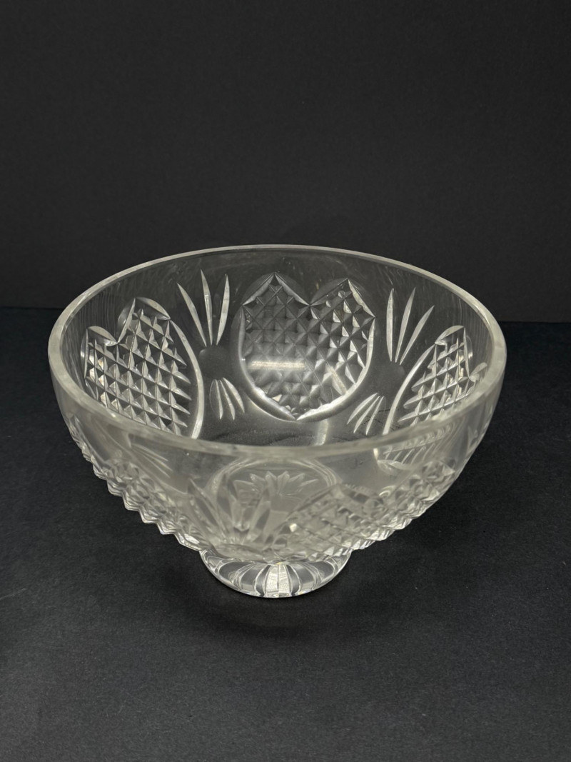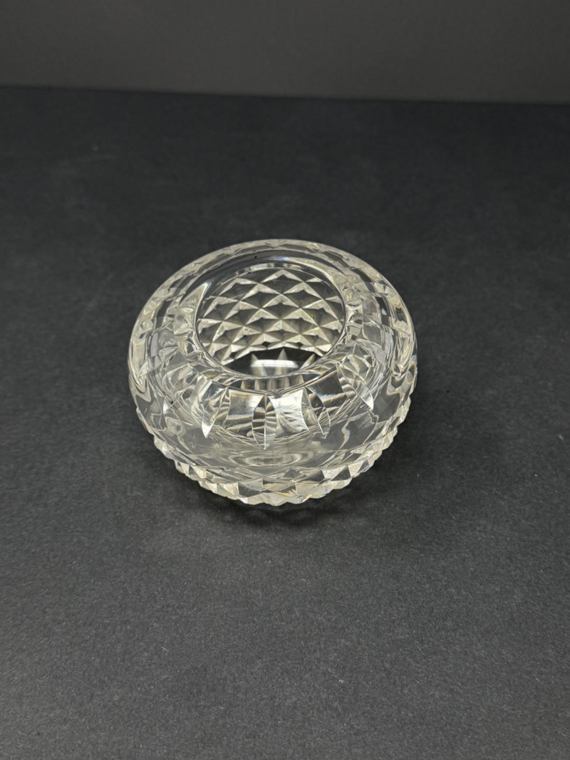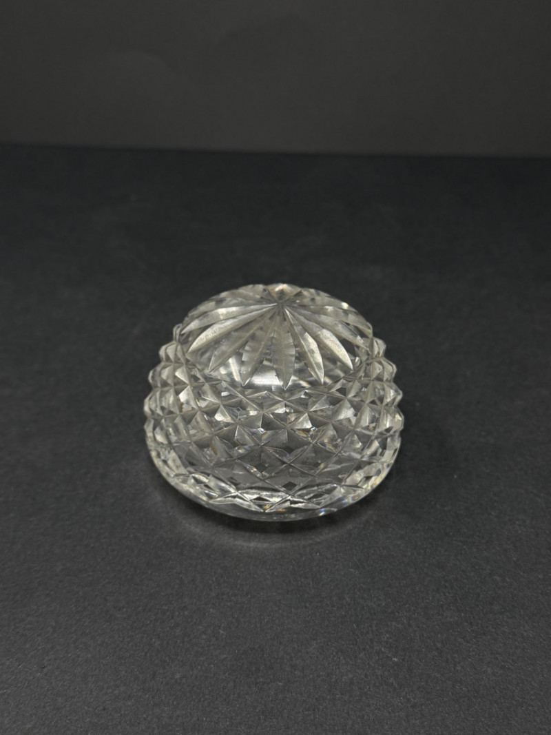 Waterford Crystal Style Glassware Set Collection of cut glass items in the style of Waterford, including plates, a footed bowl, a lidded jar, and a faceted paperweight. Each piece features patterns such as crosshatch, starburst, or fan cuts. Details: Plates (4): 7" diameter Footed Bowl: 8" diameter at top Lidded Jar: Approx. 5.5" H x 3" W Paperweight: 3.5" diameter at base