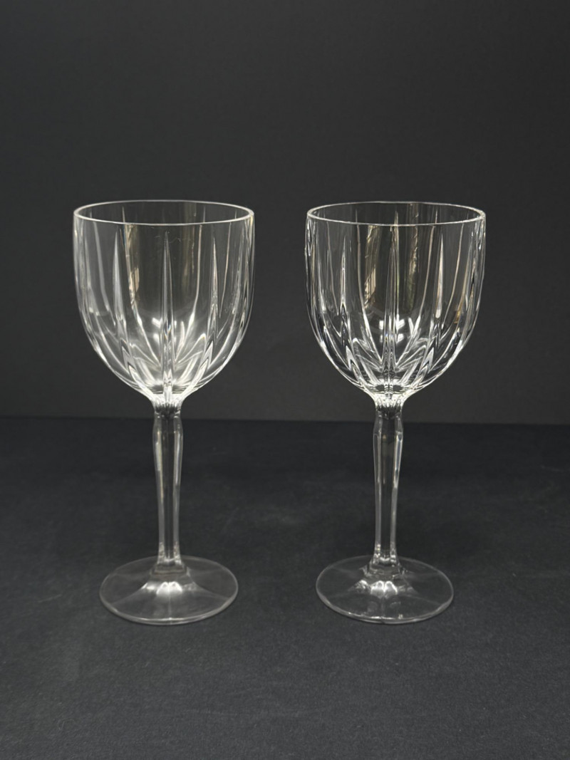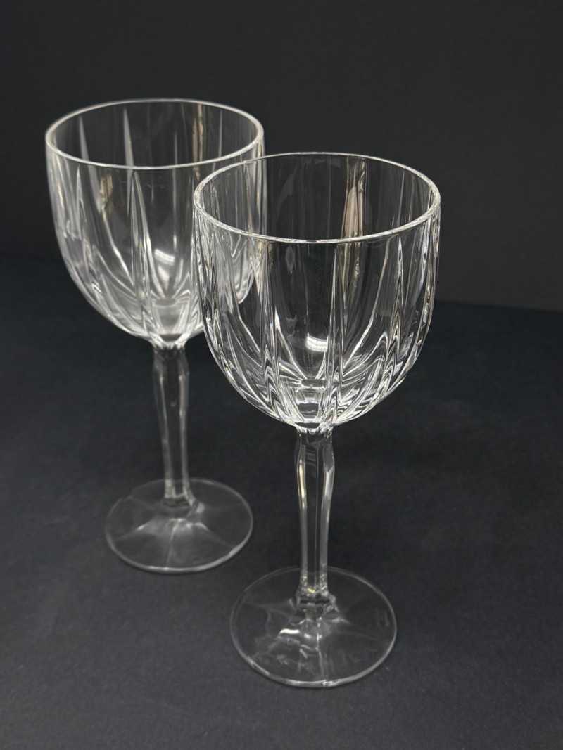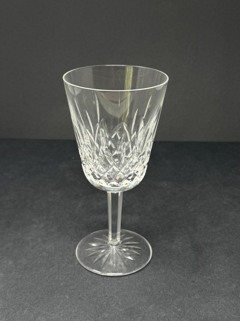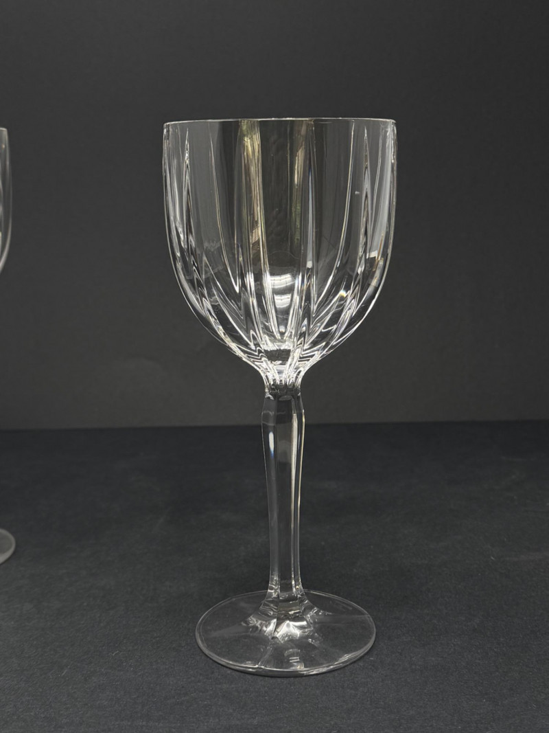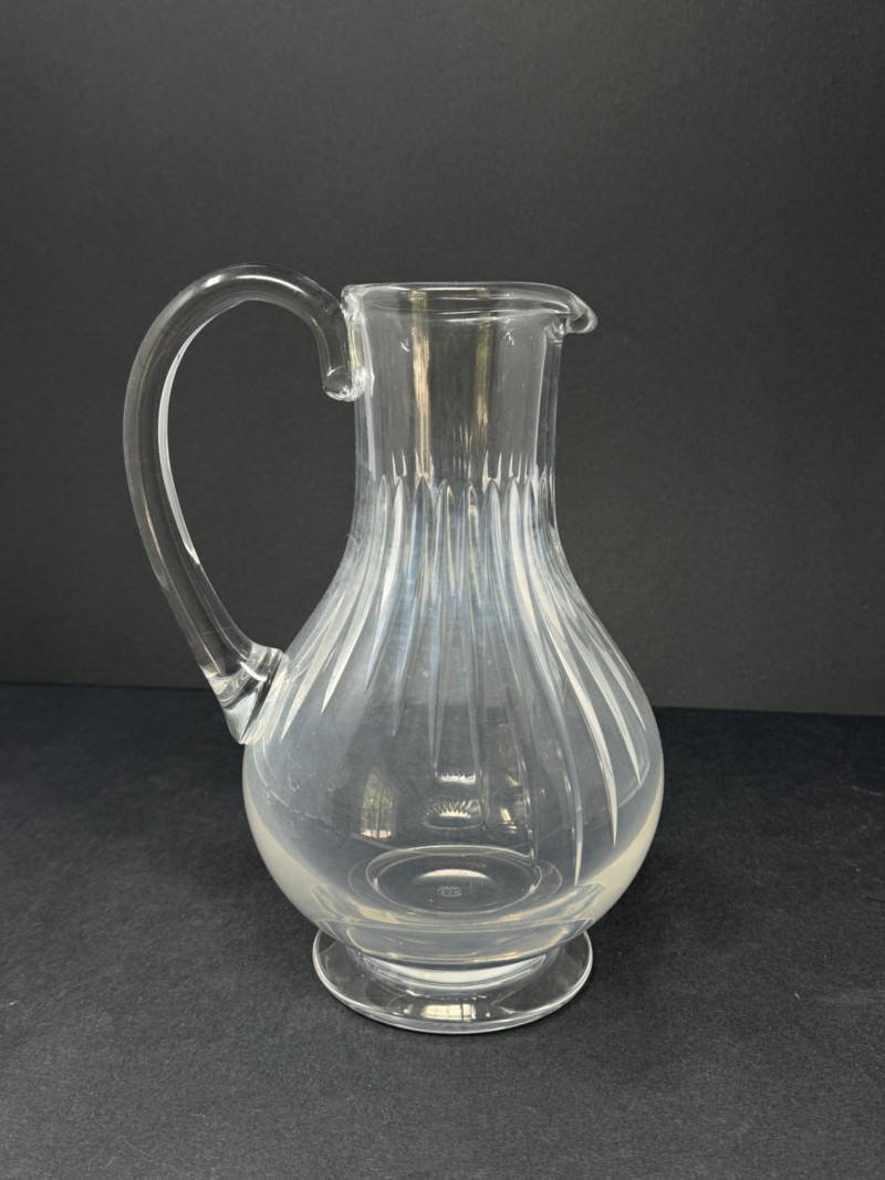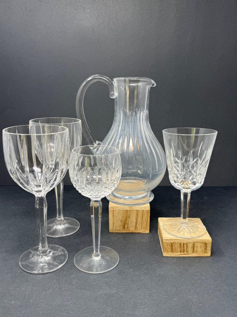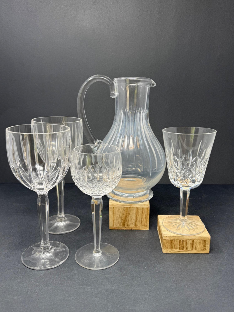 Baccarat Crystal Pitcher with 4 Waterford Crystal Wine Glasses Assortment includes one Baccarat crystal pitcher and four Waterford crystal wine glasses in assorted patterns. The pitcher features a vertical ribbed body and curved handle, while the glasses include two with vertical panels and two with faceted cuts. Details: Pitcher (Baccarat): Height: 9.5" Diameter (body): 5.5" Width with Handle: 7" Tallest Wine Glass: Height: 8.75" Diameter: 3.5"