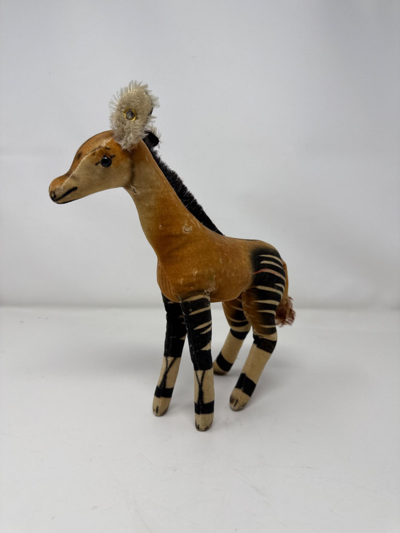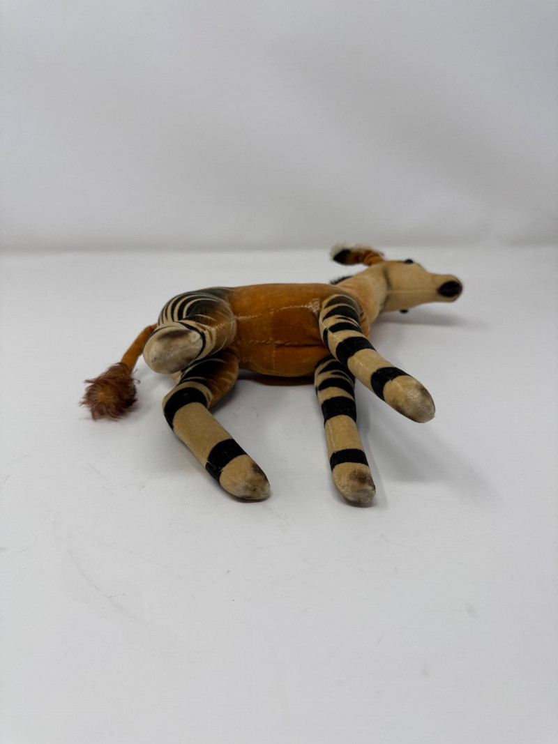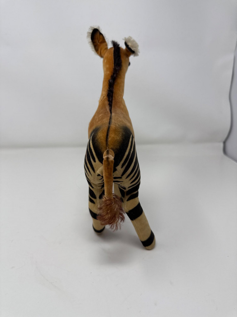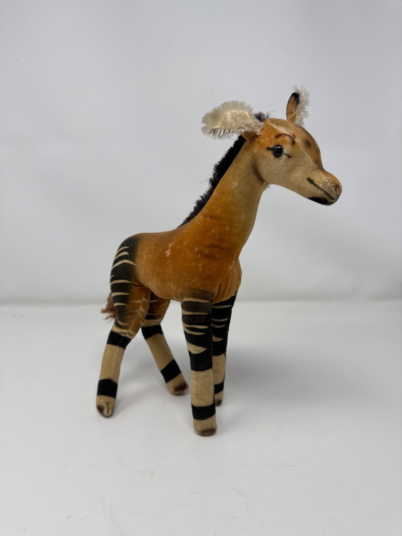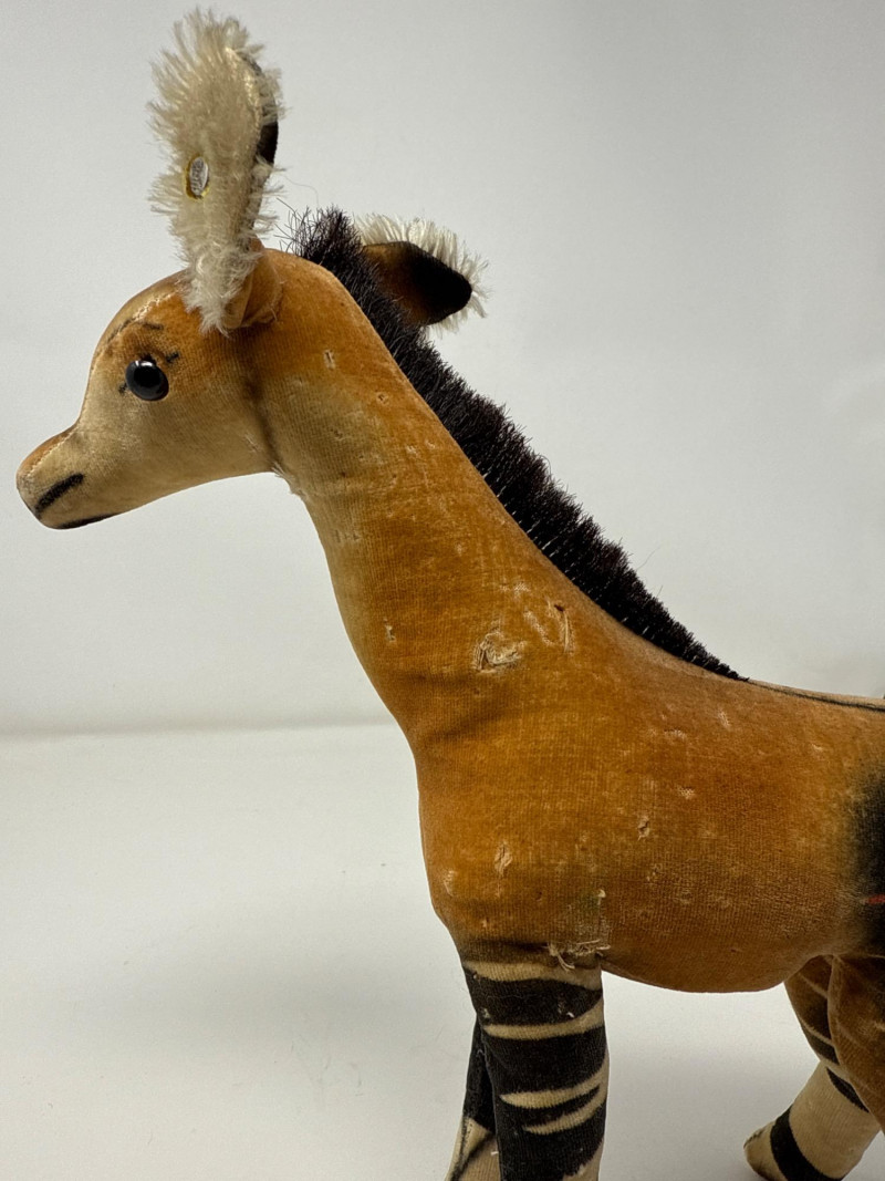 Vintage 1960s Steiff Okapi Stuffed Animal Vintage Steiff okapi stuffed animal from the 1960s, made in Germany. Features include a mohair body, striped legs, felt detailing, and stitched facial features. The original Steiff button remains in the ear. Details: Brand: Steiff Animal: Okapi Era: 1960s Material: Mohair and fabric Features: Original Steiff ear button Note: Has wear throughout as pictured.
