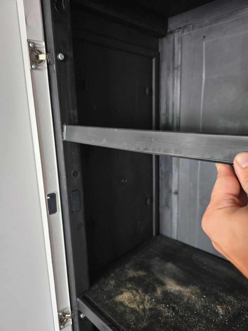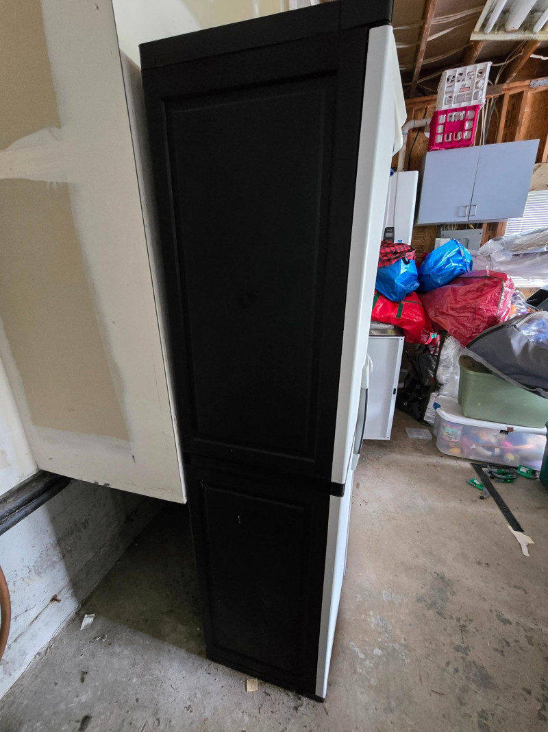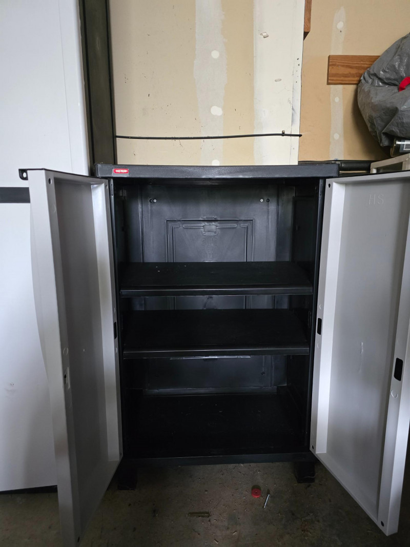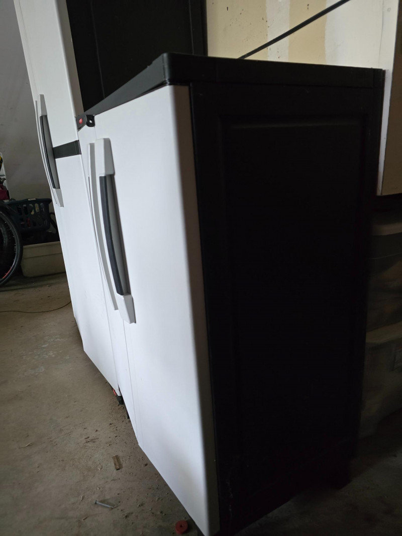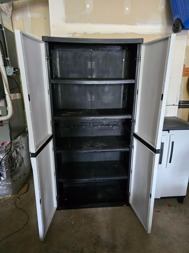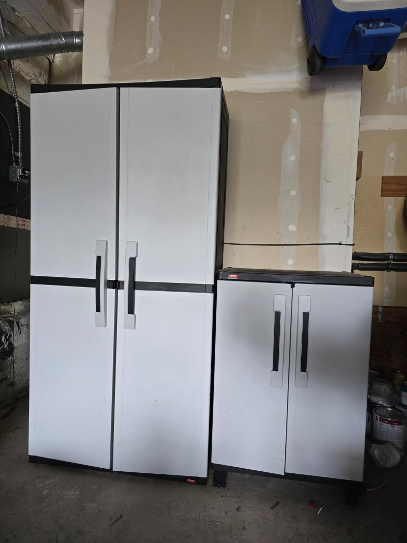 Set of 2 Keter Plastic Garage Storage Cabinets Set of two freestanding plastic storage cabinets for garage or utility use. Made of durable resin with black and gray paneling. Both units include modular adjustable shelves. Details: Quantity: Set of 2 cabinets Tall Cabinet: Approx. 6' H x 3' W x 1 1/3' D Short Cabinet: Approx. 3' H x 2' W x 1 1/3' D Material: Plastic (resin) Features: Modular shelves, swing doors, freestanding design