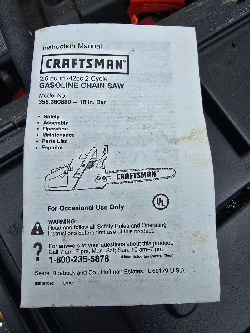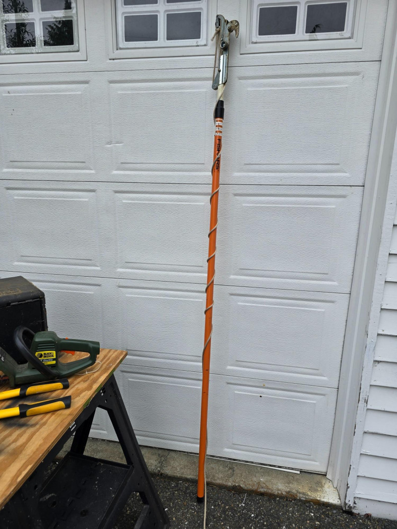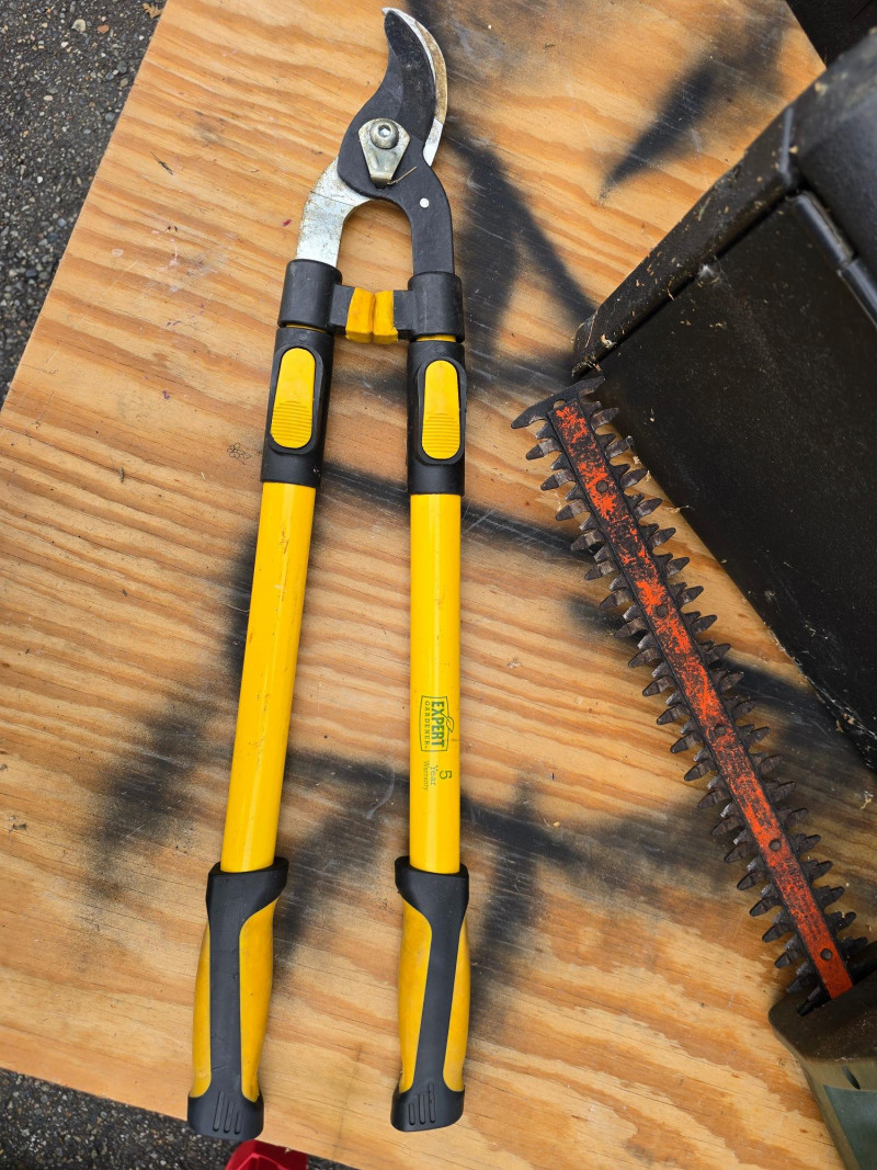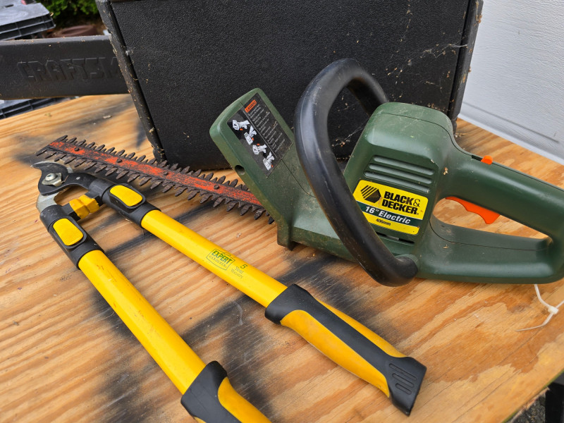 Tree and Shrub Trimming Tool Lot Comprehensive set of outdoor trimming tools for tree, shrub, and garden maintenance. Includes: Fiskars Extendable Tree Pruner 14 ft fiberglass pole with manual rope-operated bypass blade Designed for high branches and tree limbs Craftsman Gas Chainsaw (Model 358.360880) 2.6 cu.in. / 42cc 2-cycle engine 18” bar length Comes with hard plastic carrying/storage case Black & Decker Hedge Trimmer 16” dual-action blade Corded electric model (120V, 400mm) Designed for shrubs and hedges Expert Gardener Telescoping Bypass Loppers Extendable handles for adjustable reach Bypass blade for precision limb and branch cutting