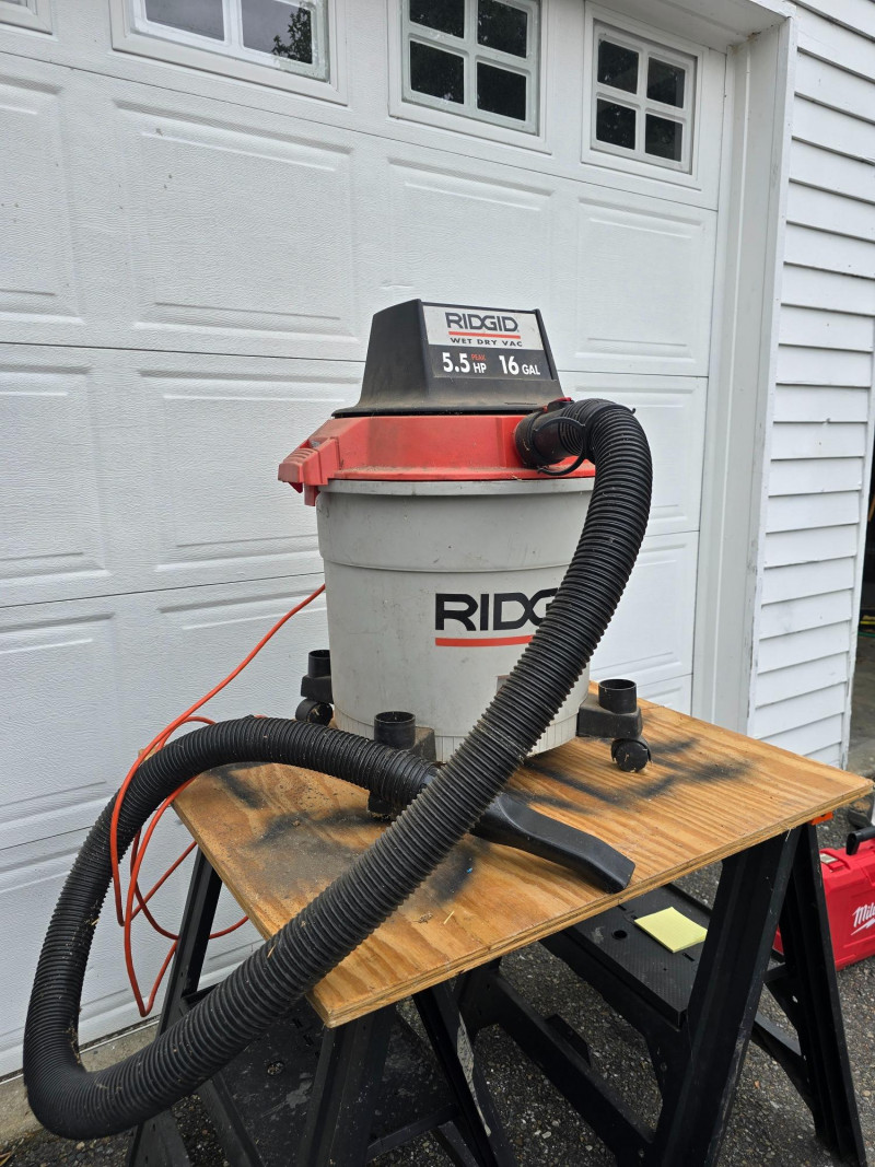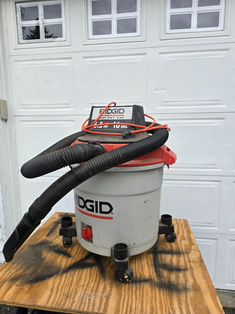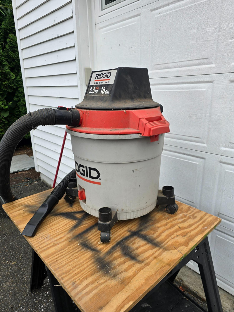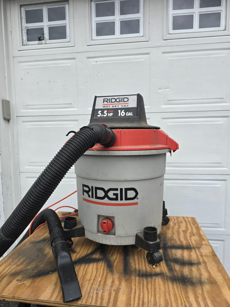 RIDGID 16-Gallon Wet/Dry Shop Vac – 5.5 Peak HP RIDGID wet/dry vacuum, model WD16300, designed for home and shop use. Features a 5.5 peak horsepower motor and a 16-gallon capacity. Suitable for wet and dry cleanup. The unit runs on 120V corded electric power and includes a flexible hose and floor nozzle attachment. Lightly used for household purposes only. Details: Brand: RIDGID Model: WD16300 Motor: 5.5 Peak HP Capacity: 16 Gallons Power: 120V, 11.4A, 60Hz Use: Household (non-commercial) Condition: Functional, with visible signs of use; interior and filter may require cleaning