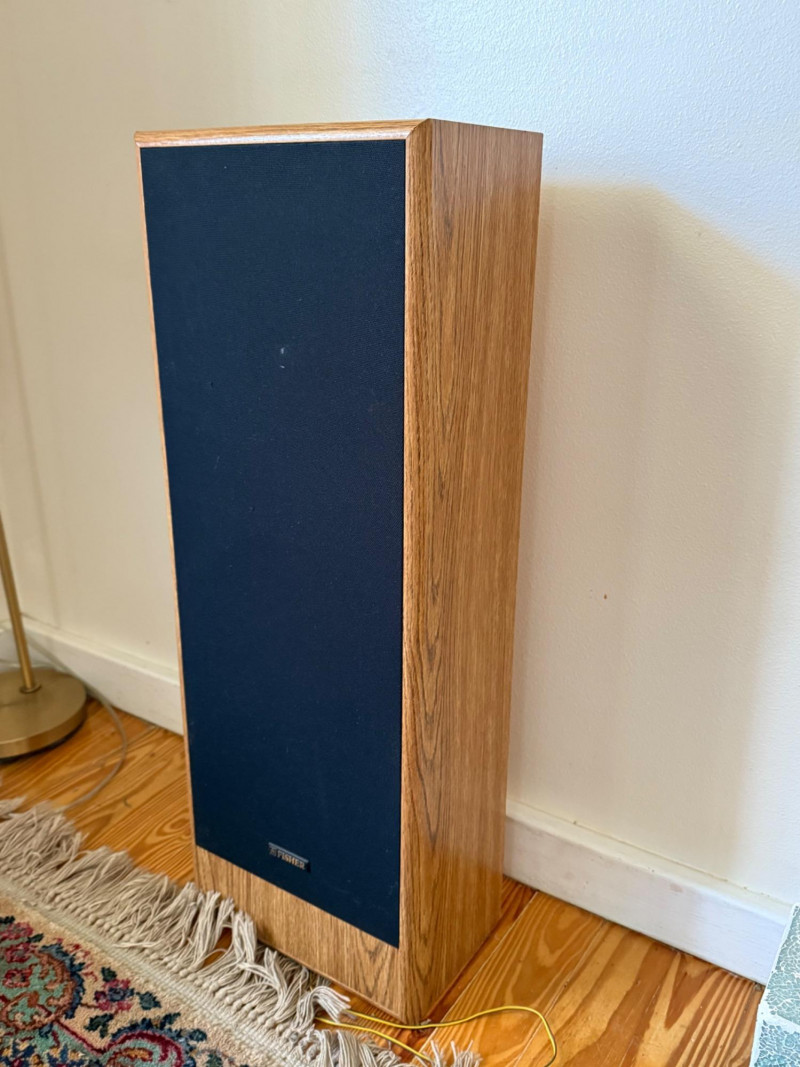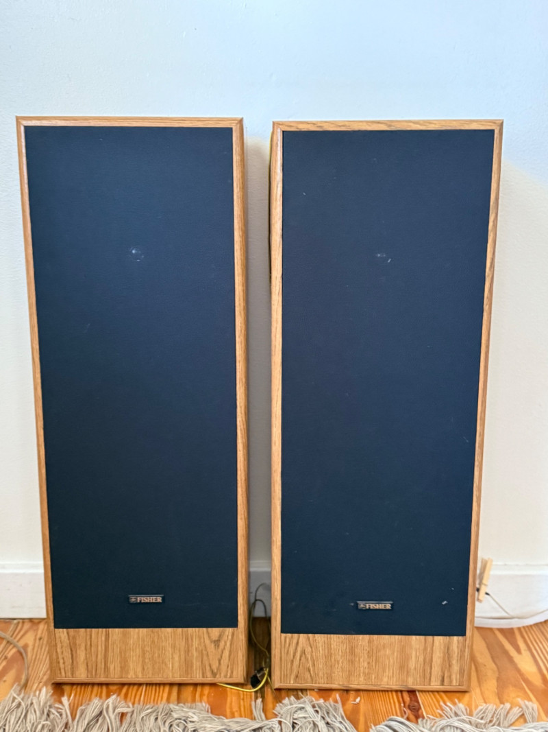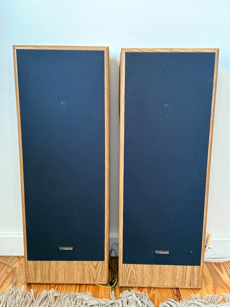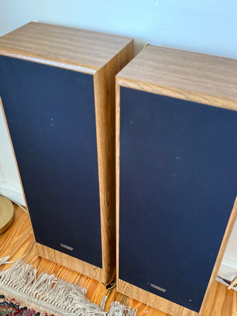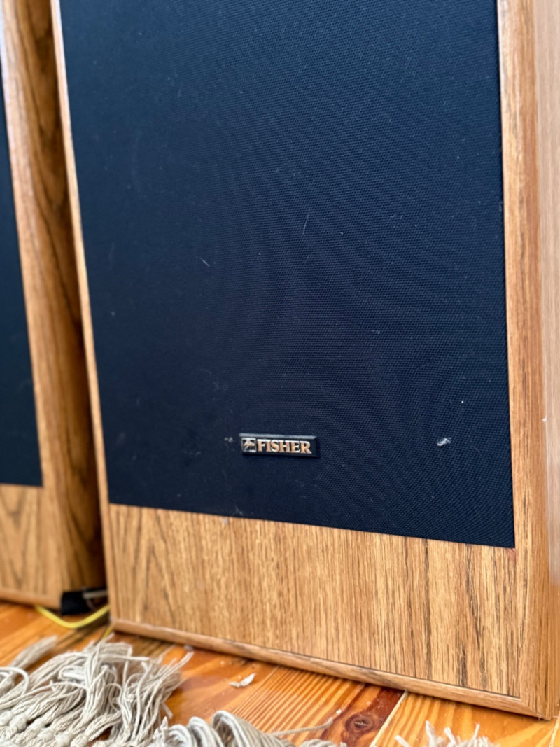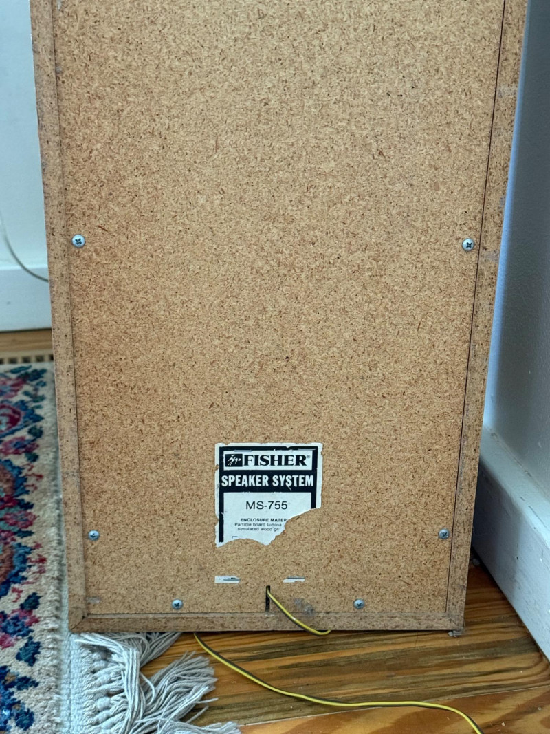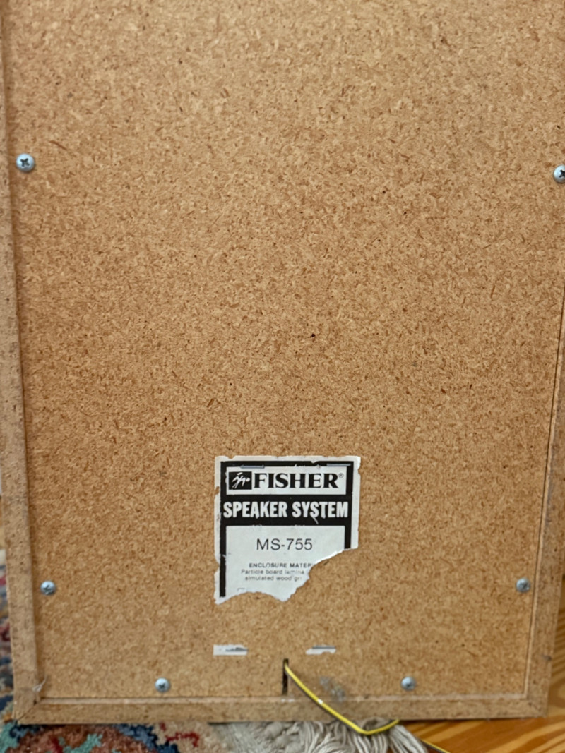 Pair of Vintage Fisher MS-755 Floor Speakers Vintage Fisher MS-755 speaker system featuring a wood veneer cabinet with black cloth grille fronts. Each unit includes RCA-style speaker cables for connection. Label on the back indicates enclosure material is simulated wood grain over particle board. Details: Model: Fisher MS-755 Quantity: 2 speakers Finish: Simulated wood grain laminate Connection Type: RCA Dimensions (each): 31" H x 11" W x 7" D