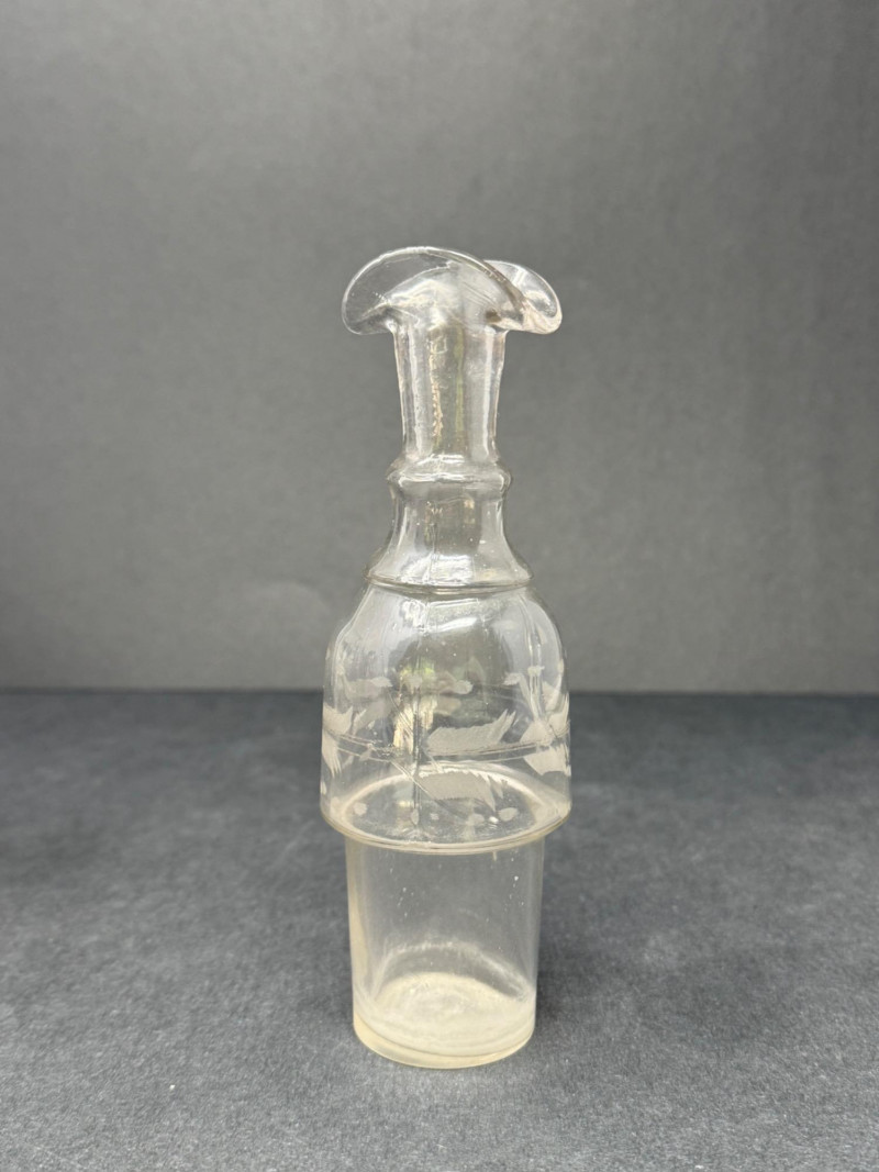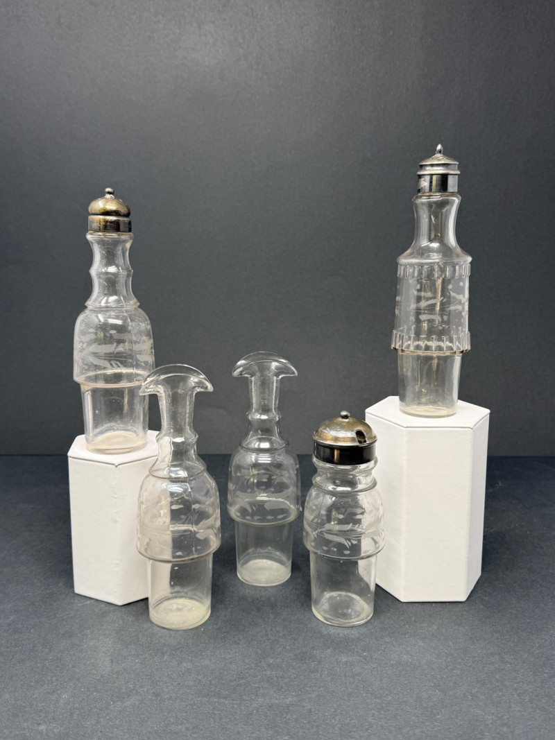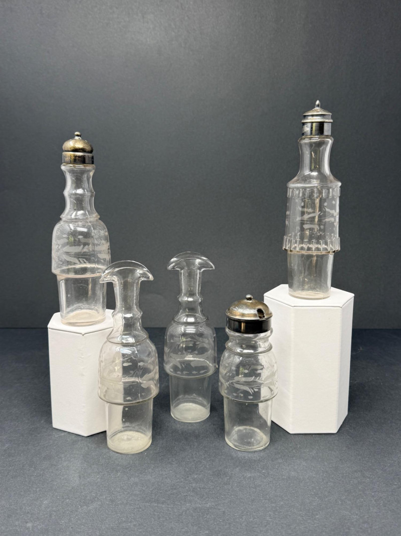 1890s Antique Victorian Pewter Cruet Set – 5 Crystal Etched & Ridged Bottles Assortment of five antique crystal cruets from the late Victorian period, each featuring pewter or metal screw tops and varying etched or ridged body designs. The set includes a mix of patterns—some with vertical ridges, others with etched floral or banded motifs. Two are fitted with pierced shaker tops, while three have open necks for pouring. Details: Quantity: 5 cruet bottles Material: Crystal with pewter or metal tops Height Range: 5" to 7" Features: Etched patterns, ribbed detailing, assorted top styles Era: 1890s Victorian
