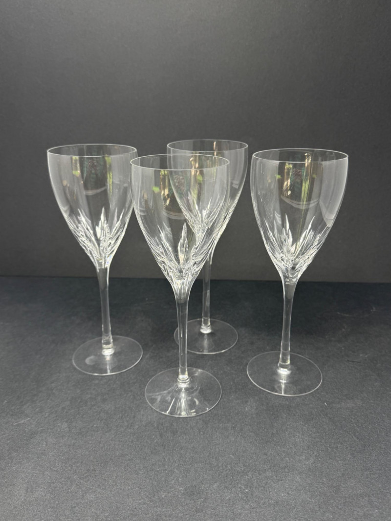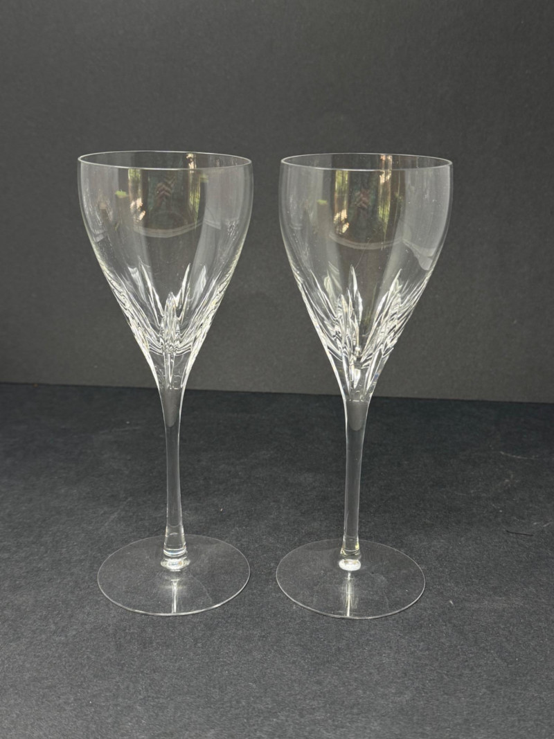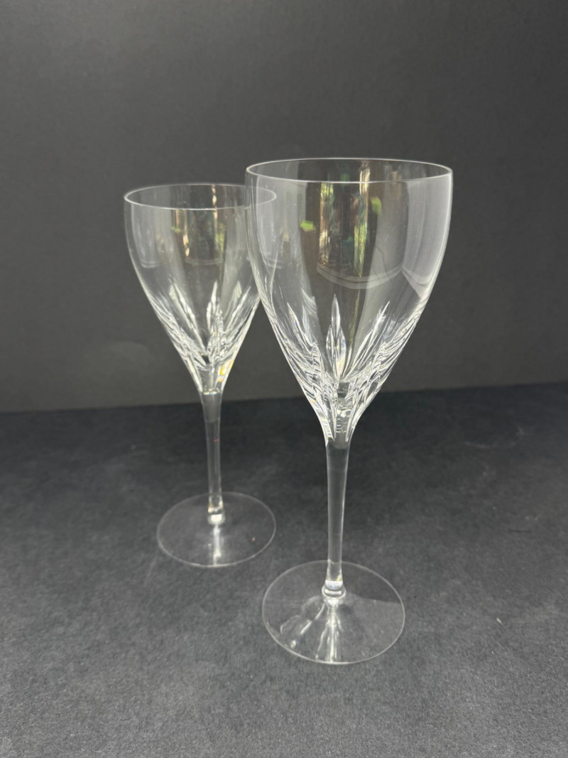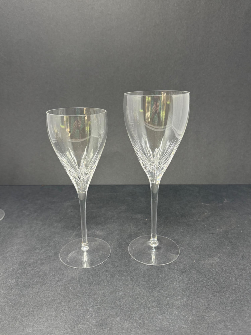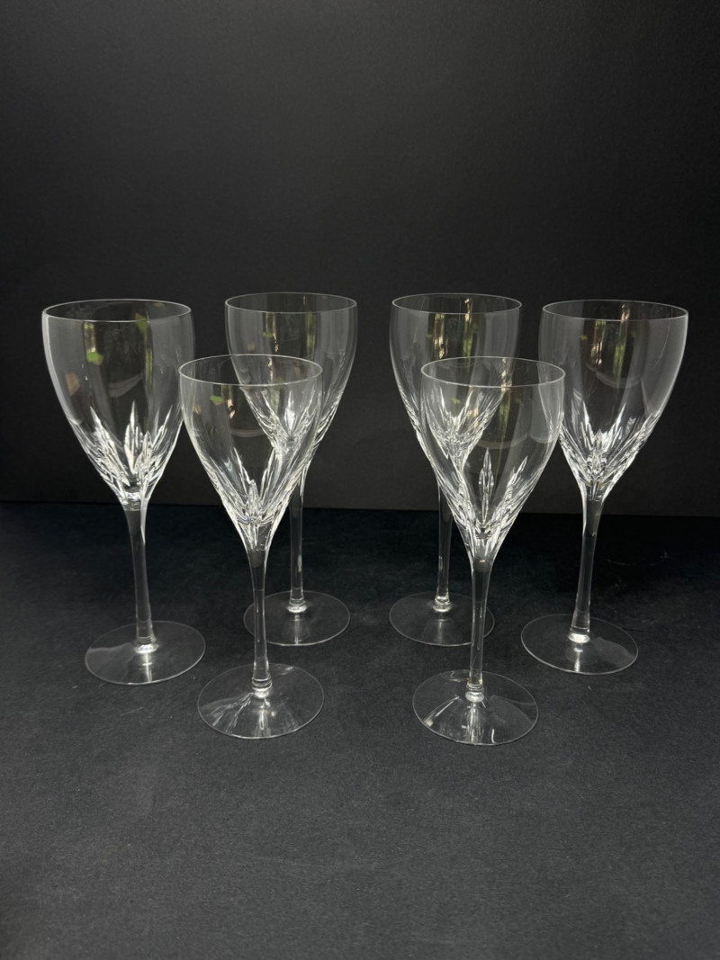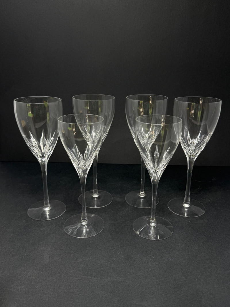 Set of 6 Waterford Claria Wine Glasses Set of six cut crystal wine glasses from the Waterford Claria collection, designed with a balance of elegance and function. The glasses feature vertical wedge cuts radiating from the base of the bowl, a hallmark of the Claria pattern. The clear crystal highlights the clarity and brilliance of the glass. This mixed-size set includes four taller glasses and two shorter ones, suitable for serving red and white wines. Details: Quantity: 6 glasses (4 tall, 2 short) Pattern: Waterford Claria Material: Cut crystal Tall Glasses: 9" H x 3" W Short Glasses: 8" H x 2.75" W