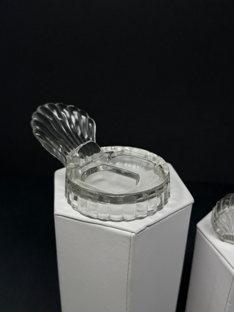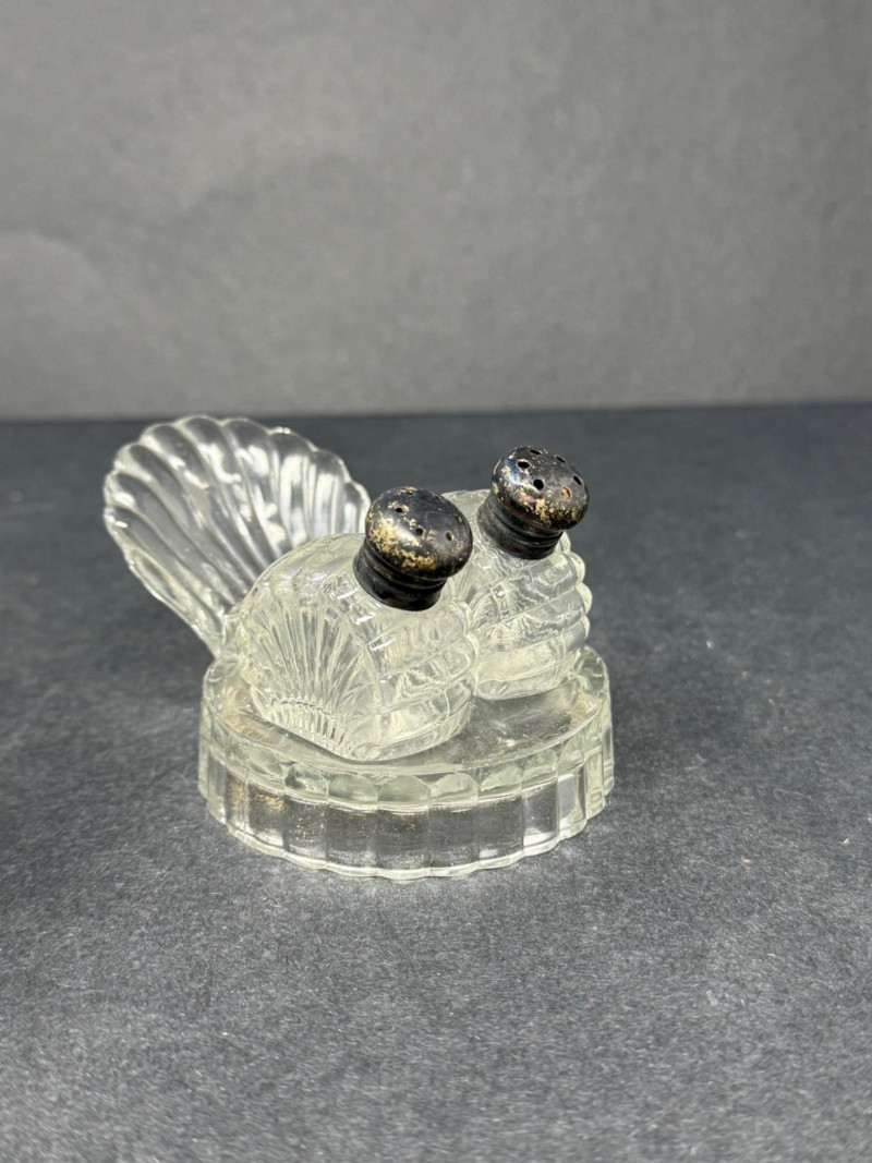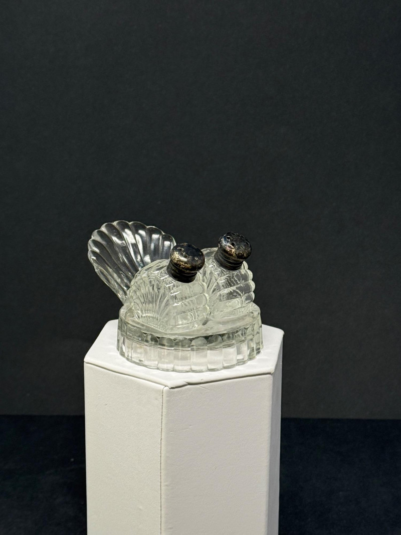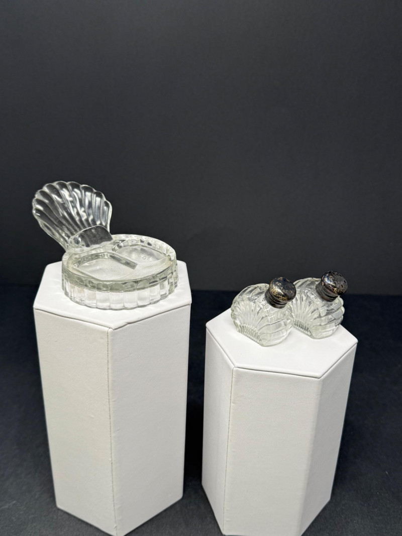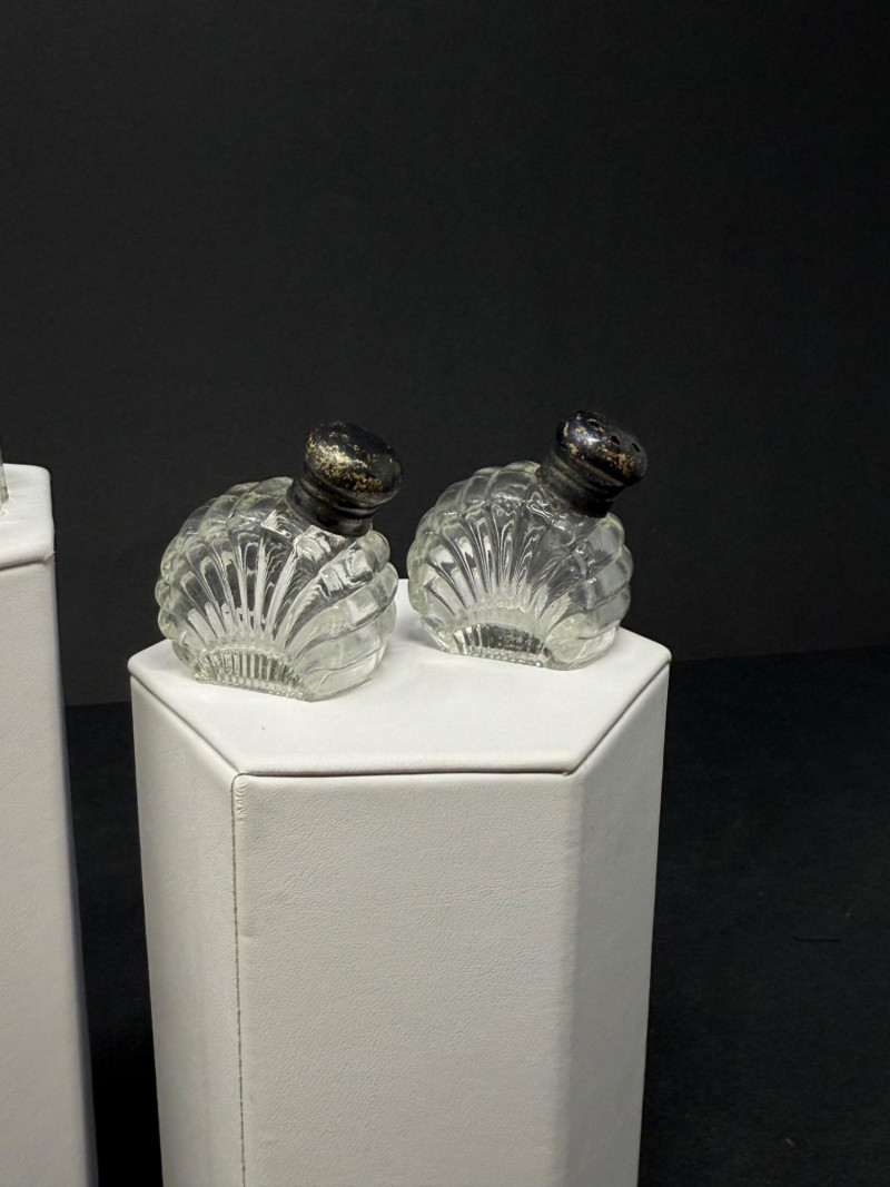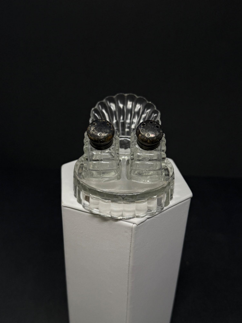 Art Deco Sterling & Crystal Salt & Pepper Shaker Set Elegant salt and pepper shaker set consisting of two shell-motif crystal containers with metal tops, seated in a molded oval base. The design features fluted crystal bodies and a notched rim tray with a fan-shaped vertical backrest. The shakers are removable and fit into recessed holders. Likely dating to the post-1940s period and influenced by Art Deco styling. Measurements: