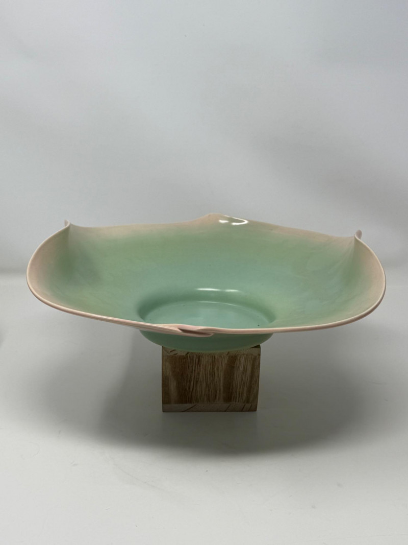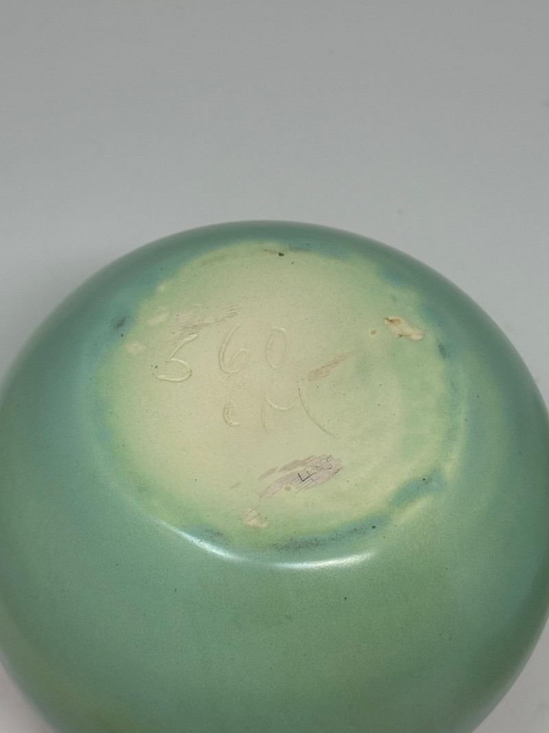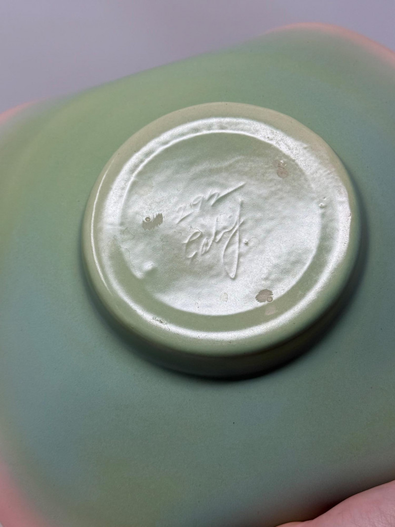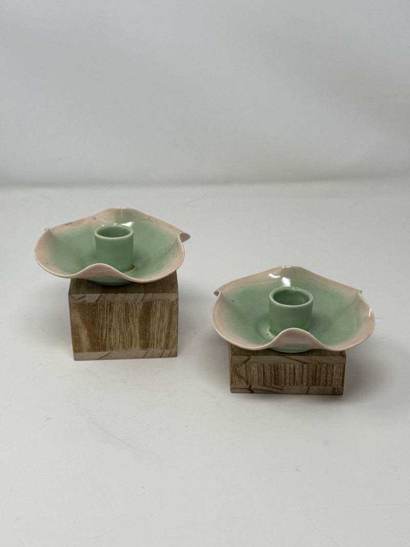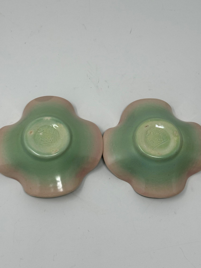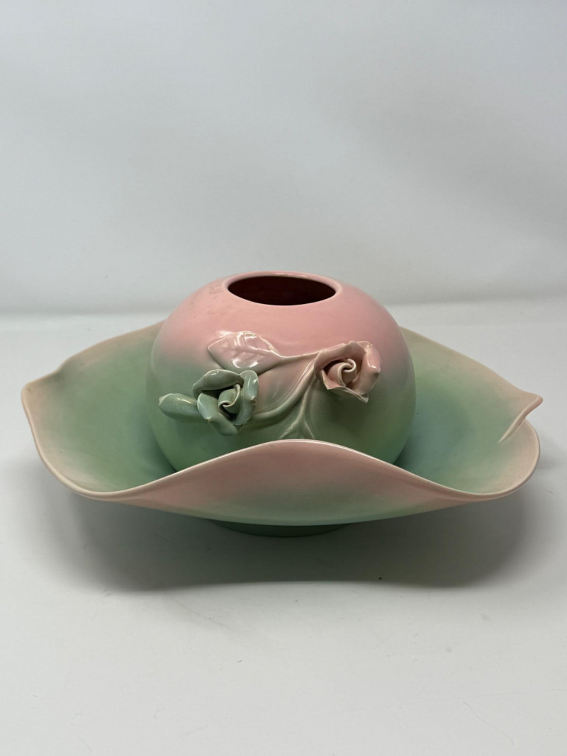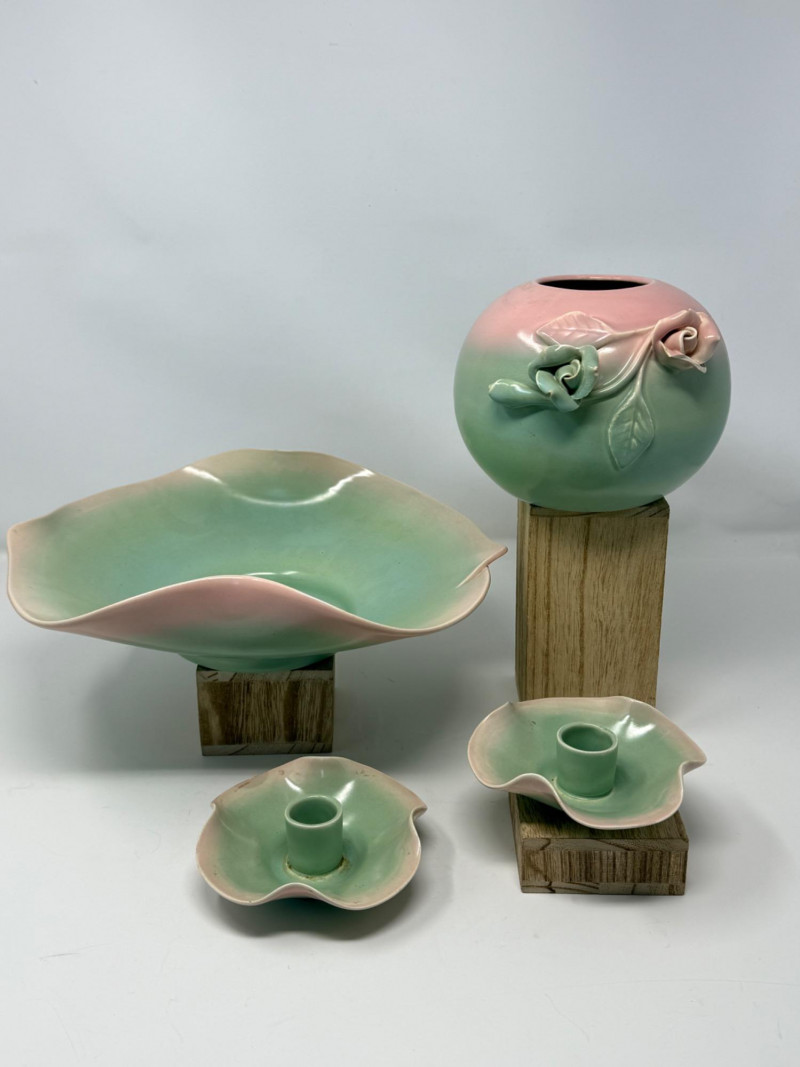 Signed 1930s Haldeman Calif Pottery Caliente Set Set of four pieces by Haldeman California Pottery in the Caliente pattern, featuring a gradient pink and green glaze. The set includes: One large low flower bowl with gently flared edges One round vase with applied floral relief decoration Two matching flower-form candle holders Each piece bears the incised signature on the underside. Measurements: Candle Holders: 5" diameter each Flower Bowl: 12" widest point x 3.5" tallest point