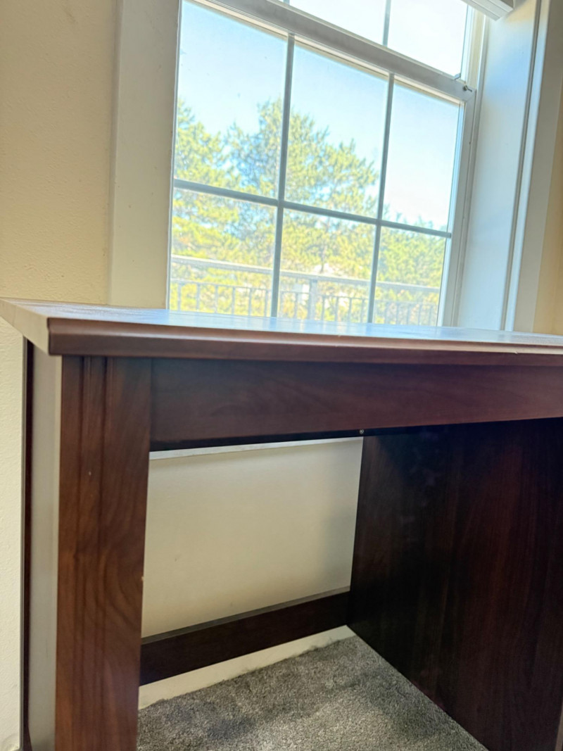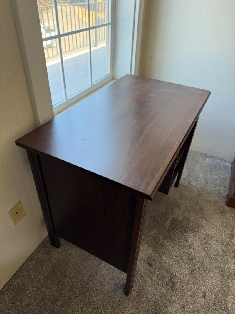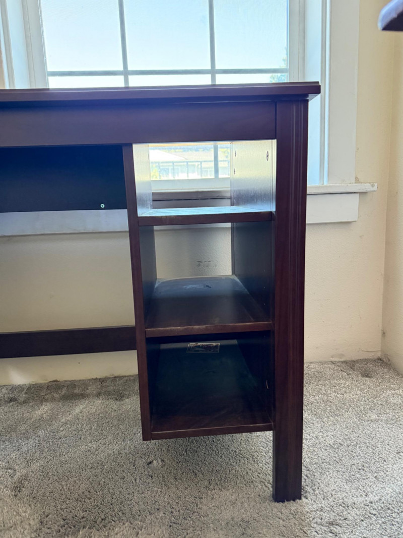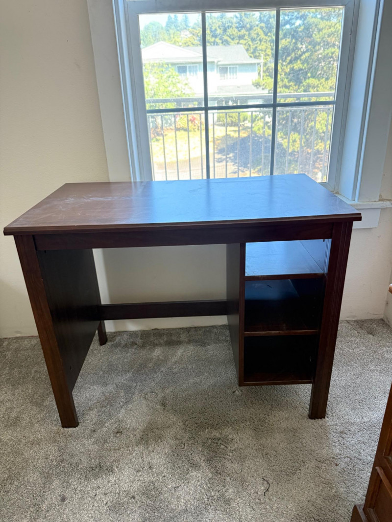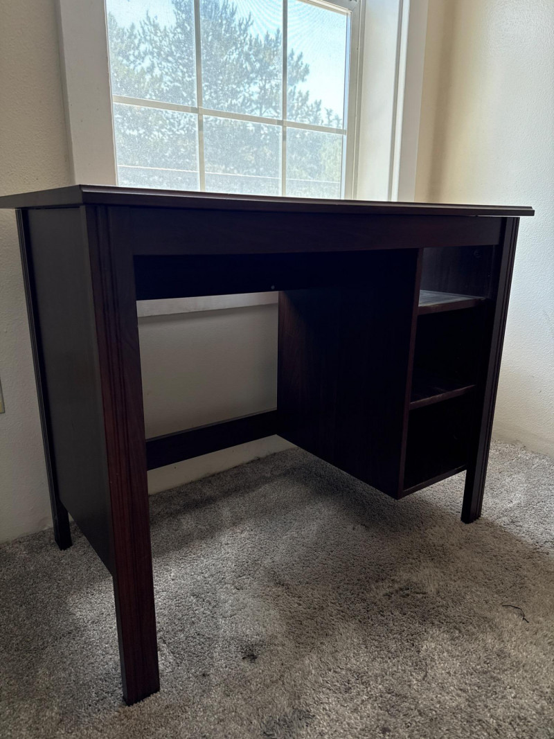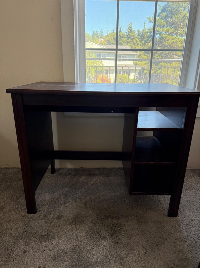 IKEA Brusali Desk in Brown Compact writing desk with a rectangular top and integrated shelving on the right side. Includes three fixed open shelves for organizing books, accessories, or supplies. Finished in dark brown laminate, the piece fits well in home offices, bedrooms, or study spaces. Lightweight construction allows for easy placement and movement. Details: Dimensions: