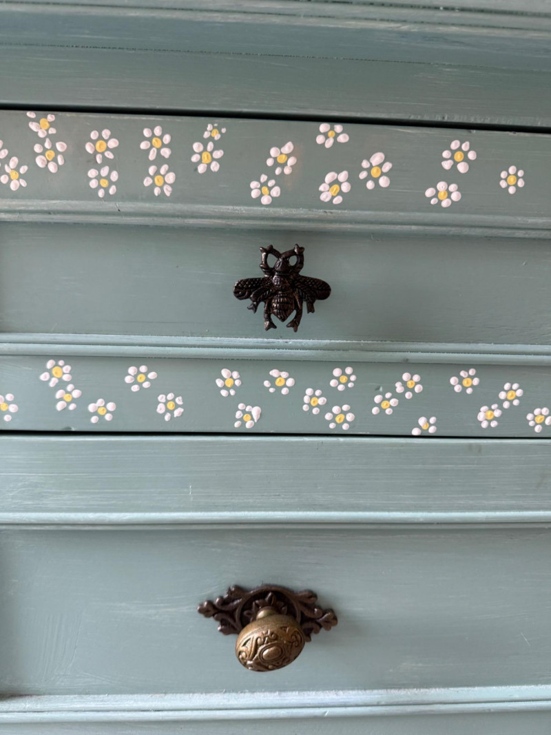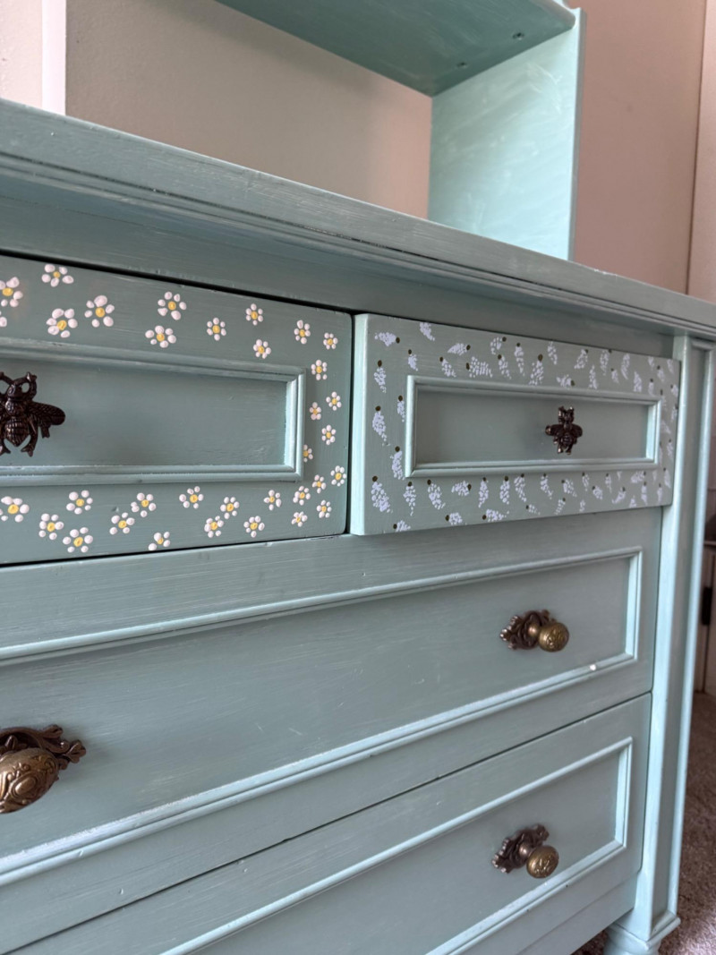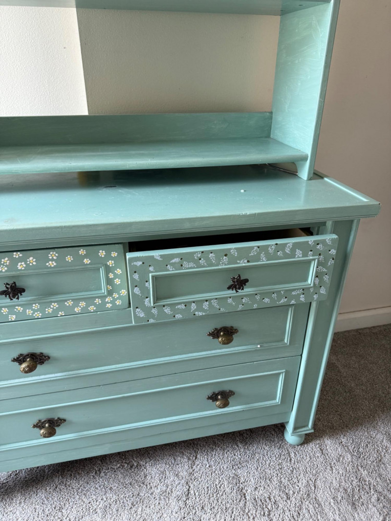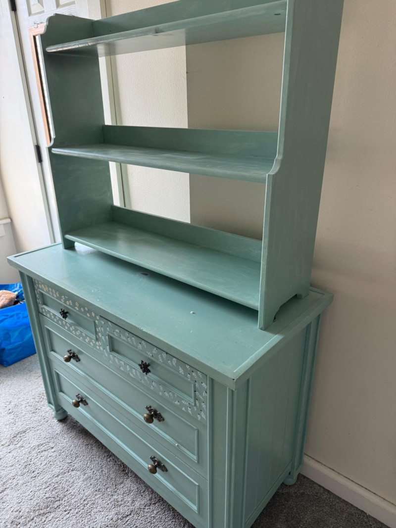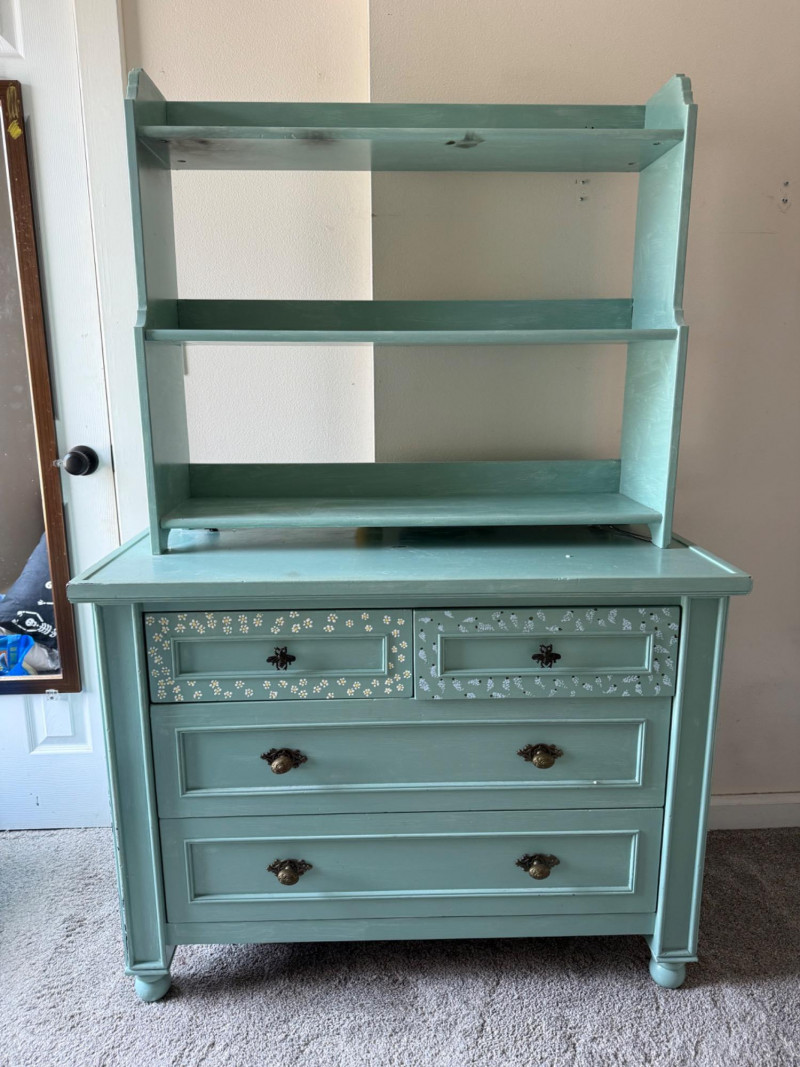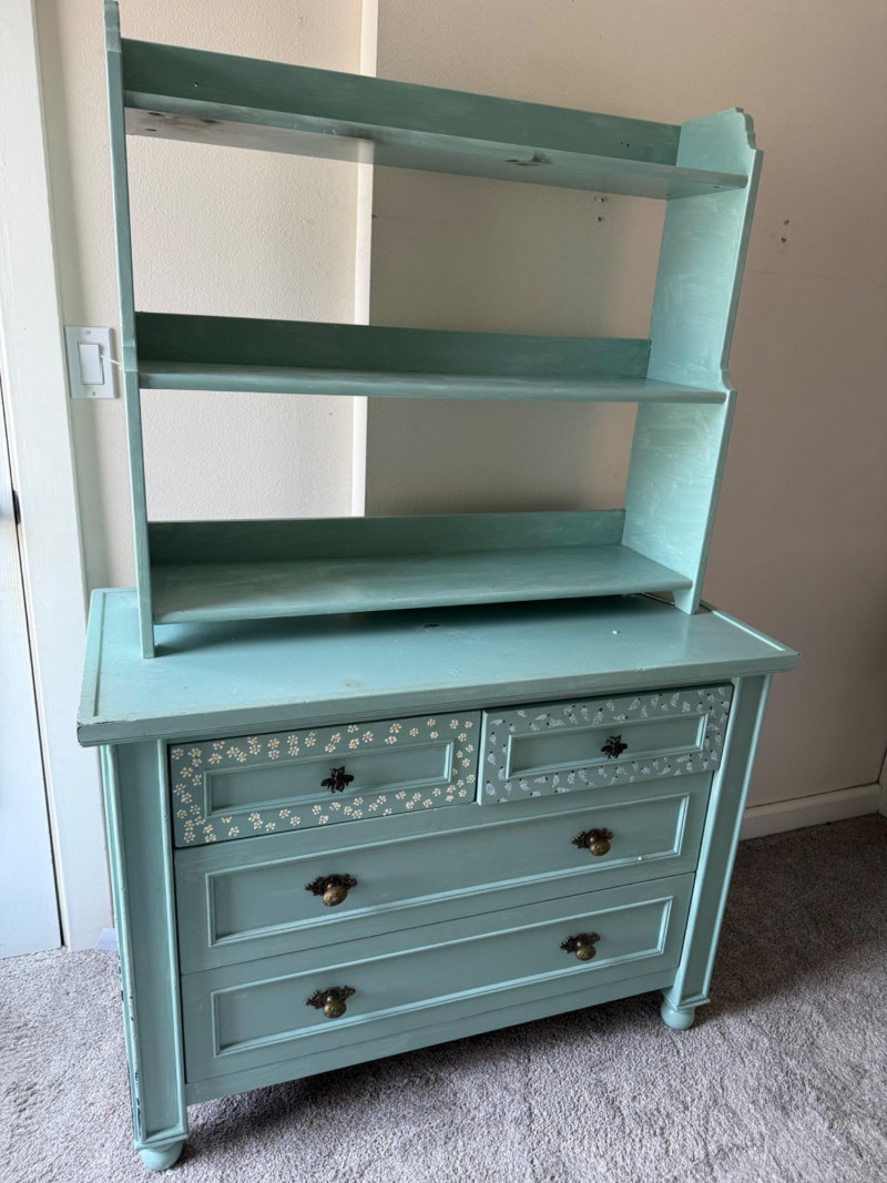 Vintage Provincial Hutch in Faded Aqua – 63" Tall Two-piece wooden hutch painted in a faded aqua finish. Features include three open display shelves and a base with four drawers—two small upper drawers adorned with hand-painted floral details and two full-width drawers below. Finished with decorative trim, round feet, and mixed metal hardware. Measurements: