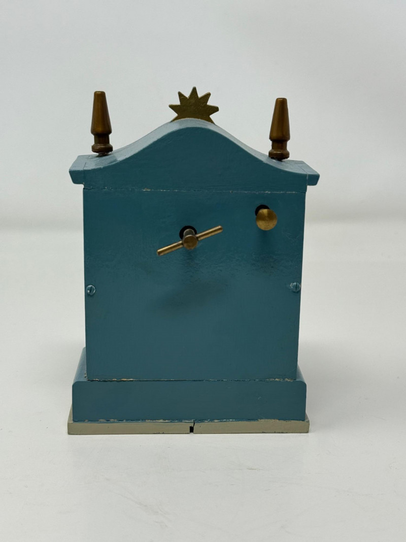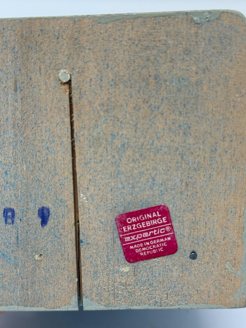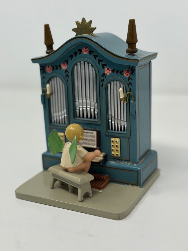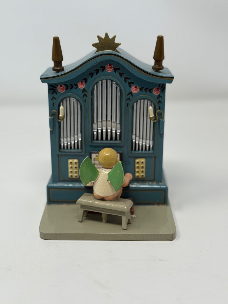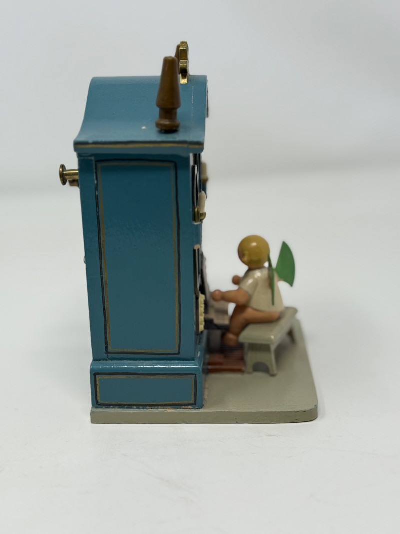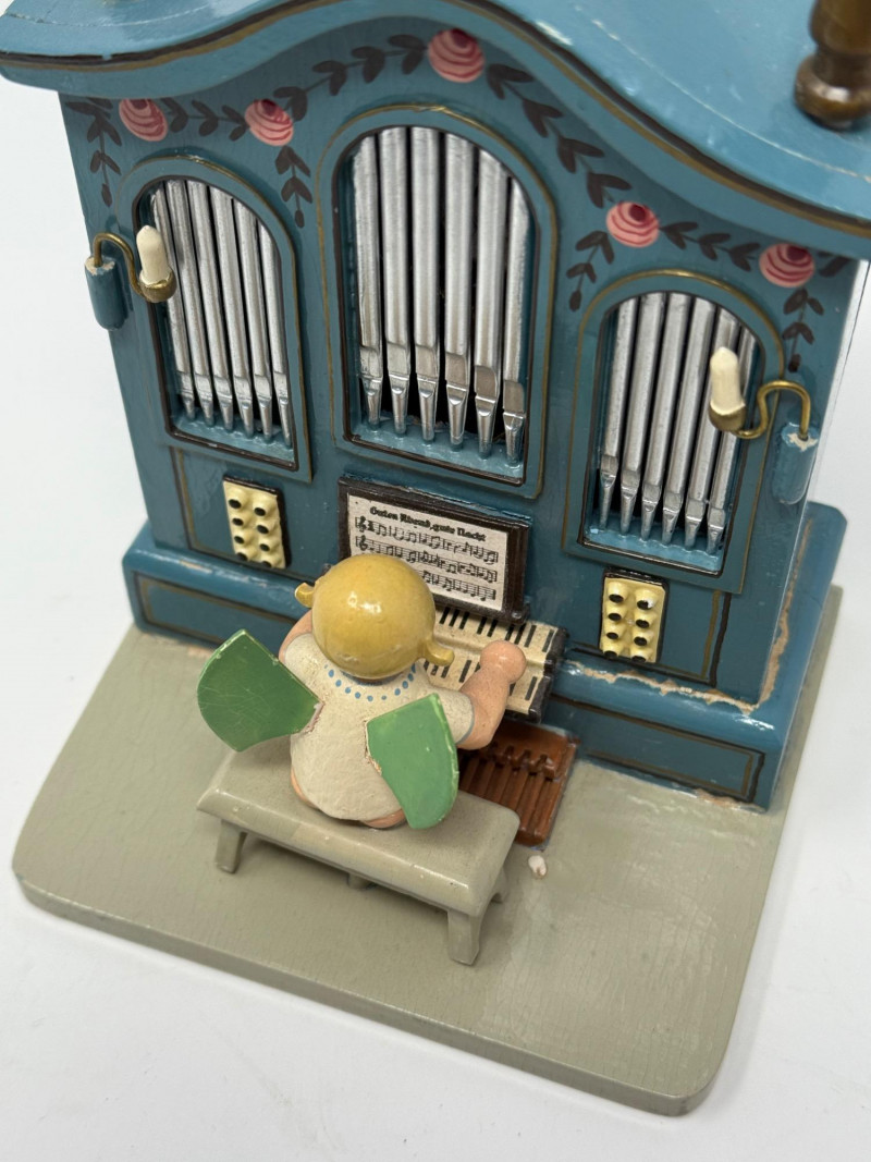 Wendt & Kühn Music Box "Organ" with 36-Note Movement Wooden music box featuring a seated angel figure playing a blue pipe organ with hand-painted floral accents and gold-toned details. The figure has green wings and sits on a bench, facing the organ. The music box is wind-up operated from the back and plays a 36-note melody. Marked with an "Original Erzgebirge Expertic – Made in German Democratic Republic" label on the underside. Details: Maker: Wendt & Kühn Origin: German Democratic Republic (GDR) Material: Hand-painted wood Features: Wind-up mechanism, 36-note musical movement Label: Original Erzgebirge Expertic Dimensions: