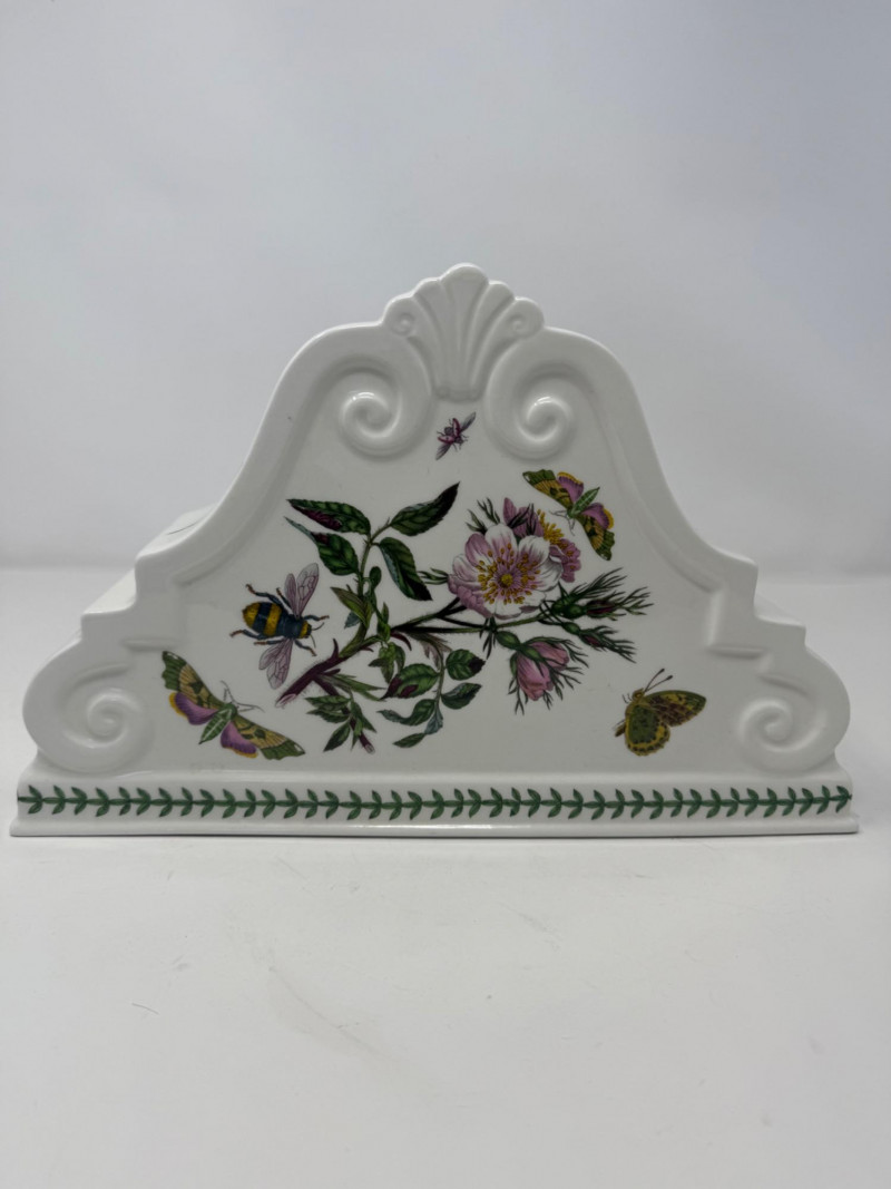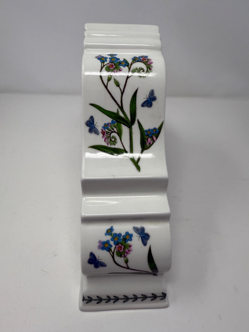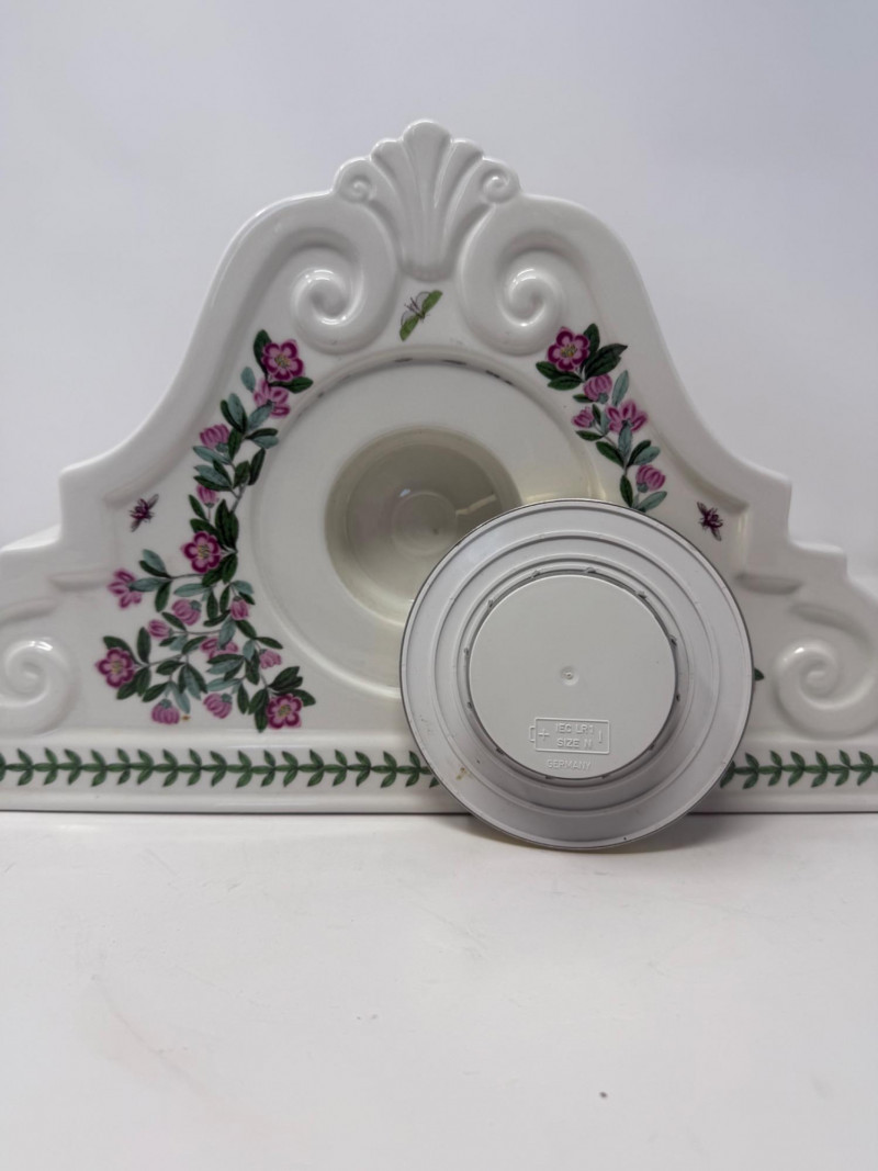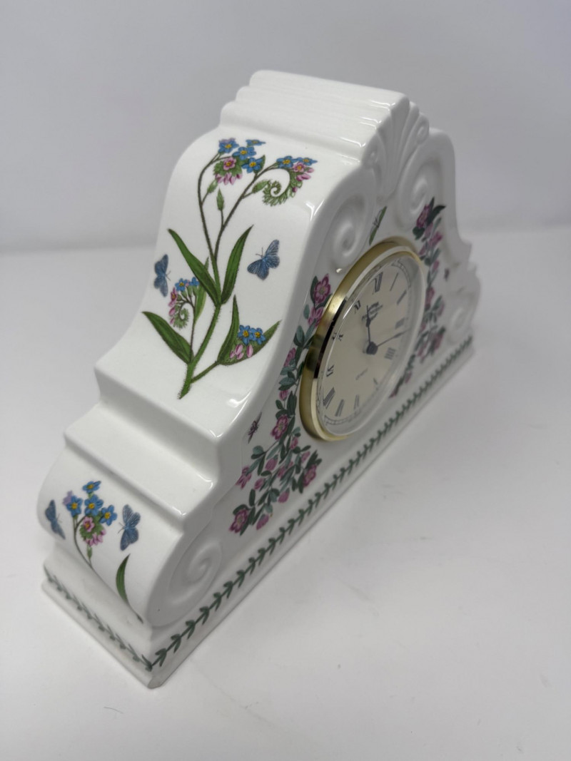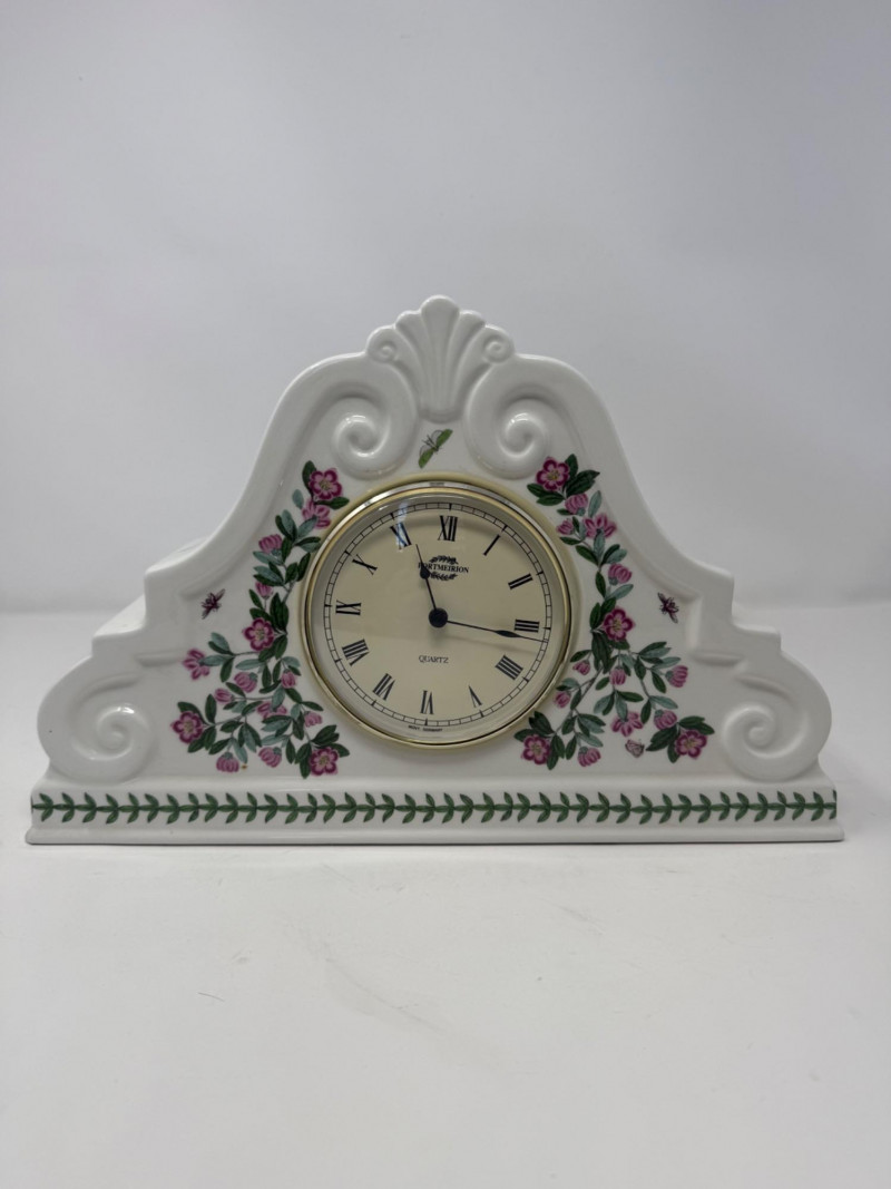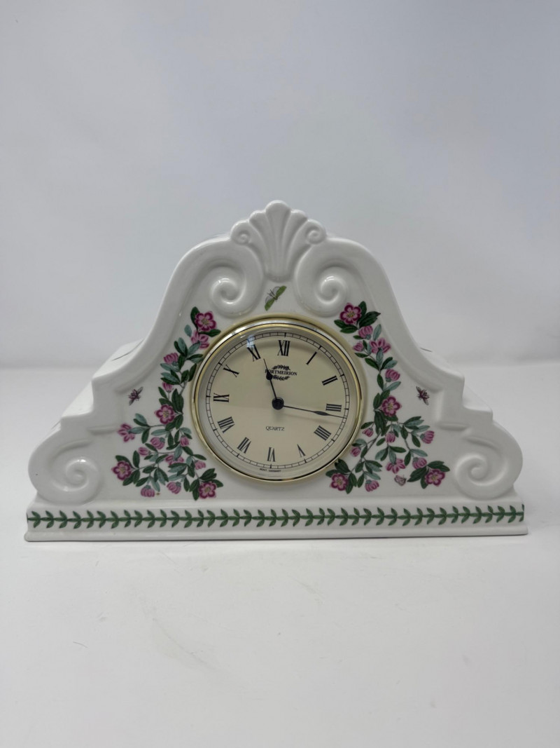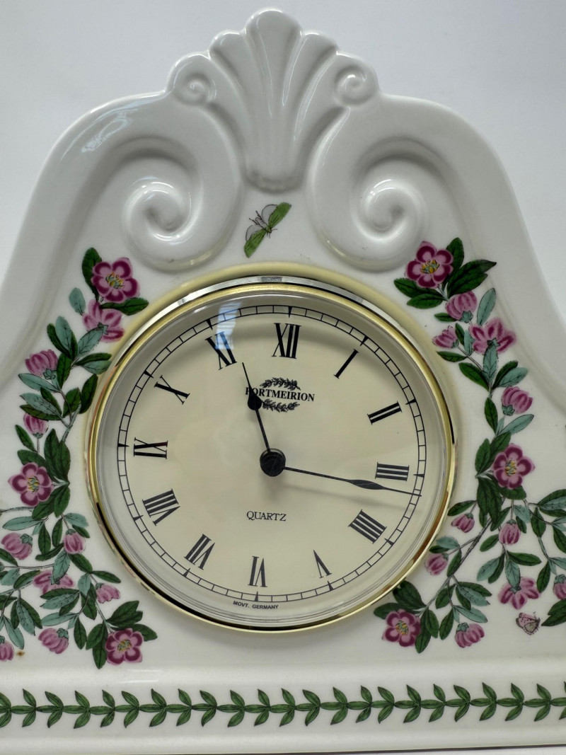 Portmeirion Botanic Garden Mantle Clock Porcelain mantel clock from the Botanic Garden series by Portmeirion, featuring various floral motifs and insects. The front design showcases pink rhododendron flowers, with additional botanical illustrations and butterflies on the sides and back. The clock face includes Roman numerals and gold-tone trim. Manufacturer: Portmeirion Series: Botanic Garden Origin: Case made in Britain, movement marked Germany Movement: Quartz Material: Porcelain Design Motifs: Pink rhododendron flowers, laurel leaf border, assorted botanical and insect illustrations Dimensions: Condition Note: