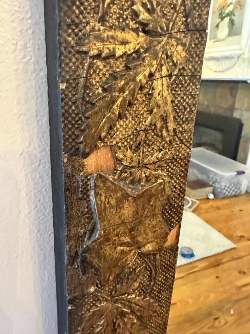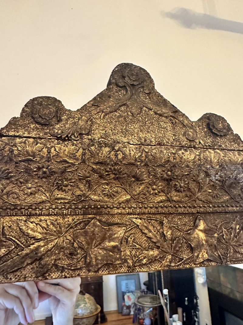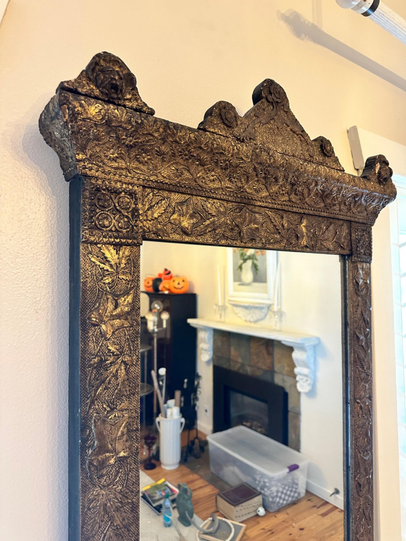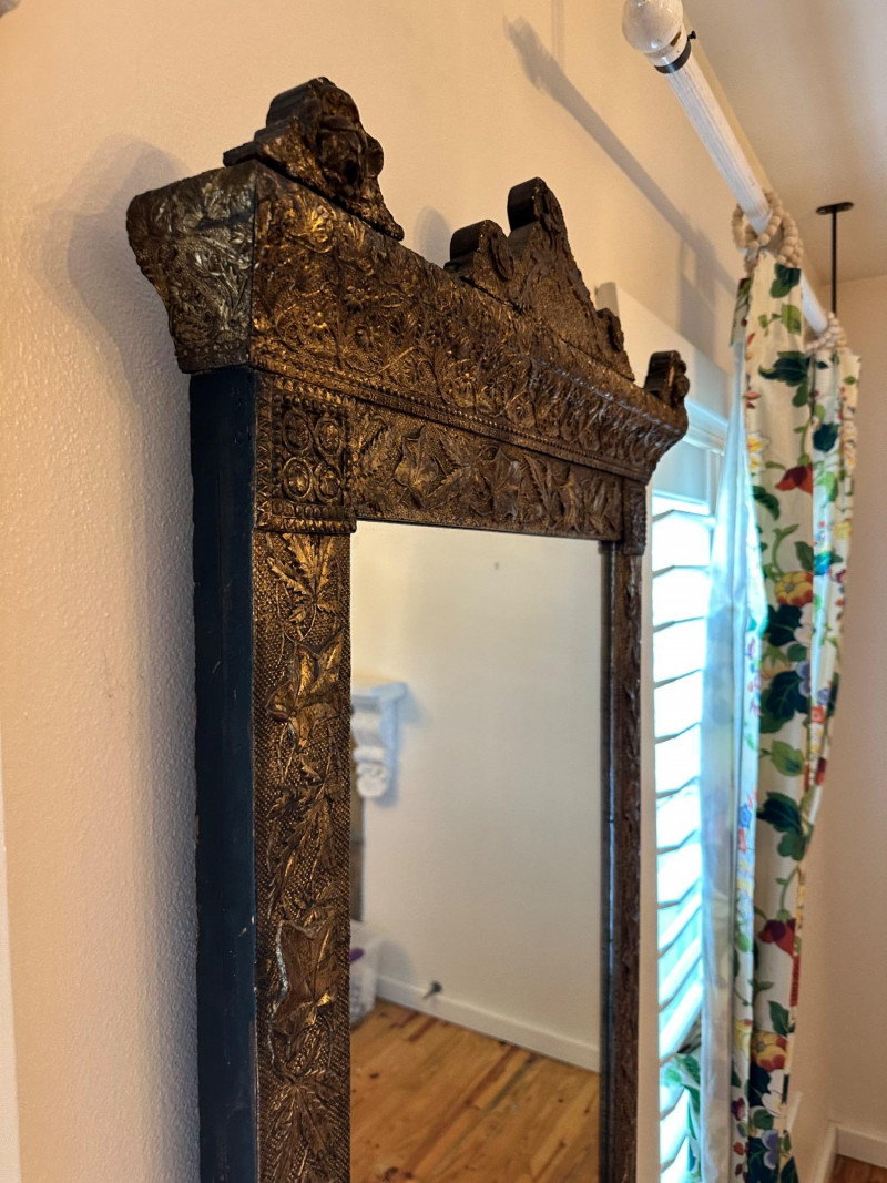 Vintage Embossed Gilt Frame Wall Mirror – 51" x 27" Tall rectangular wall mirror featuring an ornate embossed frame with floral and foliate designs. The raised crest includes rosettes and scrolling patterns, while the body displays detailed leaf and flower motifs. The frame is likely wood with gesso and a gilt finish. Details: Overall Dimensions: 51" H x 27" W Materials: Wood base with gesso and gilded surface Design: Embossed floral, leaf, and scroll patterns with a shaped crest Condition: