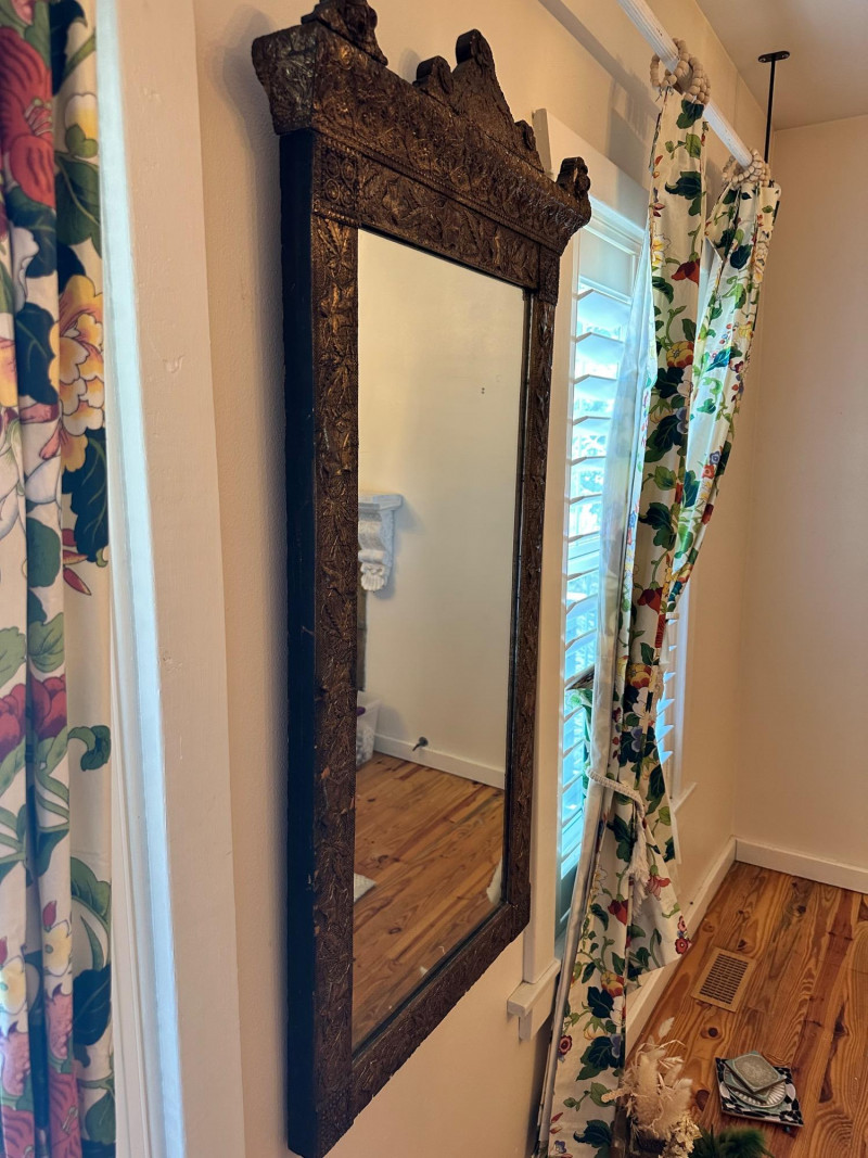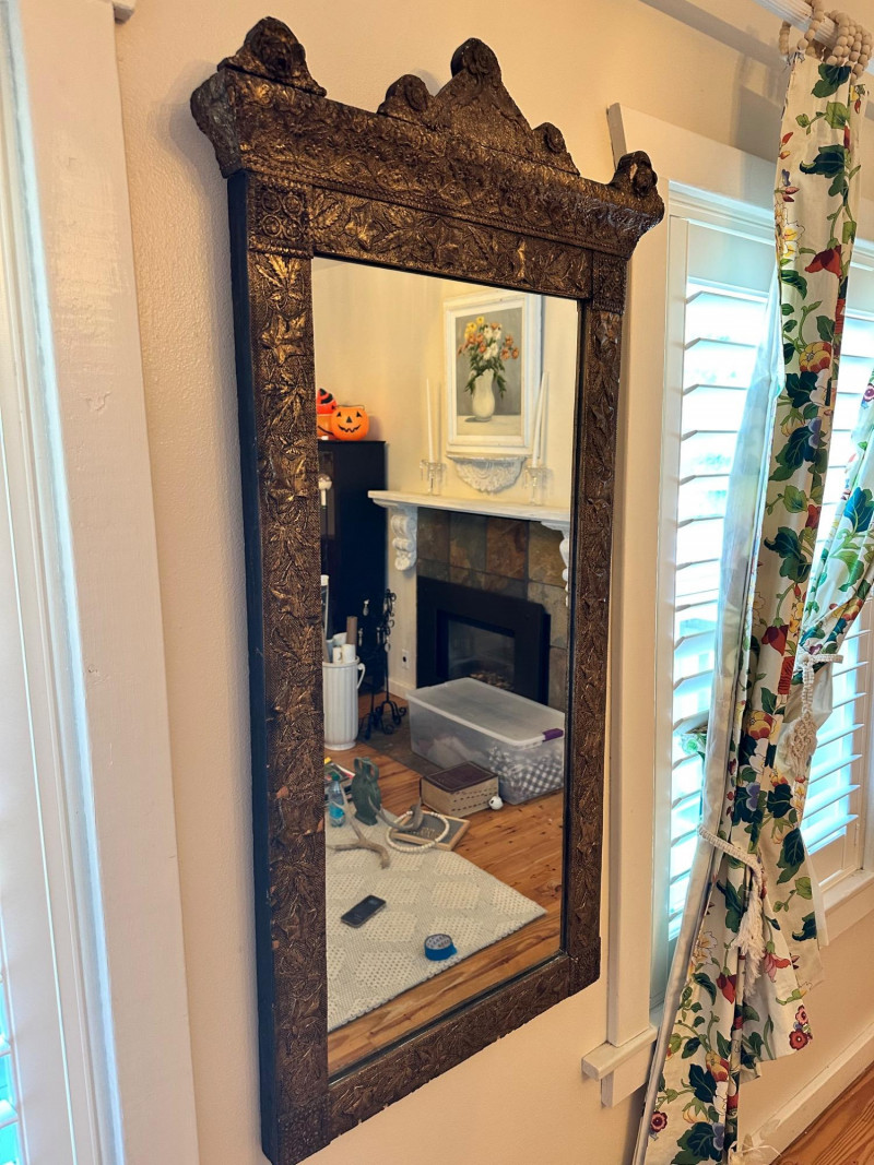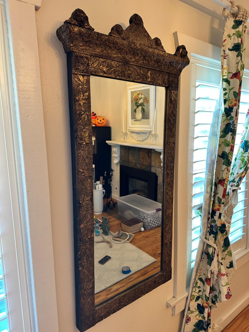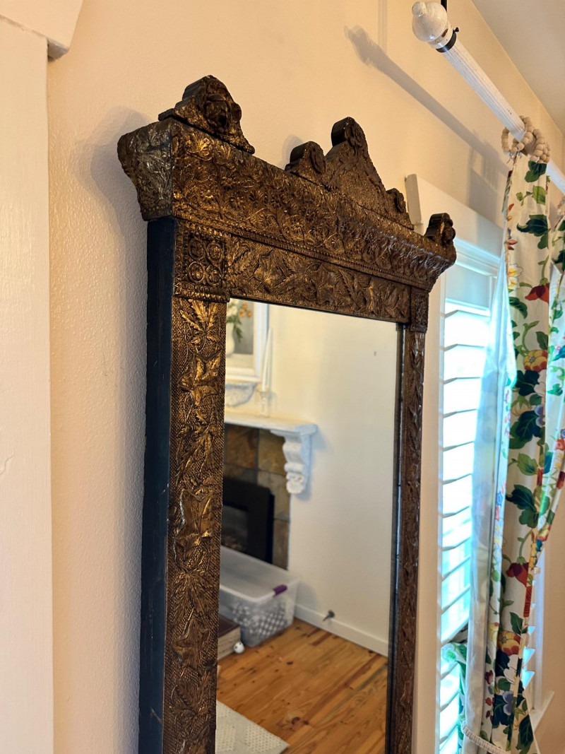 Vintage Embossed Gilt Frame Wall Mirror – 51" x 27" Tall rectangular wall mirror featuring an ornate embossed frame with floral and foliate designs. The raised crest includes rosettes and scrolling patterns, while the body displays detailed leaf and flower motifs. The frame is likely wood with gesso and a gilt finish. Details: Overall Dimensions: 51" H x 27" W Materials: Wood base with gesso and gilded surface Design: Embossed floral, leaf, and scroll patterns with a shaped crest Condition: