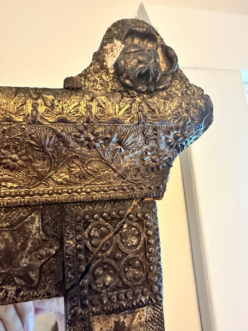 Visible cracking and loss to the gesso and gilt surface, particularly in corners and along edges. Please refer to photos for condition.