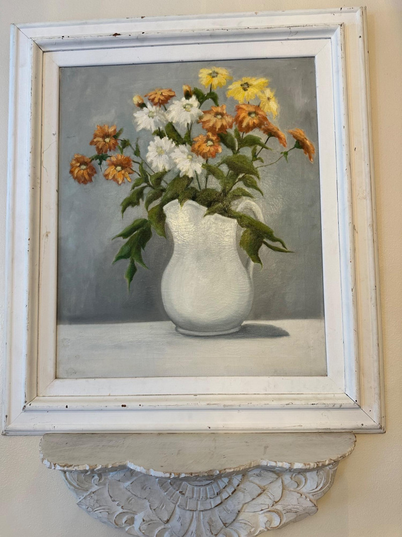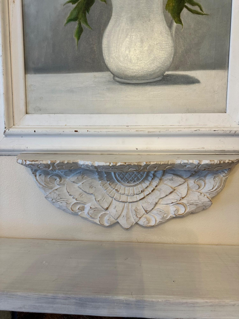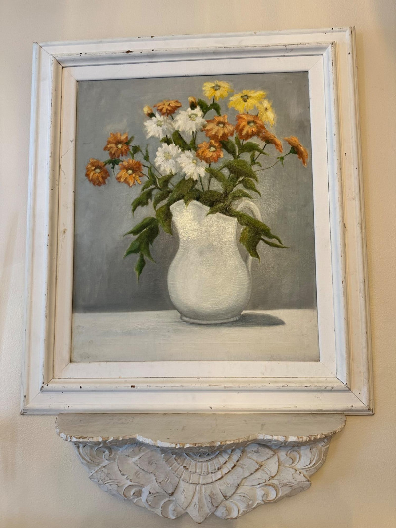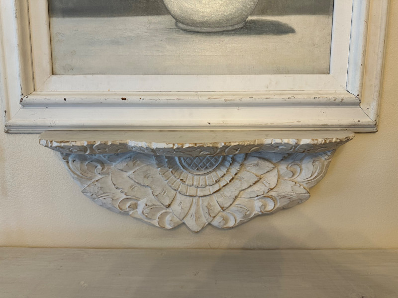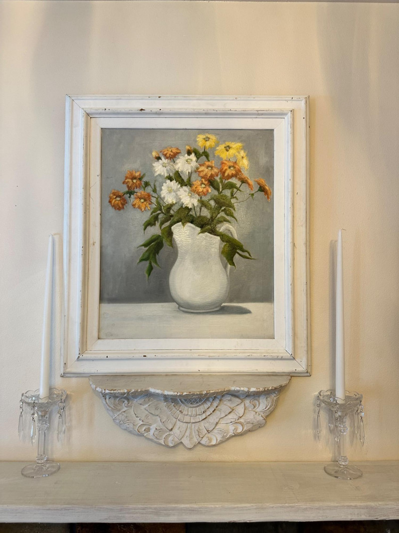 Floral Still Life, Glass Candlesticks with Crystal Prisms & Wall Shelf Wall-mounted display featuring a framed floral still life painting, a pair of glass candlesticks, and an ornate wall shelf. The painting shows orange, yellow, and white flowers in a white pitcher, set in a distressed white wood frame. The clear pressed glass candlesticks are designed for taper candles and adorned with hanging crystal-style prisms. All components share coordinating tones for a cohesive presentation. Measurements: Painting (with frame): 31.5" H x 27" W Candlesticks: 8" H Shelf: 21" W x 6" T