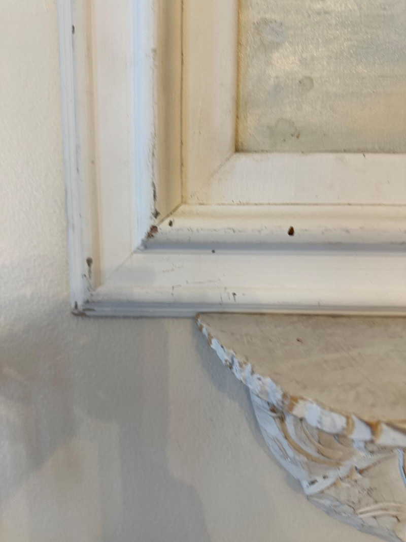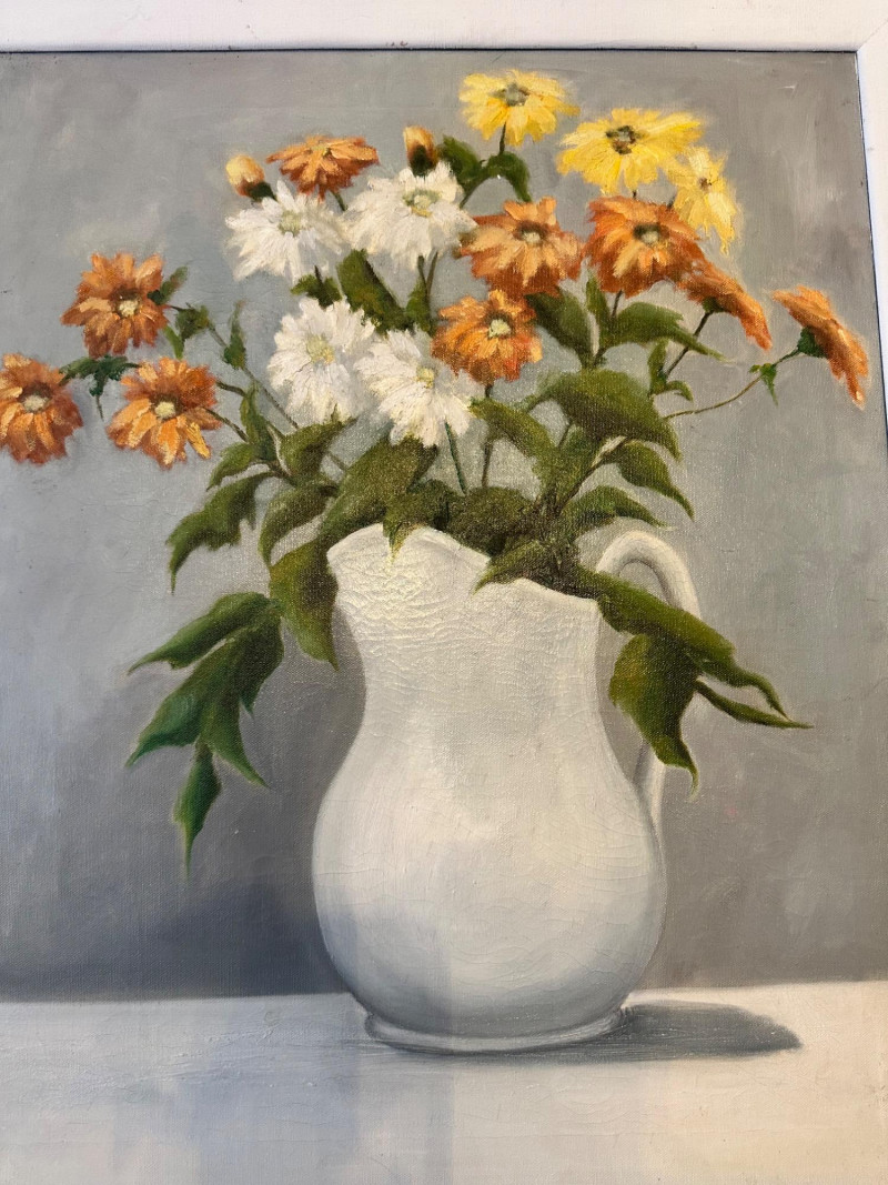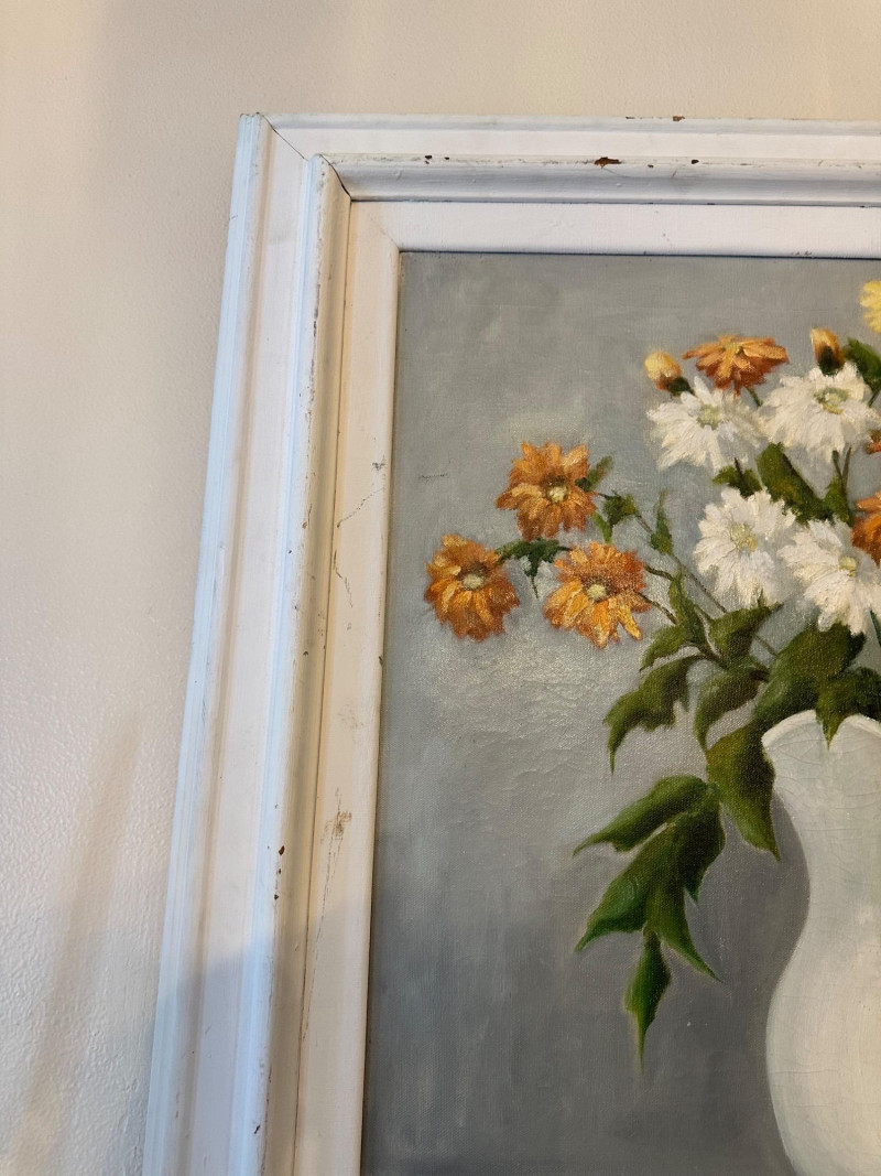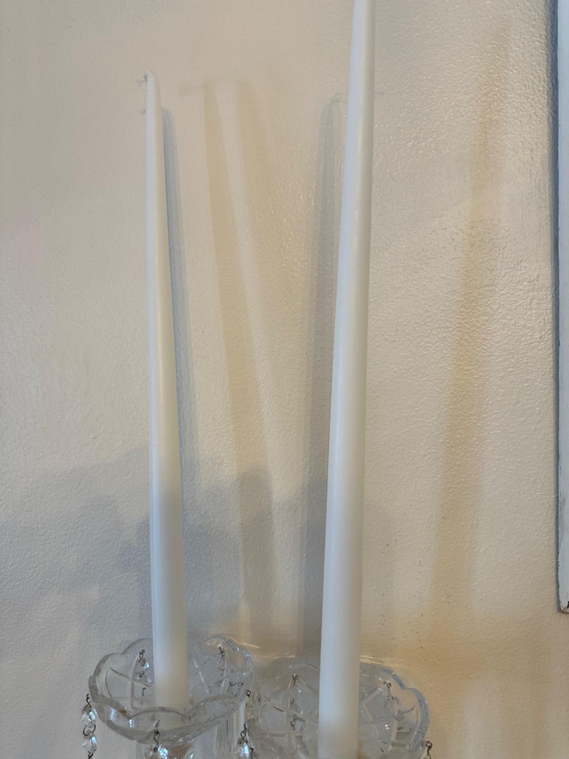 Floral Still Life, Glass Candlesticks with Crystal Prisms & Wall Shelf Wall-mounted display featuring a framed floral still life painting, a pair of glass candlesticks, and an ornate wall shelf. The painting shows orange, yellow, and white flowers in a white pitcher, set in a distressed white wood frame. The clear pressed glass candlesticks are designed for taper candles and adorned with hanging crystal-style prisms. All components share coordinating tones for a cohesive presentation. Measurements: Painting (with frame): 31.5" H x 27" W Candlesticks: 8" H Shelf: 21" W x 6" T