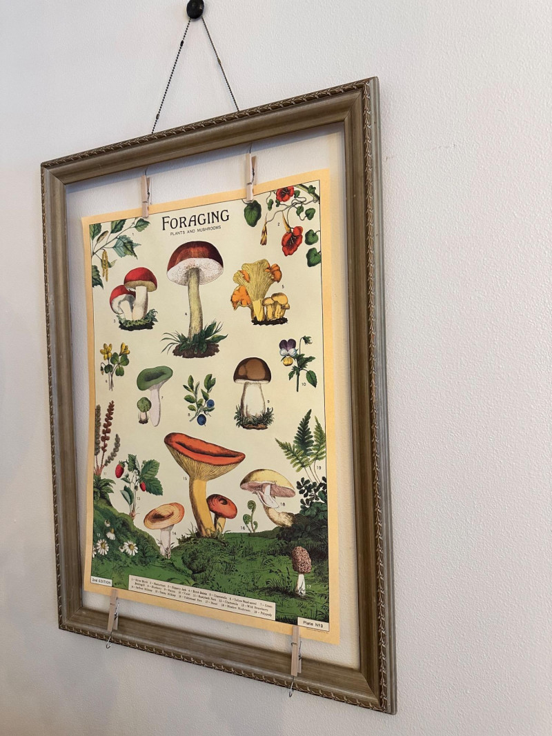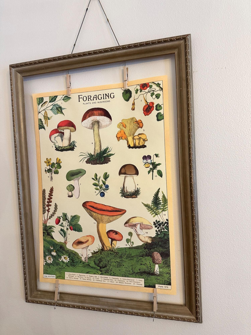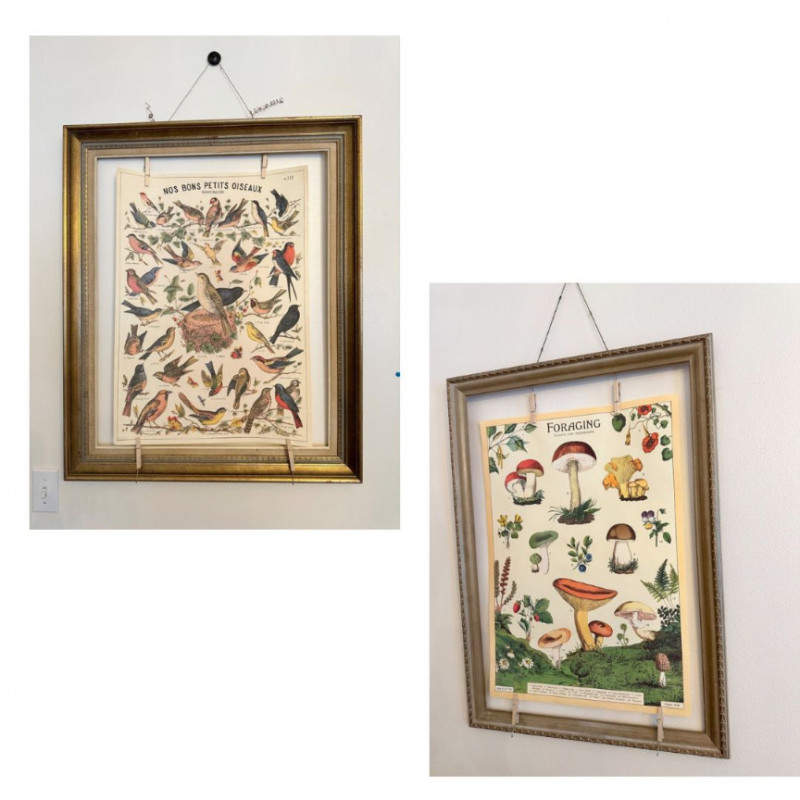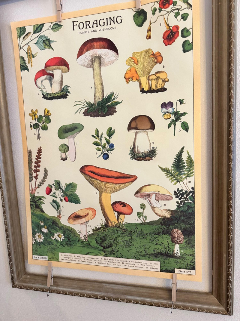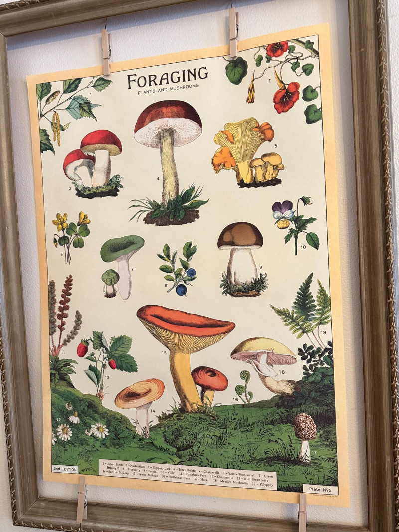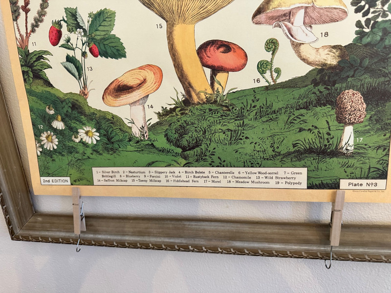 Framed Foraging & Bird Natural History Prints Pair of vintage-style natural history prints displayed in clip-mounted wood frames. One print, titled Foraging: Plants and Mushrooms, features detailed illustrations of edible mushrooms, herbs, and plants, labeled with names such as Chanterelle, Slippery Jack, and Wild Strawberry. The second print, Nos Bons Petits Oiseaux, depicts a variety of European songbirds with French labels, including Le Rouge-Gorge and La Mésange Bleue. Both are printed on aged-look paper and framed under glass with metal hanging chains. Measurements: